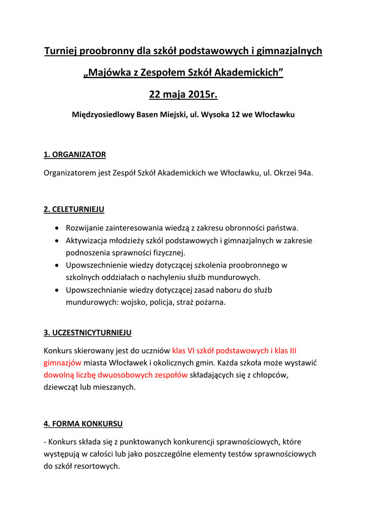 Turniej proobronny dla szkół podstawowych i gimnazjalnych „Majówka z Zespołem Szkół Akademickich” 22 maja 2015r. Międzyosiedlowy Basen Miejski, ul. Wysoka 12 we Włocławku 1. ORGANIZATOR Organizatorem jest Zespół Szkół Akademickich we Włocławku, ul. Okrzei 94a. 2. CELETURNIEJU • Rozwijanie zainteresowania wiedzą z zakresu obronności państwa. • Aktywizacja młodzieży szkól podstawowych i gimnazjalnych w zakresie podnoszenia sprawności fizycznej. • Upowszechnienie wiedzy dotyczącej szkolenia proobronnego w szkolnych oddziałach o nachyleniu służb mundurowych. • Upowszechnianie wiedzy dotyczącej zasad naboru do służb mundurowych: wojsko, policja, straż pożarna. 3. UCZESTNICYTURNIEJU Konkurs skierowany jest do uczniów klas VI szkół podstawowych i klas III gimnazjów miasta Włocławek i okolicznych gmin. Każda szkoła może wystawić dowolną liczbę dwuosobowych zespołów składających się z chłopców, dziewcząt lub mieszanych. 4. FORMA KONKURSU - Konkurs składa się z punktowanych konkurencji sprawnościowych, które występują w całości lub jako poszczególne elementy testów sprawnościowych do szkół resortowych. - Nadzór i punktacja w przeprowadzonych konkurencjach jest ze strony nauczycieli i trenerów ZSA. - Konkurencje i pokaz wzorowego wykonania przygotowują uczniowie klas mundurowych ZSA – laureaci Ogólnopolskiego Turnieju Klas Mundurowych pod patronatem Pełnomocnika MON ds. Społecznych Inicjatyw Proobronnych gen. dyw. prof. Bogusława Packa. • • • • • • konkurencja „Pałkiewicz”, konkurencja „uwolnienie zakładnika” konkurencja „ pierwsza pomoc przedmedyczna” konkurencja „przepustka do Gromu” konkurencja „mokra robota” konkurencja „Rambo III” Rejestracja drużyn telefonicznie: 668 456 080 p. Witold Filipski, 660 716 609 sekretariat ZSA lub w dniu turnieju na miejscu zawodów: Międzyosiedlowy Basen Miejski ul. Wysoka 12 we Włocławku, 22maja 2015. - strój sportowy lub „moro” oraz kąpielówki i czepek. 5. WYMAGANIA • zgoda rodziców lub opiekunów prawnych na udział w Turnieju • umiejętność pływania przez jednego z zawodników 6. PROGRAM TURNIEJU • od godz. 11.00 – rejestracja drużyn, przydzielenie numerów startowych zapoznanie z zasadami BHP konkurencji. • godz. 12.00 - rozpoczęcie Turnieju. • godz. 16.00 - ogłoszenie wynikówi zakończenie Turnieju W czasie trwania turnieju odbędą się inne konkurencje, gry i zabawy: • • • • • • • gry i zabawy z piłkarzami klubu sportowego „LIDER” gry i zabawy z najlepszymi koszykarkami z Włocławka gry i zabawy z wioślarzami Włocławskiego Towarzystwa Wioślarskiego gry i zabawy z ośrodkiem szkolenia sporów motorowodnych „ELMARKO” gry i zabawy sportów walki – klub bokserski „START” gry i zabawy na terenie Parku Linowego – przy Basenie. gry i zabawy z funkcjonariuszami Policji 7. NAGRODY Organizator zapewnia nagrody: • dla najlepszej gimnazjalnej drużyny klas III – wyjazd na obóz szkoleniowy z uczniami ZSA do ośrodka szkolenia wojsk desantowo-szturmowych oraz dofinansowanie do umundurowania i wyposażenia po podjęciu nauki w liceum ZSA w klasie mundurowej. • dla najlepszej drużyny ze szkół podstawowych klas VI - dofinansowanie do umundurowania i wyposażenia po podjęciu nauki w gimnazjum ZSA w klasie mundurowej oraz dofinansowanie do egzaminu państwowego na patent sternika motorowodnego po ukończeniu 14 lat. • nagrody rzeczowe i dyplomy dla uczestników w poszczególnych konkurencjach Majówki z ZSA. 8. KONTAKT i informacje • Witold Filipski, tel. 668 456 080 • sekretariat ZSA, tel. 660 716 609 Dla wszystkich uczestników „Majówki z ZSA”: • ognisko z pieczeniem kiełbasek oraz wojskowa grochówka • występ artystyczny lidera zespołu HIP-HOP – Macieja Kasińskiego Tego jeszcze nie było we Włocławku! ZSA kształtuje mistrzów! Wszystkich zainteresowanych zapraszamy do uczestnictwa oraz kibicowania.