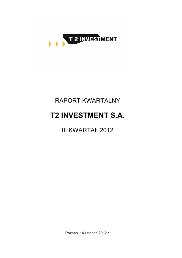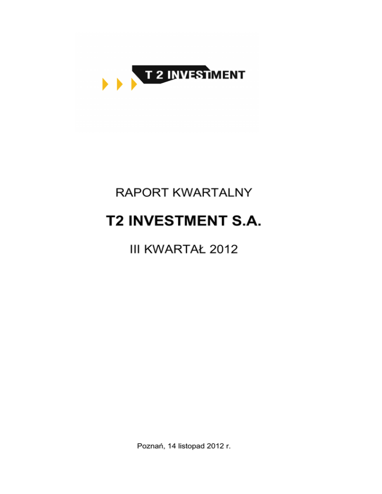 RAPORT KWARTALNY T2 INVESTMENT S.A. III KWARTAŁ 2012 Poznań, 14 listopad 2012 r. Spis treści: 1. INFORMACJE OGÓLNE ..........………………………………………………………2 1.1. Podstawowe informacje o spółce …..........……………………………………..2 1.2. Struktura akcjonariatu Emitenta …………………………..........……………….2 1.3. Stanowisko Zarządu odnośnie możliwości zrealizowania prognoz ...............3 2. DANE FINANSOWE ..…………………………………………………………….......3 2.1. Wybrane dane finansowe za okres od 1.07.2012 roku do 30.09.2012 roku …...........…………………………………………………………………............3 2.2. Opis czynników i zdarzeń, mających wpływ na wyniki finansowe osiągnięte przez Emitenta ...………………………………………………...........................4 3. INFORMACJE DOTYCZĄCE AKTYWNOŚCI EMITENTA W III KWARTALE 2012 ROKU ...…………………………………………………………………….........4 1 1. INFORMACJE OGÓLNE 1.1. Podstawowe informację o spółce Firma: Siedziba: Telefon: Fax: Strona www: KRS: REGON: NIP: Skład Zarządu: T2 Investment S.A. Poznań 60-476, ul. Jasielska 16a 61 66 48 000 61 66 48 029 www.t2investment.pl 0000276511 639525179 7822089018 Tomasz Tyliński – Prezes Zarządu 1.2. Struktura akcjonariatu Emitenta na dzień sporządzenia raportu za III kw. 2012 roku Lp. Nazwisko imię akcjonariusza / firma Liczba akcji Liczba głosów Udział w ogólnej liczbie akcji Udział w ogólnej liczbie głosów 1. Tomasz Tyliński 1.975.249 1.975.249 32,12% 32,12% 2. Beata Schmidt-Tylińska 900.000 900.00 14,63% 14,63% 3. BLUMERANG S.A wraz z BLUMERANG INVESTORS S.A. 581.417 581.417 9,5% 9,5% 4. INVESTCON GROUP S.A. 1.332.000 1.332.000 21,65% 21,65% 5. Pozostali Akcjonariusze posiadający <5% 1.361.334 1.361.334 22,1% 22,1% 6.150.000 100% 100% SUMA 6.150.000 2 1.3. Stanowisko Zarządu odnośnie możliwości zrealizowania prognoz. Emitent nie publikował prognoz wyników finansowych. Na dzień sporządzenie niniejszego raportu Emitent nie tworzy, ani nie wchodzi w skład grupy kapitałowej. 2. DANE FINANSOWE 2.1. Wybrane dane finansowe za okres od 1.07.2012 roku do 30.09.2012 roku Wybrane jednostkowe dane finansowe Stan na 30.09.2012 r. (zł.) Stan na 30.09.2011 r. (zł.) Kapitały własne 20 028 865,72 21 662 506,58 Należności długoterminowe 0,00 0,00 Należności krótkoterminowe 2 809 070,60 2 668 373,32 418 018,01 1 234 325,83 Zobowiązania długoterminowe 0,00 48 872,22 Zobowiązania krótkoterminowe 597 898,22 683 241,88 III kwartał od 01.07.2012 do 30.09.2012 (zł.) III kwartał od 01.07.2011 do 30.09.2011 (zł.) 3 kwartały od 01.01.2012 do 30.09.2012 (zł.) 3 kwartały od 01.01.2011 do 30.09.2011 (zł.) Amortyzacja 52 805,01 53 087,52 158 663,80 175,158.12 Przychody netto ze sprzedaży 247 931,90 206 394,29 789 837,09 627,999.52 Zysk/strata na sprzedaży -281 841,44 -236 345,14 -638 777,72 -663,446.77 Zysk/Strata na działalności operacyjnej -285 762,80 -219 556,03 -617 295,07 -360,606.09 Zysk/Starta brutto 131 101,09 -2 913 537,63 -742 741,31 -2,217,214.59 Zysk/Starta netto 46 725,09 -2 412 703,63 -538 377,31 -1,856,398.59 Środki pienieżne i inne aktywa pieniężne Wybrane jednostkowe dane finansowe 3 2.2. Opis czynników i zdarzeń, mających wpływ na wyniki finansowe osiągnięte przez Emitenta W III kwartale 2012 roku przychody netto ze sprzedaży ukształtowały się na poziomie 250 tys. Przychody ze sprzedaży pochodzą w całości z czynszów najmu powierzchni biurowych i magazynowych. Poziom ten utrzymuje się od kilku kwartałów. Nieruchomości przeznaczone na wynajem nadal posiadają znaczny potencjał wzrostowy, przede wszystkim z punktu widzenia zwiększenia przychodów z tego rodzaju działalności. Wynika to w szczególności z przeprowadzonej wcześniej modernizacji i adaptacji nieruchomości położonej przy ul. Jasielskiej w Poznaniu, której właścicielem jest obecnie spółka w 100% zależna od Emitenta (T2 Jasielska Sp. z o.o.). Emitent nie konsoliduje sprawozdań finansowych ze Spółką T2 Jasielska Sp. z o.o. (100% zależna od Emitenta), której przychody z wynajmu powierzchni biurowej w trzech kwartałach 2012 roku ukształtowały się na poziomie 368.787,70 zł, a zysk netto na poziomie 96.620,45 zł. W odniesieniu do powyższej nieruchomości Spółka w III kwartale została kolejne umowy najmu oraz kontynuuje działania zmierzające do wynajęcia powierzchni biurowych, co w najbliższym czasie powinno spowodować dalszy wzrost przychodów z tytułu działalności prowadzonej przez Emitenta w tym zakresie. Zysk brutto za III kwartał wyniósł ponad 131 tyś. Zł. Ponadto Emitent w III kwartale 2012 roku zmniejszył zangażowanie w spółkę PBO Anioła S.A poniżej 5% w ogólnej liczbie głosów oraz nabył pakiet akcji Blumerang Investors S.A. dający 15,98% w ogólnej liczbie głosów. 3. INFORMACJE DOTYCZĄCE AKTYWNOŚCI EMITENTA W III KWARTALE 2012 ROKU W III kwartale 2012 roku Emitent skoncentrował się na intensywnym poszukiwaniu kolejnych interesujących nieruchomości w celach inwestycyjnych, a także powziął szereg działań zmierzających do zbycia nieruchomości inwestycyjnych posiadanych w portfelu. Zgodnie z przyjętą strategią, Emitent poszukuje również możliwości inwestycji kapitałowych, zarówno w spółki z branży budowlanej i nieruchomościowej, a także w interesujące przedsięwzięcia z innych sektorów. Tomasz Tyliński Prezes Zarządu 4