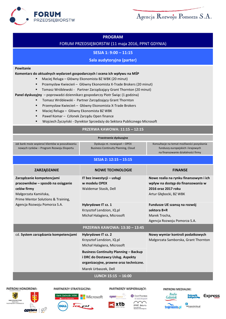 PROGRAM FORUM PRZEDSIĘBIORSTW (11 maja 2016, PPNT GDYNIA) SESJA 1