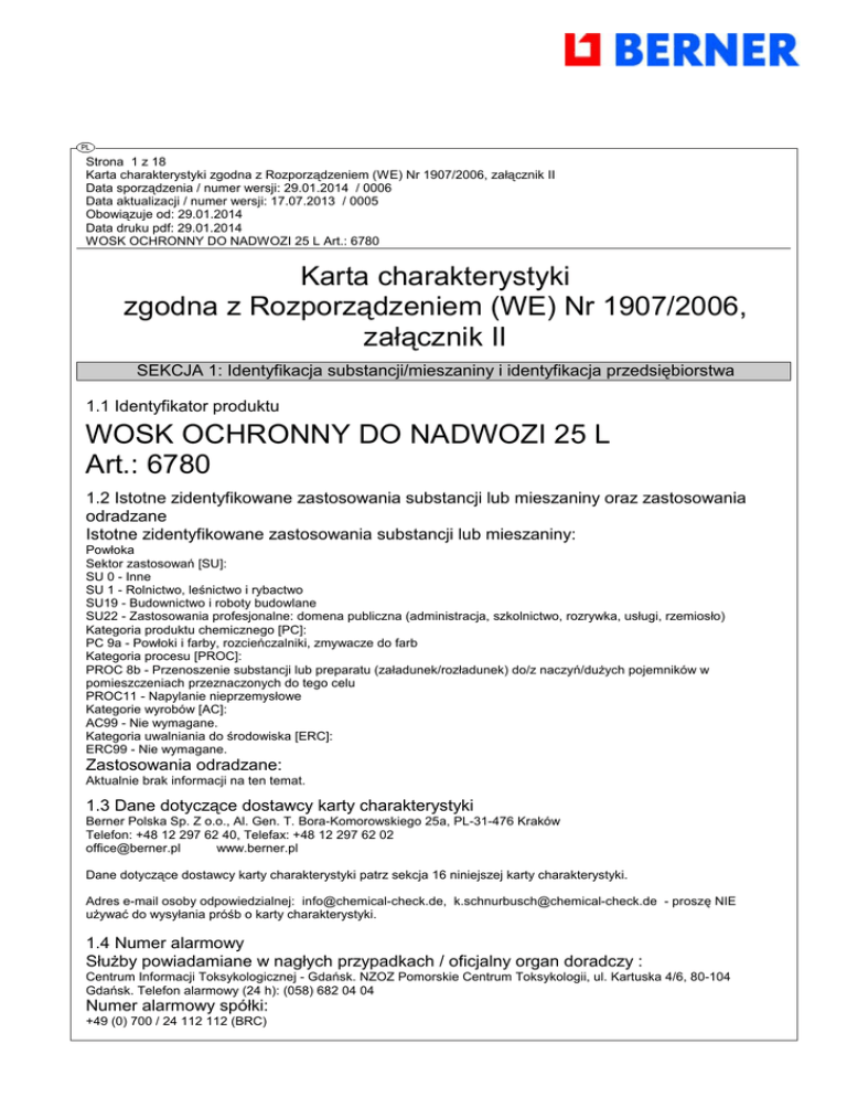 Strona 1 z 18 Karta charakterystyki zgodna z Rozporządzeniem (WE) Nr 1907/2006, załącznik II Data sporządzenia / numer wersji: 29.01.2014 / 0006 Data aktualizacji / numer wersji: 17.07.2013 / 0005 Obowiązuje od: 29.01.2014 Data druku pdf: 29.01.2014 WOSK OCHRONNY DO NADWOZI 25 L Art.: 6780 Karta charakterystyki zgodna z Rozporządzeniem (WE) Nr 1907/2006, załącznik II SEKCJA 1: Identyfikacja substancji/mieszaniny i identyfikacja przedsiębiorstwa 1.1 Identyfikator produktu WOSK OCHRONNY DO NADWOZI 25 L Art.: 6780 1.2 Istotne zidentyfikowane zastosowania substancji lub mieszaniny oraz zastosowania odradzane Istotne zidentyfikowane zastosowania substancji lub mieszaniny: Powłoka Sektor zastosowań [SU]: SU 0 - Inne SU 1 - Rolnictwo, leśnictwo i rybactwo SU19 - Budownictwo i roboty budowlane SU22 - Zastosowania profesjonalne: domena publiczna (administracja, szkolnictwo, rozrywka, usługi, rzemiosło) Kategoria produktu chemicznego [PC]: PC 9a - Powłoki i farby, rozcieńczalniki, zmywacze do farb Kategoria procesu [PROC]: PROC 8b - Przenoszenie substancji lub preparatu (załadunek/rozładunek) do/z naczyń/dużych pojemników w pomieszczeniach przeznaczonych do tego celu PROC11 - Napylanie nieprzemysłowe Kategorie wyrobów [AC]: AC99 - Nie wymagane. Kategoria uwalniania do środowiska [ERC]: ERC99 - Nie wymagane. Zastosowania odradzane: Aktualnie brak informacji na ten temat. 1.3 Dane dotyczące dostawcy karty charakterystyki Berner Polska Sp. Z o.o., Al. Gen. T. Bora-Komorowskiego 25a, PL-31-476 Kraków Telefon: +48 12 297 62 40, Telefax: +48 12 297 62 02 [email protected] www.berner.pl Dane dotyczące dostawcy karty charakterystyki patrz sekcja 16 niniejszej karty charakterystyki. Adres e-mail osoby odpowiedzialnej: [email protected], [email protected] - proszę NIE używać do wysyłania próśb o karty charakterystyki. 1.4 Numer alarmowy Służby powiadamiane w nagłych przypadkach / oficjalny organ doradczy : Centrum Informacji Toksykologicznej - Gdańsk. NZOZ Pomorskie Centrum Toksykologii, ul. Kartuska 4/6, 80-104 Gdańsk. Telefon alarmowy (24 h): (058) 682 04 04 Numer alarmowy spółki: +49 (0) 700 / 24 112 112 (BRC) Strona 2 z 18 Karta charakterystyki zgodna z Rozporządzeniem (WE) Nr 1907/2006, załącznik II Data sporządzenia / numer wersji: 29.01.2014 / 0006 Data aktualizacji / numer wersji: 17.07.2013 / 0005 Obowiązuje od: 29.01.2014 Data druku pdf: 29.01.2014 WOSK OCHRONNY DO NADWOZI 25 L Art.: 6780 SEKCJA 2: Identyfikacja zagrożeń 2.1 Klasyfikacja substancji lub mieszaniny 2.1.1 Klasyfikacja zgodnie z rozporządzeniem (WE) Nr 1272/2008 (CLP) Klasa Kategoria Zwrot określający zagrożenie zagrożenia zagrożenia Flam. Liq. 3 H226-Łatwopalna ciecz i pary. Asp. Tox. 1 H304-Połknięcie i dostanie się przez drogi oddechowe może grozić śmiercią. STOT SE 3 H336-Może wywoływać uczucie senności lub zawroty głowy. Aquatic Chronic 3 H412-Działa szkodliwie na organizmy wodne, powodując długotrwałe skutki. 2.1.2 Klasyfikacja zgodnie z dyrektywami 67/548/EWG oraz 1999/45/WE (łącznie ze zmianami) Łatwopalny, R10 Produkt niebezpieczny dla środowiska, R52-53 Xn, Produkt szkodliwy, R65 R67 2.2 Elementy oznakowania 2.2.1 Oznakowanie zgodnie z rozporządzeniem (WE) Nr 1272/2008 (CLP) Niebezpieczeństwo Zwrot określający zagrożenie H226-Łatwopalna ciecz i pary. H304-Połknięcie i dostanie się przez drogi oddechowe może grozić śmiercią. H336-Może wywoływać uczucie senności lub zawroty głowy. H412-Działa szkodliwie na organizmy wodne, powodując długotrwałe skutki. Zapobieganie P210-Przechowywać z dala od źródeł ciepła, gorących powierzchni, źródeł iskrzenia, otwartego ognia i innych źródeł zapłonu. Nie palić. P261-Unikać wdychania pary i rozpylonej cieczy. Reagowanie P301+P310+P331-W PRZYPADKU POŁKNIĘCIA: natychmiast skontaktować się z OŚRODKIEM ZATRUĆ/lekarzem. NIE wywoływać wymiotów. P312-W przypadku złego samopoczucia skontaktować się z OŚRODKIEM ZATRUĆ/lekarzem. Destylaty lekkie obrabiane wodorem (ropa naftowa) Węglowodory, C9-C10, n-alkanay, izoalkany, cykloalkany, < 2% związki aromatyczne Strona 3 z 18 Karta charakterystyki zgodna z Rozporządzeniem (WE) Nr 1907/2006, załącznik II Data sporządzenia / numer wersji: 29.01.2014 / 0006 Data aktualizacji / numer wersji: 17.07.2013 / 0005 Obowiązuje od: 29.01.2014 Data druku pdf: 29.01.2014 WOSK OCHRONNY DO NADWOZI 25 L Art.: 6780 2.3 Inne zagrożenia Mieszanina nie zawiera substancji vPvB (PBT = very persistent, very bioaccumulative) bądź nie jest wykazana w załączniku XIII rozporządzenia (WE) 1907/2006. Mieszanina nie zawiera substancji PBT (PBT = persistent, bioaccumulative, toxic) bądź nie jest wykazana w załączniku XIII rozporządzenia (WE) 1907/2006. SEKCJA 3: Skład/informacja o składnikach rozpuszczalnik substancja dodatkowa 3.1 Substancja n.s. 3.2 Mieszanina Węglowodory, C9-C10, n-alkanay, izoalkany, cykloalkany, < 2% związki aromatyczne Numer rejestracji (REACH) Index EINECS, ELINCS, NLP CAS Stęż.% Klasyfikacja zgodnie z dyrektywą 67/548/EWG Klasyfikacja zgodnie z rozporządzeniem (WE) Nr 1272/2008 (CLP) Destylaty lekkie obrabiane wodorem (ropa naftowa) Numer rejestracji (REACH) Index EINECS, ELINCS, NLP CAS Stęż.% Klasyfikacja zgodnie z dyrektywą 67/548/EWG Klasyfikacja zgodnie z rozporządzeniem (WE) Nr 1272/2008 (CLP) 01-2119471843-32-XXXX --927-241-2 (REACH-IT List-No.) CAS --50-70 Łatwopalny, R10 Produkt niebezpieczny dla środowiska, R52-53 Produkt szkodliwy, Xn, R65 R66 R67 Flam. Liq. 3, H226 Asp. Tox. 1, H304 STOT SE 3, H336 Aquatic Chronic 3, H412 -649-422-00-2 265-149-8 CAS 64742-47-8 10-30 Łatwopalny, R10 Produkt szkodliwy, Xn, R65 R66 R67 Flam. Liq. 3, H226 Asp. Tox. 1, H304 STOT SE 3, H336 Tekst formuł R i H, a także ich kod klasyfikacji (GHS/CLP) patrz sekcja 16. SEKCJA 4: Środki pierwszej pomocy 4.1 Opis środków pierwszej pomocy Drogi oddechowe Osobę usunąć z zagrożonej strefy. Osobie zapewnić dopływ świ