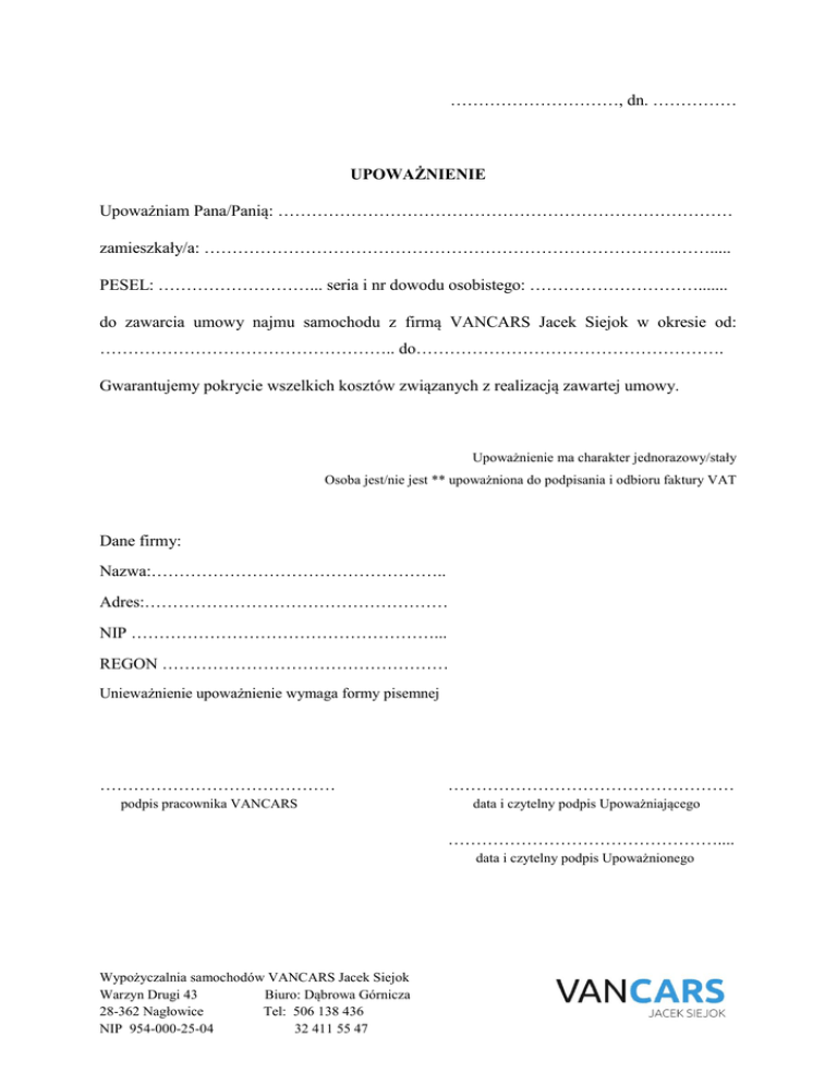 …………………………, dn. …………… UPOWAŻNIENIE Upoważniam Pana/Panią: ……………………………………………………………………… zamieszkały/a: ………………………………………………………………………………..... PESEL: ………………………... seria i nr dowodu osobistego: …………………………....... do zawarcia umowy najmu samochodu z firmą VANCARS Jacek Siejok w okresie od: …………………………………………….. do………………………………………………. Gwarantujemy pokrycie wszelkich kosztów związanych z realizacją zawartej umowy. Upoważnienie ma charakter jednorazowy/stały Osoba jest/nie jest ** upoważniona do podpisania i odbioru faktury VAT Dane firmy: Nazwa:…………………………………………….. Adres:……………………………………………… NIP ………………………………………………... REGON …………………………………………… Unieważnienie upoważnienie wymaga formy pisemnej …………………………………… podpis pracownika VANCARS …………………………………………… data i czytelny podpis Upoważniającego ………………………………………….... data i czytelny podpis Upoważnionego Wypożyczalnia samochodów VANCARS Jacek Siejok Warzyn Drugi 43 Biuro: Dąbrowa Górnicza 28-362 Nagłowice Tel: 506 138 436 NIP 954-000-25-04 32 411 55 47