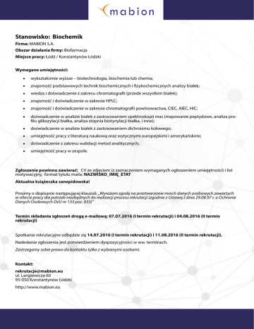 Stanowisko: Biochemik Firma: MABION S.A. Obszar działania firmy: Biofarmacja Miejsce pracy: Łódź / Konstantynów Łódzki Wymagane umiejętności: • wykształcenie wyższe – biotechnologia, biochemia lub chemia; • znajomość podstawowych technik biochemicznych i fizykochemicznych analizy białek; • wiedza i doświadczenie z zakresu chromatografii (przede wszystkim białek); • znajomość i doświadczenie w zakresie HPLC; • znajomość i doświadczenie w zakresie chromatografii powinowactwa, CIEC, AIEC, HIC; • doświadczenie w analizie białek z zastosowaniem spektroskopii mas (mapowanie peptydowe, analiza profilu glikozylacji białka, analiza stopnia biotynylacji białka, i inne); • doświadczenie w analizie białek z zastosowaniem dichroizmu kołowego; • umiejętność pracy z literaturą naukową oraz wytycznymi europejskimi i amerykańskimi; • doświadczenie z zakresu walidacji metod analitycznych; • umiejętność pracy w zespole. Zgłoszenie powinno zawierać: CV ze zdjęciem (z zaznaczeniem wymaganych ogłoszeniem umiejętności) i list motywacyjny, format tytułu maila: NAZWISKO_IMIĘ_ETAT Aktualna książeczka sanepidowska! Prosimy o dopisanie następującej klauzuli: „Wyrażam zgodę na przetwarzanie moich danych osobowych zawartych w ofercie pracy dla potrzeb niezbędnych do realizacji procesu rekrutacji (zgodnie z Ustawą z dnia 29.08.97 r. o Ochronie Danych Osobowych DzU nr 133 poz. 833)” Termin składania zgłoszeń drogą e-mailową: 07.07.2016 (I termin rekrutacji) i 04.08.2016 (II termin rekrutacji) Spotkanie rekrutacyjne odbędzie się 14.07.2016 (I termin rekrutacji) i 11.08.2016 (II termin rekrutacji). Nadesłanie zgłoszenia jest potwierdzeniem dyspozycyjności w ww. terminach. Zastrzegamy sobie prawo do kontaktu tylko z wybranymi osobami. Kontakt: [email protected] ul. Langiewicza 60 95-050 Konstantynów Łódzki http://www.mabion.eu