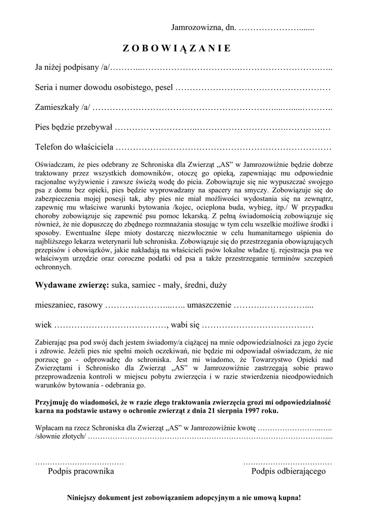 Zobowiązanie adopcyjne - Schronisko dla Zwierząt "AS" w