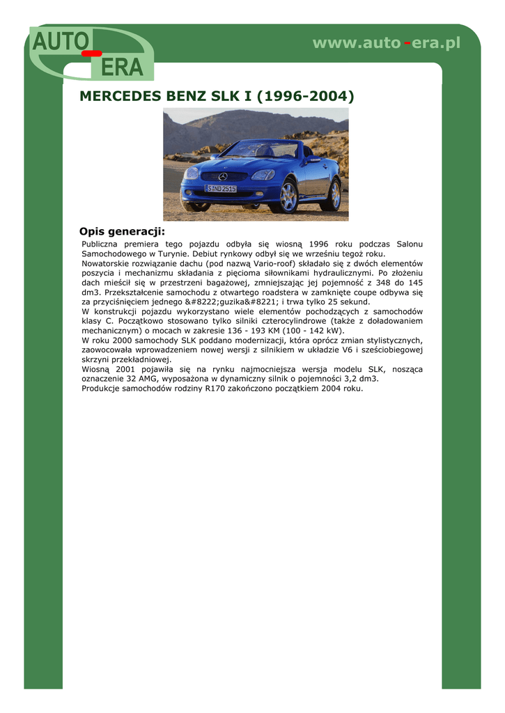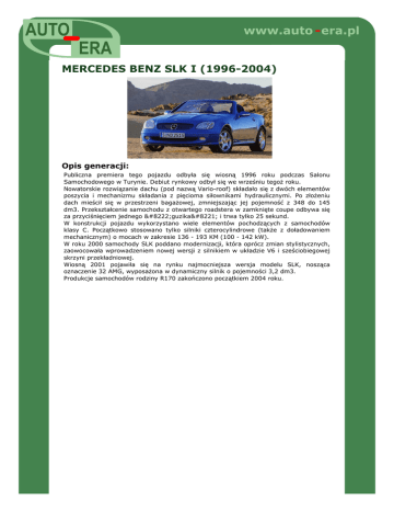 www.auto - era.pl MERCEDES BENZ SLK I (1996-2004) Opis generacji: Publiczna premiera tego pojazdu odbyła się wiosną 1996 roku podczas Salonu Samochodowego w Turynie. Debiut rynkowy odbył się we wrześniu tegoż roku. Nowatorskie rozwiązanie dachu (pod nazwą Vario-roof) składało się z dwóch elementów poszycia i mechanizmu składania z pięcioma siłownikami hydraulicznymi. Po złożeniu dach mieścił się w przestrzeni bagażowej, zmniejszając jej pojemność z 348 do 145 dm3. Przekształcenie samochodu z otwartego roadstera w zamknięte coupe odbywa się za przyciśnięciem jednego „guzika” i trwa tylko 25 sekund. W konstrukcji pojazdu wykorzystano wiele elementów pochodzących z samochodów klasy C. Początkowo stosowano tylko silniki czterocylindrowe (także z doładowaniem mechanicznym) o mocach w zakresie 136 - 193 KM (100 - 142 kW). W roku 2000 samochody SLK poddano modernizacji, która oprócz zmian stylistycznych, zaowocowała wprowadzeniem nowej wersji z silnikiem w układzie V6 i sześciobiegowej skrzyni przekładniowej. Wiosną 2001 pojawiła się na rynku najmocniejsza wersja modelu SLK, nosząca oznaczenie 32 AMG, wyposażona w dynamiczny silnik o pojemności 3,2 dm3. Produkcje samochodów rodziny R170 zakończono początkiem 2004 roku.