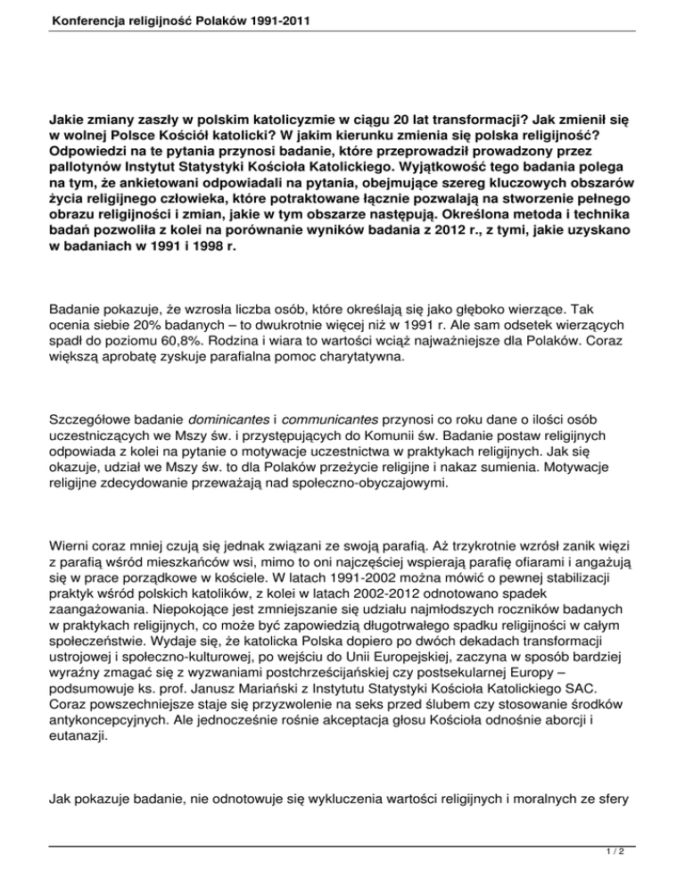 Konferencja religijność Polaków 1991-2011 Jakie zmiany zaszły w polskim katolicyzmie w ciągu 20 lat transformacji? Jak zmienił się w wolnej Polsce Kościół katolicki? W jakim kierunku zmienia się polska religijność? Odpowiedzi na te pytania przynosi badanie, które przeprowadził prowadzony przez pallotynów Instytut Statystyki Kościoła Katolickiego. Wyjątkowość tego badania polega na tym, że ankietowani odpowiadali na pytania, obejmujące szereg kluczowych obszarów życia religijnego człowieka, które potraktowane łącznie pozwalają na stworzenie pełnego obrazu religijności i zmian, jakie w tym obszarze następują. Określona metoda i technika badań pozwoliła z kolei na porównanie wyników badania z 2012 r., z tymi, jakie uzyskano w badaniach w 1991 i 1998 r. Badanie pokazuje, że wzrosła liczba osób, które określają się jako głęboko wierzące. Tak ocenia siebie 20% badanych – to dwukrotnie więcej niż w 1991 r. Ale sam odsetek wierzących spadł do poziomu 60,8%. Rodzina i wiara to wartości wciąż najważniejsze dla Polaków. Coraz większą aprobatę zyskuje parafialna pomoc charytatywna. Szczegółowe badanie dominicantes i communicantes przynosi co roku dane o ilości osób uczestniczących we Mszy św. i przystępujących do Komunii św. Badanie postaw religijnych odpowiada z kolei na pytanie o motywacje uczestnictwa w praktykach religijnych. Jak się okazuje, udział we Mszy św. to dla Polaków przeżycie religijne i nakaz sumienia. Motywacje religijne zdecydowanie przeważają nad społeczno-obyczajowymi. Wierni coraz mniej czują się jednak związani ze swoją parafią. Aż trzykrotnie wzrósł zanik więzi z parafią wśród mieszkańców wsi, mimo to oni najczęściej wspierają parafię ofiarami i angażują się w prace porządkowe w kościele. W latach 1991-2002 można mówić o pewnej stabilizacji praktyk wśród polskich katolików, z kolei w latach 2002-2012 odnotowano spadek zaangażowania. Niepokojące jest zmniejszanie się udziału najmłodszych roczników badanych w praktykach religijnych, co może być zapowiedzią długotrwałego spadku religijności w całym społeczeństwie. Wydaje się, że katolicka Polska dopiero po dwóch dekadach transformacji ustrojowej i społeczno-kulturowej, po wejściu do Unii Europejskiej, zaczyna w sposób bardziej wyraźny zmagać się z wyzwaniami postchrześcijańskiej czy postsekularnej Europy – podsumowuje ks. prof. Janusz Mariański z Instytutu Statystyki Kościoła Katolickiego SAC. Coraz powszechniejsze staje się przyzwolenie na seks przed ślubem czy stosowanie środków antykoncepcyjnych. Ale jednocześnie rośnie akceptacja głosu Kościoła odnośnie aborcji i eutanazji. Jak pokazuje badanie, nie odnotowuje się wykluczenia wartości religijnych i moralnych ze sfery 1/2 Konferencja religijność Polaków 1991-2011 publicznej. Z drugiej jednak strony, w skali całej populacji, religijność nie stanowi dziś dominującego czynnika wpływającego na postawy w obrębie sfery publicznej. (BP KEP) 2/2