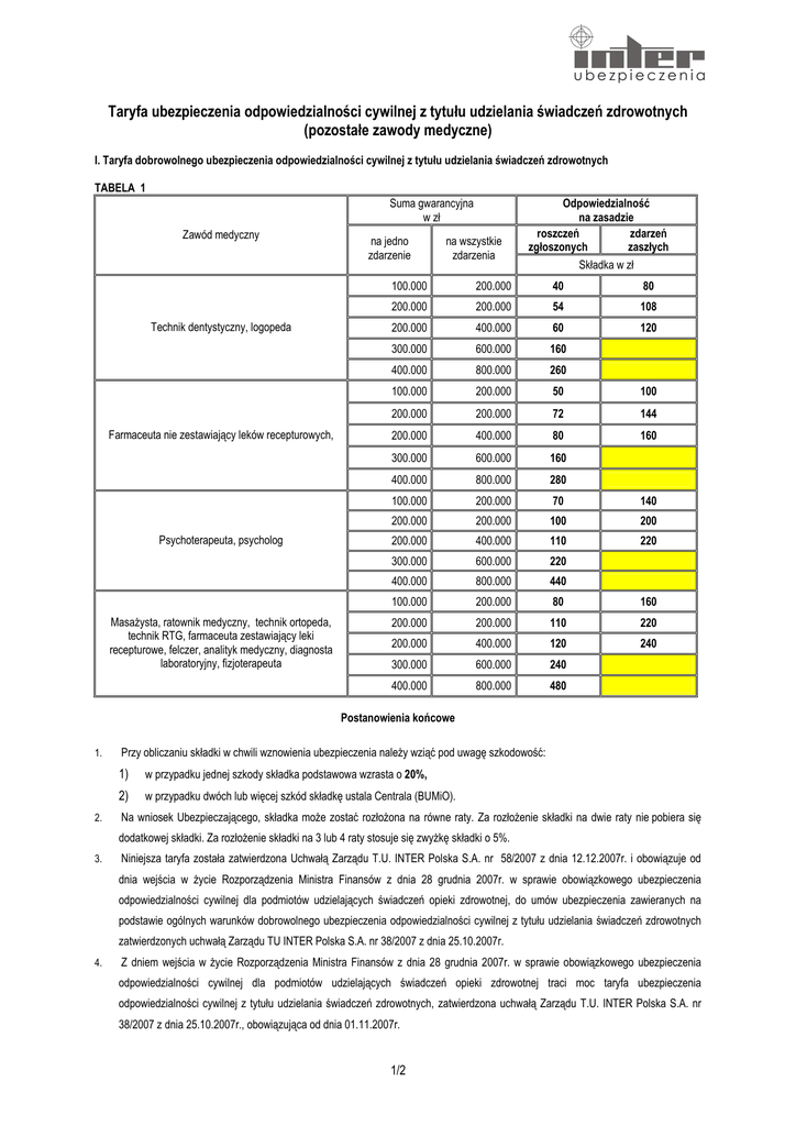 ubezpieczenia Taryfa ubezpieczenia odpowiedzialności cywilnej z tytułu udzielania świadczeń zdrowotnych (pozostałe zawody medyczne) I. Taryfa dobrowolnego ubezpieczenia odpowiedzialności cywilnej z tytułu udzielania świadczeń zdrowotnych TABELA 1 Suma gwarancyjna w zł Zawód medyczny Technik dentystyczny, logopeda Farmaceuta nie zestawiający leków recepturowych, Psychoterapeuta, psycholog MasaŜysta, ratownik medyczny, technik ortopeda, technik RTG, farmaceuta zestawiający leki recepturowe, felczer, analityk medyczny, diagnosta laboratoryjny, fizjoterapeuta na jedno zdarzenie na wszystkie zdarzenia Odpowiedzialność na zasadzie roszczeń zdarzeń zgłoszonych zaszłych Składka w zł 100.000 200.000 40 80 200.000 200.000 54 108 200.000 400.000 60 120 300.000 600.000 160 400.000 800.000 260 100.000 200.000 50 100 200.000 200.000 72 144 200.000 400.000 80 160 300.000 600.000 160 400.000 800.000 280 100.000 200.000 70 140 200.000 200.000 100 200 200.000 400.000 110 220 300.000 600.000 220 400.000 800.000 440 100.000 200.000 80 160 200.000 200.000 110 220 200.000 400.000 120 240 300.000 600.000 240 400.000 800.000 480 Postanowienia końcowe 1. 2. Przy obliczaniu składki w chwili wznowienia ubezpieczenia naleŜy wziąć pod uwagę szkodowość: 1) w przypadku jednej szkody składka podstawowa wzrasta o 20%, 2) w przypadku dwóch lub więcej szkód składkę ustala Centrala (BUMiO). Na wniosek Ubezpieczającego, składka moŜe zostać rozłoŜona na równe raty. Za rozłoŜenie składki na dwie raty nie pobiera się dodatkowej składki. Za rozłoŜenie składki na 3 lub 4 raty stosuje się zwyŜkę składki o 5%. 3. Niniejsza taryfa została zatwierdzona Uchwałą Zarządu T.U. INTER Polska S.A. nr 58/2007 z dnia 12.12.2007r. i obowiązuje od dnia wejścia w Ŝycie Rozporządzenia Ministra Finansów z dnia 28 grudnia 2007r. w sprawie obowiązkowego ubezpieczenia odpowiedzialności cywilnej dla podmiotów udzielających świadczeń opieki zdrowotnej, do umów ubezpieczenia zawieranych na podstawie ogólnych warunków dobrowolnego ubezpieczenia odpowiedzialności cywilnej z tytułu udzielania świadczeń zdrowotnych zatwierdzonych uchwałą Zarządu TU INTER Polska S.A. nr 38/2007 z dnia 25.10.2007r. 4. Z dniem wejścia w Ŝycie Rozporządzenia Ministra Finansów z dnia 28 grudnia 2007r. w sprawie obowiązkowego ubezpieczenia odpowiedzialności cywilnej dla podmiotów udzielających świadczeń opieki zdrowotnej traci moc taryfa ubezpieczenia odpowiedzialności cywilnej z tytułu udzielania świadczeń zdrowotnych, zatwierdzona uchwałą Zarządu T.U. INTER Polska S.A. nr 38/2007 z dnia 25.10.2007r., obowiązująca od dnia 01.11.2007r. 1/2 ubezpieczenia II. Taryfa obowiązkowego ubezpieczenia odpowiedzialności cywilnej podmiotu przyjmującego zamówienie na świadczenia zdrowotne UWAGA: podmioty przyjmujące zamówienie na świadczenia zdrowotne nie ujęte w niniejszej Taryfie mogą zostać objęte ochroną ubezpieczeniową za składką ustaloną przez Centralę TU INTER Polska S.A. Osoby legitymujące się nabyciem fachowych kwalifikacji do udzielania świadczeń zdrowotnych Suma gwarancyjna na jedno zdarzenie równowartość 12.000 euro ogłoszona przez NBP po raz pierwszy w roku w którym umowa ubezpieczenia zostaje zawarta Zawód medyczny technik dentystyczny, fizjoterapeuta, logopeda analityk medyczny, psycholog, technik RTG, ratownik medyczny, felczer Składka w zł 90 100 150 III. Taryfa obowiązkowego ubezpieczenia odpowiedzialności cywilnej świadczeniodawcy udzielającego świadczeń opieki zdrowotnej UWAGA: podmioty przyjmujące zamówienie na świadczenia zdrowotne nie ujęte w niniejszej Taryfie mogą zostać objęte ochroną ubezpieczeniową za składką ustaloną przez Centralę TU INTER Polska S.A. Osoby legitymujące się nabyciem fachowych kwalifikacji do udzielania świadczeń zdrowotnych Zawód medyczny Suma gwarancyjna równowartość 12.000 euro na jedno zdarzenie i 67.500 euro na wszystkie zdarzenia ogłoszona przez NBP po raz pierwszy w roku w którym umowa ubezpieczenia zostaje zawarta technik dentystyczny, fizjoterapeuta, logopeda analityk medyczny, psycholog, technik RTG, ratownik medyczny, felczer Składka w zł 90 100 150 Postanowienia końcowe 1. 2. 3. 4. 5. PowyŜsza taryfa dotyczy jednego przyjętego zamówienia na świadczenia zdrowotne, do oceny ryzyka przyjmujemy działalność związaną z najwyŜszym ryzykiem. Składka dodatkowa za kaŜde następne zamówienie na świadczenia zdrowotne (kontrakt) wynosi 20% składki podstawowej z tabeli. Przy obliczaniu składki w chwili wznowienia ubezpieczenia naleŜy wziąć pod uwagę szkodowość: 1) w przypadku jednej szkody składka podstawowa wzrasta o 20%, 2) w przypadku dwóch lub więcej szkód składkę ustala Centrala (BUMiO). Na wniosek Ubezpieczającego, składka moŜe zostać rozłoŜona na równe raty. Za rozłoŜenie składki na dwie raty nie pobiera się dodatkowej składki. Za rozłoŜenie składki na 3 lub 4 raty stosuje się zwyŜkę składki o 5%. Niniejsza taryfa została zatwierdzona Uchwałą Zarządu TU INTER Polska S.A. nr 58/2007 z dnia 12.12.2007r. i obowiązuje od dnia wejścia w Ŝycie Rozporządzenia Ministra Finansów z dnia 28 grudnia 2007r. w sprawie obowiązkowego ubezpieczenia odpowiedzialności cywilnej dla podmiotów udzielających świadczeń opieki zdrowotnej, do umów ubezpieczenia zawieranych na podstawie: 1) Ogólnych warunków obowiązkowego ubezpieczenia odpowiedzialności cywilnej z tytułu wykonywania świadczeń zdrowotnych przez podmiot przyjmujący zamówienie na świadczenia zdrowotne, zatwierdzonych Uchwałą Zarządu TU INTER Polska S.A. nr 39/2007 z dnia 25.10.2007r. 2) Ogólnych Warunków Obowiązkowego Ubezpieczenia Odpowiedzialności Cywilnej Świadczeniodawcy Udzielającego Świadczeń Opieki Zdrowotnej, zatwierdzonych Uchwałą Zarządu TU INTER Polska S.A. nr 55/2007 z dnia 12.12.2007r. Z dniem wejścia w Ŝycie Rozporządzenia Ministra Finansów z