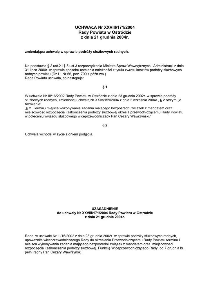 UCHWAŁA Nr XXVIII/171/2004 Rady Powiatu w Ostródzie z dnia 21 grudnia 2004r. zmieniająca uchwałę w sprawie podróży służbowych radnych. Na podstawie § 2 ust.2 i § 5 ust.3 rozporządzenia Ministra Spraw Wewnętrznych i Administracji z dnia 31 lipca 2000r. w sprawie sposobu ustalania należności z tytułu zwrotu kosztów podróży służbowych radnych powiatu (Dz.U. Nr 66, poz. 799 z późn.zm.) Rada Powiatu uchwala, co następuje: §1 W uchwale Nr III/16/2002 Rady Powiatu w Ostródzie z dnia 23 grudnia 2002r. w sprawie podróży służbowych radnych, zmienionej uchwałą Nr XXIV/159/2004 z dnia 2 września 2004r., § 2 otrzymuje brzmienie: „§ 2. Termin i miejsce wykonywania zadania mającego bezpośredni związek z mandatem oraz miejscowość rozpoczęcia i zakończenia podróży służbowej określa przewodniczącemu Rady Powiatu w poleceniu wyjazdu służbowego wiceprzewodniczący Pan Cezary Wawrzyński.” §2 Uchwała wchodzi w życie z dniem podjęcia. UZASADNIENIE do uchwały Nr XXVIII/171/2004 Rady Powiatu w Ostródzie z dnia 21 grudnia 2004r. Rada, w uchwale Nr III/16/2002 z dnia 23 grudnia 2002r. w sprawie podróży służbowych radnych, upoważniła wiceprzewodniczącego Rady do określania Przewodniczącemu Rady Powiatu terminu i miejsca wykonywania zadania mającego bezpośredni związek z mandatem oraz miejscowości rozpoczęcia i zakończenia podróży służbowej. Funkcję Wiceprzewodniczącego Rady, od 7 grudnia br. pełni radny Pan Cezary Wawrzyński.