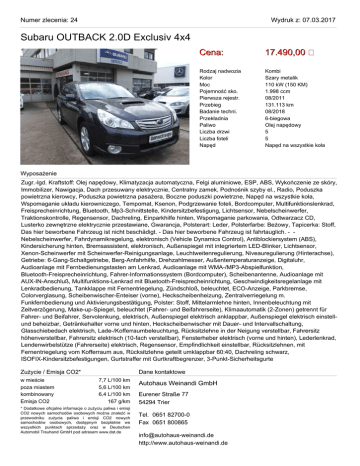 Numer zlecenia: 24 Wydruk z: 07.03.2017 Subaru OUTBACK 2.0D Exclusiv 4x4 Cena: 17.490,00 Rodzaj nadwozia Kolor Moc Pojemność sko. Pierwsza rejestr. Przebieg Badanie techni. Przekładnia Paliwo Liczba drzwi Liczba foteli Napęd Kombi Szary metalik 110 kW (150 KM) 1.998 ccm 08/2011 131.113 km 08/2018 6-biegowa Olej napędowy 5 5 Napęd na wszystkie koła Wyposażenie Zugr.-lgd. Kraftstoff: Olej napędowy, Klimatyzacja automatyczna, Felgi aluminiowe, ESP, ABS, Wykończenie ze skóry, Immobilizer, Nawigacja, Dach przesuwany elektrycznie, Centralny zamek, Podnośnik szyby el., Radio, Poduszka powietrzna kierowcy, Poduszka powietrzna pasażera, Boczne poduszki powietrzne, Napęd na wszystkie koła, Wspomaganie układu kierowniczego, Tempomat, Ksenon, Podgrzewanie foteli, Bordcomputer, Multifunktionslenkrad, Freisprecheinrichtung, Bluetooth, Mp3-Schnittstelle, Kindersitzbefestigung, Lichtsensor, Nebelscheinwerfer, Traktionskontrolle, Regensensor, Dachreling, Einparkhilfe hinten, Wspomaganie parkowania, Odtwarzacz CD, Lusterko zewnętrzne elektrycznie przestawiane, Gwarancja, Polsterart: Leder, Polsterfarbe: Beżowy, Tapicerka: Stoff, Das hier beworbene Fahrzeug ist nicht beschädigt. - Das hier beworbene Fahrzeug ist fahrtauglich. - Nebelscheinwerfer, Fahrdynamikregelung, elektronisch (Vehicle Dynamics Control), Antiblockiersystem (ABS), Kindersicherung hinten, Bremsassistent, elektronisch, Außenspiegel mit integriertem LED-Blinker, Lichtsensor, Xenon-Scheinwerfer mit Scheinwerfer-Reinigungsanlage, Leuchtweitenregulierung, Niveauregulierung (Hinterachse), Getriebe: 6-Gang-Schaltgetriebe, Berg-Anfahrhilfe, Drehzahlmesser, Außentemperaturanzeige, Digitaluhr, Audioanlage mit Fernbedienungstasten am Lenkrad, Audioanlage mit WMA-/MP3-Abspielfunktion, Bluetooth-Freisprecheinrichtung, Fahrer-Informationssystem (Bordcomputer), Scheibenantenne, Audioanlage mit AUX-IN-Anschluß, Multifunktions-Lenkrad mit Bluetooth-Freisprecheinrichtung, Geschwindigkeitsregelanlage mit Lenkradbedienung, Tankklappe mit Fernentriegelung, Zündschloß, beleuchtet, ECO-Anzeige, Parkbremse, Colorverglasung, Scheibenwischer-Enteiser (vorne), Heckscheibenheizung, Zentralverriegelung m. Funkfernbedienung und Aktivierungsbestätigung, Polster: Stoff, Mittelarmlehne hinten, Innenbeleuchtung mit Zeitverzögerung, Make-up-Spiegel, beleuchtet (Fahrer- und Beifahrerseite), Klimaautomatik (2-Zonen) getrennt für Fahrer- und Beifahrer, Servolenkung, elektrisch, Außenspiegel elektrisch anklappbar, Außenspiegel elektrisch einstellund beheizbar, Getränkehalter vorne und hinten, Heckscheibenwischer mit Dauer- und Intervallschaltung, Glasschiebedach elektrisch, Lade-/Kofferraumbeleuchtung, Rücksitzlehne in der Neigung verstellbar, Fahrersitz höhenverstellbar, Fahrersitz elektrisch (10-fach verstellbar), Fensterheber elektrisch (vorne und hinten), Lederlenkrad, Lendenwirbelstütze (Fahrerseite) elektrisch, Regensensor, Empfindlichkeit einstellbar, Rücksitzlehnen, mit Fernentriegelung vom Kofferraum aus, Rücksitzlehne geteilt umklappbar 60:40, Dachreling schwarz, ISOFIX-Kindersitzbefestigungen, Gurtstraffer mit Gurtkraftbegrenzer, 3-Punkt-Sicherheitsgurte Zużycie / Emisja CO2* w mieście poza miastem kombinowany Emisja CO2 Dane kontaktowe 7,7 L/100 km 5,6 L/100 km 6,4 L/100 km 167 g/km * Dodatkowe oficjalne informacje o zużyciu paliwa i emisji CO2 nowych samochodów osobowych można znaleźć w przewodniku zużycia paliwa i emisji CO2 nowych samochodów osobowych, dostępnym bezpłatnie we wszystkich punktach sprzedaży oraz w Deutschen Automobil Treuhand GmbH pod adresem www.dat.de Autohaus Weinandi GmbH Eurener Straße 77 54294 Trier Tel. 0651 82700-0 Fax 0651 800865 [email protected] http://www.autohaus-weinandi.de Numer zlecenia: 24 Subaru OUTBACK 2.0D Exclusiv 4x4 Wydruk z: 07.03.2017 Numer zlecenia: 24 Subaru OUTBACK 2.0D Exclusiv 4x4 Wydruk z: 07.03.2017 Numer zlecenia: 24 Subaru OUTBACK 2.0D Exclusiv 4x4 Wydruk z: 07.03.2017