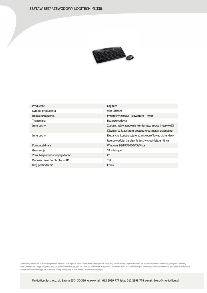 ZESTAW BEZPRZEWODOWY LOGITECH MK330 Producent Logitech Symbol producenta 920-003999 Rodzaj urządzenia Przenośny zestaw klawiatura - mysz Transmisja Bezprzewodowa Inne cechy Zestaw, który zapewnia komfortową pracę i rozrywk� � dzięki 11 klawiszom dostępu oraz myszy przenośne- Inne cechy Elegancka konstrukcja oraz niskoprofilowe, ciche klawisze powodują, że pisanie jest wygodniejsze niż na Kompatybilna z Windows 98/ME/2000/XP/Vista Gwarancja 24 miesiące Znak bezpieczeństwa/zgodności CE Dopuszczenie do obrotu w RP Tak Kraj pochodzenia Chiny Dokładamy wszelkich starań aby podane zdjęcie i opis były w pełni prawidłowe i kompletne. Niestety, nie możemy zagwarantować, że podane dane nie zawierają pomyłek i błędów, które jednak nie mogą być podstawą do ewentualnych roszczeń. W razie jakichkolwiek wątpliwości lub chęci uzyskania dodatkowych informacji prosimy o kontakt z działem handlowym. Prezentowane informacje nie stanowią oferty handlowej w rozumieniu Kodeksu Cywilnego. Multioffice Sp. z o.o. ul. Zawiła 65D, 30-390 Kraków tel.: 012 2999 777 faks: 012 2999 778 e-mail: [email protected]