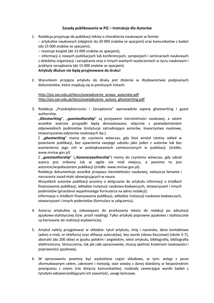 Zasady publikowania w PiZ – Instrukcje dla Autorów 1. Redakcja przyjmuje do publikacji teksty o charakterze naukowym w formie: − artykułów naukowych (objętość do 20 000 znaków ze spacjami) oraz komunikatów z badań (do 15 000 znaków ze spacjami); − recenzje książek (do 15 000 znaków ze spacjami); − informacji o nowych publikacjach lub konferencjach, sympozjach i seminariach naukowych z dziedziny organizacji i zarządzania oraz o innych ważnych wydarzeniach w życiu naukowym i praktyce zarządzania (do 15 000 znaków ze spacjami). Artykuły dłuższe nie będą przyjmowane do druku! 2. Warunkiem przyjęcia artykułu do druku jest złożenie w Wydawnictwie podpisanych dokumentów, które znajdują się w poniższych linkach: http://piz.san.edu.pl/docs/oswiadczenie_prawa_autorskie.pdf http://piz.san.edu.pl/docs/oswiadczenie_autora_ghostwriting.pdf 3. Redakcja „Przedsiębiorczości i Zarządzania” wprowadziła zaporę ghostwriting i guest authorship. „Ghostwriting”, „guestauthorship” są przejawem nierzetelności naukowej, a zatem wszelkie wykryte przypadki będą demaskowane, włącznie z powiadomieniem odpowiednich podmiotów (instytucje zatrudniające autorów, towarzystwa naukowe, stowarzyszenia edytorów naukowych itp.). Z „ghostwriting” mamy do czynienia wówczas, gdy ktoś wniósł istotny wkład w powstanie publikacji, bez ujawnienia swojego udziału jako jeden z autorów lub bez wymienienia jego roli w podziękowaniach zamieszczonych w publikacji. (źródło: www.mnisw.gov.pl) Z „guestauthorship” („honoraryauthorship”) mamy do czynienia wówczas, gdy udział autora jest znikomy lub w ogóle nie miał miejsca, a pomimo to jest autorem/współautorem publikacji (źródło: www.mnisw.gov.pl). Redakcja dokumentuje wszelkie przejawy nierzetelności naukowej, zwłaszcza łamania i naruszania zasad etyki obowiązujących w nauce. Wszystkich autorów publikacji prosimy o dołączanie do artykułu informacji o źródłach finansowania publikacji, wkładzie instytucji naukowo‐badawczych, stowarzyszeń i innych podmiotów (przesłanie wypełnionego formularza na adres redakcji). Informacja o źródłach finansowania publikacji, wkładzie instytucji naukowo‐badawczych, stowarzyszeń i innych podmiotów (formularz w załączeniu). 4. Autorzy artykułów są zobowiązani do przekazania tekstu do redakcji po adiustacji językowo‐stylistycznej (tzw. proof reading). Tylko artykuły poprawne językowo i stylistycznie są kierowane do realizacji wydawniczej. 5. Artykuł należy przygotować w układzie: tytuł artykułu, imię i nazwisko, dane kontaktowe (adres e‐mail, nr telefonu) oraz afiliacja autora(ów), key words (słowa kluczowe) (około 5‐7), abstrakt (do 200 słów) w języku polskim i angielskim, tekst artykułu, bibliografia, bibliografia elektroniczna. Streszczenia, tak jak całe opracowanie, muszą spełniać kryterium naukowości i poprawności językowej. 6. W opracowaniu powinny być wydzielone części składowe, w tym: wstęp z jasno sformułowanym celem, zakresem i metodą; stan wiedzy z danej dziedziny w bezpośrednim powiązaniu z celem (nie dotyczy komunikatów), rozdziały zawierające wyniki badań z tytułami odzwierciedlającymi ich zawartość, uwagi końcowe. 7. Materiały winny być przesłane droga mailową (ewentualnie) dostarczone w jednym egzemplarzu wraz z dołączonym nośnikiem elektronicznym. Plik powinien być przygotowany w standardzie Word (prosimy o niekorzystnie z innych edytorów tekstu), czcionka Times New Roman 12 p., odstęp półtora wiersza (miejsce na adiustację). Pliki nie powinny zawierać czynnych „linków”, tzn. odnośników prowadzących po kliknięciu na nie do stron internetowych lub innych dokumentów. 8. Do artykułu (na końcu tekstu) należy dołączyć profesjonalnie wykonaną bibliografię według wzorca zamieszczonego poniżej: Nazwisko autora inicjał imienia (kropka) i pierwsza litera drugiego imienia (kropka), po czym po przecinku w nawiasie okrągłym rok wydania, tytuł pozycji kursywą (przecinek), wydawca (przecinek), miejsce wydania (przecinek). Między dwoma inicjałami imion nie stawiamy spacji. W cudzysłowie pisze się, zgodnie z normą, tylko tytuł czasopisma, zeszyt, numer. Oznaczenia powinny mieć formę ogólnie przyjętych skrótów: R. (= rocznik), z. (= zeszyt), nr (= numer). Przykłady: − Książka – 1 autor: Kowalski B., (1998), Problemy współczesnej kultury, PWN, Warszawa. − Książka – 2 autorów: Kowalski B., Nowak E., (2000), Zarządzanie międzykulturowe, ExLibris, Kraków. − Książka – kilku autorów: Fisher R., Ury W., Patton B., (1991), Getting to yes: Negotiating an agreement without giving in, 2nd edition, Century Business, London. − Książka – wielu autorów. Jeśli książka posiada więcej niż 3 autorów, zapisujemy nazwiska i inicjały imienia trzech pierwszych, wymienionych na stronie tytułowej oraz skrót „i in.”, np.: Gadomski J., Lewarski R., Krzyżoń G. i in., (1989), Problemy przedsiębiorstw, wyd. Nove, Opole. − 2 książki – ten sam autor, ten sam rok: Nowak E., (2010a), Bezpieczeństwo narodowe, wyd. SAN, Łódź. Nowak E., (2010b), Zarządzanie bezpieczeństwem w kryzysie, wyd. SAN, Łódź. − Książka – 1 redaktor Piasecki R. (red.), (2008), Polska i Unia Europejska w dobie globalizacji, wyd. SAN, Łódź. − Rozdział w książce napisany przez kogoś innego niż redaktora: Świerzbicki M., (2009), Zarządzanie strategiczne w obszarze rynków medycznych, w: Limanowski R. (red.), Zarządzanie w służbie zdrowia, Akon, Gdańsk. − Publikacje rządowe: Ministerstwo Zdrowia, (2011), Strategia rozwoju informatyzacji w zarządzaniu szpitalami – komunikat, www.mz.pl.mfjiejfij, [13 marca 2011]. − Publikacje konferencyjne: Marjański A., (2008), Motywowanie pracowników w firmach rodzinnych, I Konferencja „Firmy rodzinne”, Społeczna Akademia Nauk, Łódź, ss. 24–56. − Artykuły prasowe: Dy