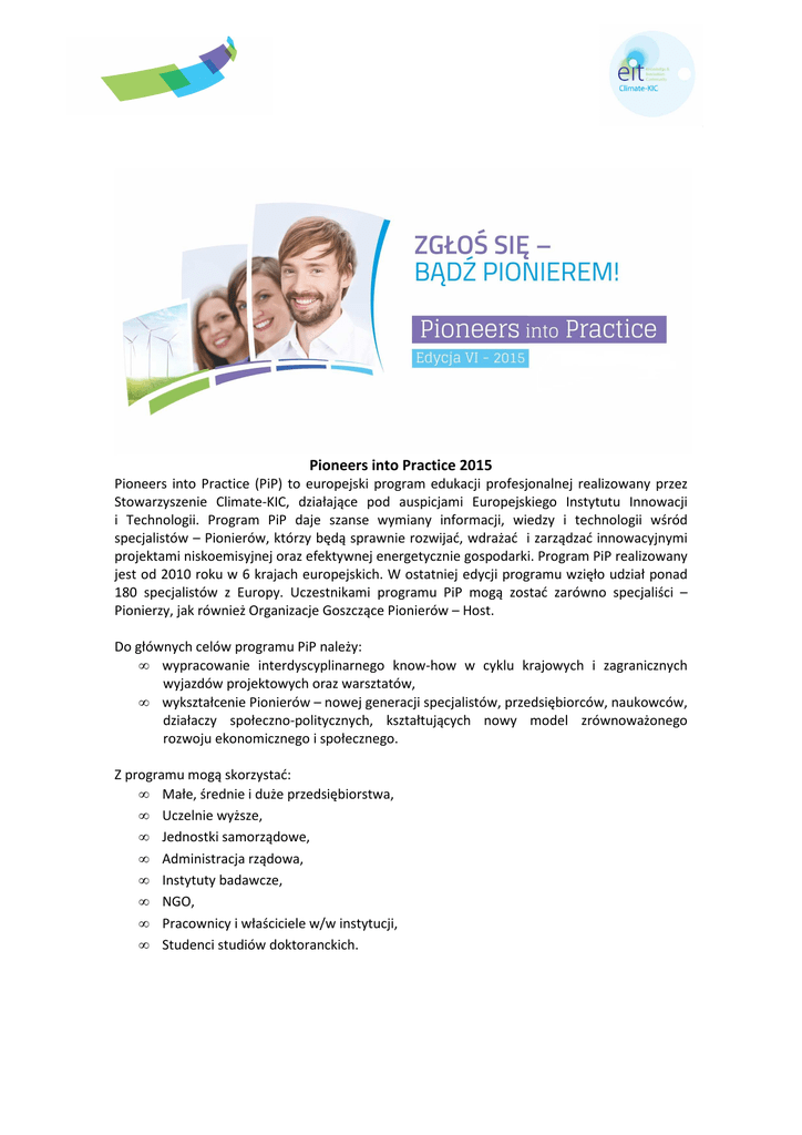 Pioneers into Practice 2015 Pioneers into Practice (PiP) to europejski program edukacji profesjonalnej realizowany przez Stowarzyszenie Climate-KIC, działające pod auspicjami Europejskiego Instytutu Innowacji i Technologii. Program PiP daje szanse wymiany informacji, wiedzy i technologii wśród specjalistów – Pionierów, którzy będą sprawnie rozwijać, wdrażać i zarządzać innowacyjnymi projektami niskoemisyjnej oraz efektywnej energetycznie gospodarki. Program PiP realizowany jest od 2010 roku w 6 krajach europejskich. W ostatniej edycji programu wzięło udział ponad 180 specjalistów z Europy. Uczestnikami programu PiP mogą zostać zarówno specjaliści – Pionierzy, jak również Organizacje Goszczące Pionierów – Host. Do głównych celów programu PiP należy: • wypracowanie interdyscyplinarnego know-how w cyklu krajowych i zagranicznych wyjazdów projektowych oraz warsztatów, • wykształcenie Pionierów – nowej generacji specjalistów, przedsiębiorców, naukowców, działaczy społeczno-politycznych, kształtujących nowy model zrównoważonego rozwoju ekonomicznego i społecznego. Z programu mogą skorzystać: • Małe, średnie i duże przedsiębiorstwa, • Uczelnie wyższe, • Jednostki samorządowe, • Administracja rządowa, • Instytuty badawcze, • NGO, • Pracownicy i właściciele w/w instytucji, • Studenci studiów doktoranckich. Program swoją tematyką obejmuje bardzo szeroki zakres związany z gospodarką niskoemisyjną, dlatego Pionierzy w ramach programu będą realizować projekty obejmujące min.: • Odnawialne źródła energii, niskoemisyjne systemy produkcji energii, • Zintegrowane systemy transportowe w miastach, • Zrównoważone i efektywne energetycznie budownictwo i architekturę, domy pasywne, • Zieleń miejską, zielone dachy i ściany, • Infrastrukturę wodno-kanalizacyjną, zasoby wodne i zielone w miastach, • Ochronę przeciwpowodziową, • Energooszczędne technologie oświetleniowe, • Fotowoltaikę, • Społeczną odpowiedzialność biznesu (CSR), prawo środowiskowe, zielone biura, • Zielony marketing, jak również wiele innych. Kluczowy w programie jest to, aby realizowane projekty były trafnie dopasowywane do potrzeb i możliwości jego uczestników. Dzięki temu uczestnicy programu PiP mają możliwość poznania różnych perspektyw i wyzwań związanych z procesem transformacji do niskowęglowej gospodarki jak również sposobów ich implementacji. Program realizowany jest w następujących etapach: 1. Rekrutacja do programu (26 stycznia - 23 marca 2015 r.) 2. Trzydniowy warsztat wprowadzający (kwiecień 2015 r.) 3. Krajowy, miesięczny staż projektowy (od kwietnia do czerwca 2015r. włącznie 4 tygodnie) 4. Dwudniowe warsztaty podsumowujące staż krajowy (czerwiec 2015r.) 5. Zagraniczny, miesięczny staż projektowy (od września do października 2015r. włącznie 4 tygodnie) 6. Zagraniczny, jednodniowy warsztat tematyczny oraz dwudniowy Festiwal Innowacji: (październik 2015 r. – Festiwal Innowacji dla najlepszych Pionierów) 7. Jednodniowy warsztat podsumowujący (listopad 2015 r.) Podczas trwania całego programu, aż do jego zakończenia, Pionierzy będą pracować w grupach kierowanych przez Regionalnych Trenerów. Celem pracy grupowej będzie rozwiązanie regionalnego problemu w oparciu o metodologię Transition Thinking i Design Thinking , który zostanie zdefiniowany dla każdej grupy indywidualnie, zgodnie z jej specjalizacją. Wyniki pracy wszystkich grup zostaną przedstawione podczas ostatniego z warsztatów w formie konkursu. Zwycięska drużyna, której pomysł okaże się najciekawszy dla Jury, otrzyma cenne nagrody. Do najważniejszych korzyści z udziału w programie PiP należą: • Rozwój i wdrożenie innowacyjnych projektów niskoemisyjnych na rynek polski i europejski, • Budowanie nowego rynku zbytu dla produktów i usług związanych z łagodzeniem zmian klimatycznych, • Transfer wiedzy i technologii między nauką a biznesem, • Bezpośredni dostęp do najlepszych europejskich przedsiębiorstw czy instytutów naukowo-badawczych, • Bogata baza kontaktów międzynarodowych, • Rozwijanie wiedzy i kompetencji pracowników min. dzięki cyklowi warsztatów związanych z Transition Management oraz pracy zespołowej nad projektami, • Dostęp do szkoleń eksperckich dot. tworzenia modeli biznesowych, negocjacji, prezentacji czy Design Thinking, • Możliwość uczestniczenia w międzynarodowych projektach Climate-KIC o charakterze komercyjnym oraz uzyskania wsparcia finansowego. Korzyści z udziału w programie dla Pioniera: • Udział w dwóch miesięcznych stażach oraz szeregu szkoleń i warsztatów tematycznych, • Rozwój umiejętności związanych z metodologią Transition Thinking i Design Thinking, • Nabycie wiedzy i doświadczenia z zakresu „zielonych technologii”, • Przeniesienie na grunt firmy wysyłającej Pioniera nabytego know-how, • Refundacja kosztów związanych z wynagrodzeniem, zakwaterowanie, podróży i wyżywieniem do kwoty 8 000 EUR. • Rozwój osobisty, • Ciekawe i niepowtarzalne doświadczenia. Korzyści z udziału w programie dla Organizacji Goszczącej Pionierów: • Miesięczne, bezpłatne staże specjalistów (krajowych i/lub zagranicznych), wybranych przez Hosta, z dziedziny klimatu szeroko pojętej gospodarki niskoemisyjnej, • Rozszerzenie bazy kontaktów, • Nabycie nowej wiedzy, doświadczeń oraz know-how, • Możliwość uzyskania dofinansowania do kolejnych projektów • Brak kosztów udziału w programie – jedyny koszt to wprowadzenie Pioniera w program stażu w organizacji oraz zapewnienie mu miejsca do pracy. Nie jesteś pewien czy program jest dla Ciebie lub Twojej organizacji? Z przyjemnością rozwiejemy Twoje wątpliwości! Szczegółowy przeowdnik po programie PiP znajdziesz tutaj: http://www.climate-kic.org/wp-content/uploads/2015/01/PiP-Guide-2015.pdf Lub aplikuj teraz! http://www.climate-k