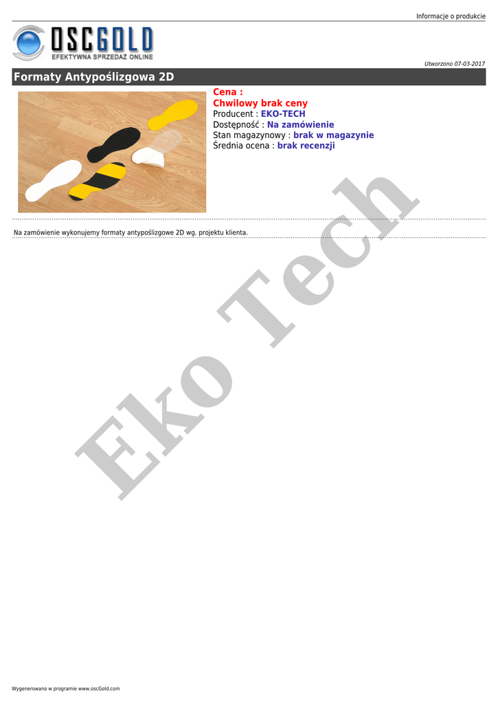 Informacje o produkcie Utworzono 07-03-2017 Formaty Antypoślizgowa 2D Cena : Chwilowy brak ceny Ek o Te Na zamówienie wykonujemy formaty antypoślizgowe 2D wg. projektu klienta. ch Producent : EKO-TECH Dostępność : Na zamówienie Stan magazynowy : brak w magazynie Średnia ocena : brak recenzji Wygenerowano w programie www.oscGold.com