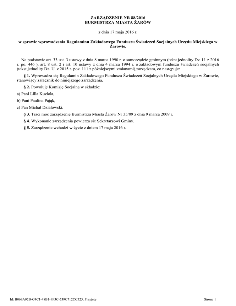 ZARZĄDZENIE NR 88/2016 BURMISTRZA MIASTA ŻARÓW z dnia 17 maja 2016 r. w sprawie wprowadzenia Regulaminu Zakładowego Funduszu Świadczeń Socjalnych Urzędu Miejskiego w Żarowie. Na podstawie art. 33 ust. 3 ustawy z dnia 8 marca 1990 r. o samorządzie gminnym (tekst jednolity Dz. U. z 2016 r. po. 446 ), art. 8 ust. 2 i art. 10 ustawy z dnia 4 marca 1994 r. o zakładowym funduszu świadczeń socjalnych (tekst jednolity Dz. U. z 2015 r. poz. 111 z późniejszymi zmianami),zarządzam, co następuje: § 1. Wprowadza się Regulamin Zakładowego Funduszu Świadczeń Socjalnych Urzędu Miejskiego w Żarowie, stanowiący załącznik do niniejszego zarządzenia. § 2. Powołuję Komisję Socjalną w składzie: a) Pani Lilla Kuzioła, b) Pani Paulina Pająk, c) Pan Michał Działowski. § 3. Traci moc zarządzenie Burmistrza Miasta Żarów Nr 35/09 z dnia 9 marca 2009 r. § 4. Wykonanie zarządzenia powierza się Sekretarzowi Gminy. § 5. Zarządzenie wchodzi w życie z dniem 17 maja 2016 r. Id: B069A92B-C4C1-48B1-9F3C-539C712CC525. Przyjęty Strona 1 Załącznik do Zarządzenia Nr 88/2016 Burmistrza Miasta Żarów z dnia 17 maja 2016 r. Regulamin ZAKŁADOWEGO FUNDUSZU ŚWIADCZEŃ SOCJALNYCH URZĘDU MIEJSKIEGO W ŻAROWIE §1 Wprowadza się Regulamin Zakładowego Funduszu Świadczeń Socjalnych zwanego dalej Funduszem. §2 Regulamin określa zasady przeznaczania środków Funduszu na poszczególne cele i rodzaje działalności socjalnej oraz zasady i warunki korzystania z usług i świadczeń finansowanych z Funduszu. §3 Do korzystania z Funduszu uprawnieni są: 1. pracownicy zatrudnieni na podstawie umowy o pracę, powołania, wyboru, bez względu na rodzaj umowy i wymiar czasu pracy, z wyłączeniem pracowników w okresie przebywania na urlopach bezpłatnych, udzielonych na podstawie art. 174 Kodeksu pracy, i dłuższych niż 30 dni; 2. emeryci oraz renciści - byli pracownicy Urzędu Miejskiego w Żarowie, z którymi rozwiązano stosunek pracy w związku z ich przejściem na emeryturę lub rentę; 3. członkowie rodzin osób wymienionych w pkt. 1-2, tj.: a) małżonek, b) osoba pozostająca w związku nieformalnym, mieszkająca razem z osobą wymienioną w pkt. 1-2, c) dzieci (w wieku do lat 18, a uczące się do 25 lat oraz bez względu na wiek dzieci z orzeczonym znacznym lub umiarkowanym stopniem niepełnosprawności). §4 1. Fundusz tworzy się z corocznego odpisu podstawowego naliczonego w stosunku do przeciętnej liczby zatrudnionych. 2. Wysokość odpisu podstawowego i jego zwiększeń na jednego zatrudnionego ustala się według zasad określonych w art. 5 ust. 2-5 ustawy z dnia 4 marca 1994 r. o zakładowym funduszu świadczeń socjalnych (tj. z 1996 r. Dz. U. Nr 710, poz. 335 ze zm.). 3. Środki Funduszu na dany rok kalendarzowy pracodawca przekazuje na specjalnie w tym celu utworzony rachunek bankowy w terminie do 30 IX danego roku, z tym że do 31 V danego roku należy przekazać kwotę stanowiącą co najmniej 75 % równowartości odpisów. §5 Środki Funduszu przeznaczone są na finansowanie kosztów w zakresie: a) zorganizowanego wypoczynku w formie wyjazdów, b) działalności kulturalno-oświatowej c) wypoczynku w dni wolne od pracy organizowanego w formie turystyki grupowej, d) świadczeń wypoczynkowych i świątecznych, e) zapomóg pieniężnych dla osób znajdujących się w trudnej sytuacji losowej, f) udzielania pożyczek mieszkaniowych na: Id: B069A92B-C4C1-48B1-9F3C-539C712CC525. Przyjęty Strona 2 - cele mieszkaniowe, a w szczególności z przeznaczeniem na remont i modernizację, - przystosowanie mieszkań do potrzeb osób o ograniczonej sprawności fizycznej, - budowę i rozbudowę budynku mieszkalnego. §6 1. Podstawę gospodarowania środkami zakładowego funduszu stanowi roczny plan rzeczowofinansowy obejmujący podział środków na poszczególne rodzaje działalności socjalnej oraz ustalający wysokość udzielonych świadczeń. 2. Plan rzeczowo - finansowy ZFŚS sporządza Komisja Socjalna na podstawie wysokości odpisu oraz biorąc pod uwagę niewykorzystane środki z roku ubiegłego, najpóźniej do końca stycznia danego roku kalendarzowego. 3. Plan rzeczowo-finansowy ZFŚS zatwierdza Sekretarz Gminy. §7 1. Wysokość finansowania kosztów z Funduszu ustala się na podstawie sytuacji rodzinnej, życiowej i materialnej uprawnionego. 2. W celu ustalenia sytuacji materialnej każdy uprawniony złoży do Komisji Socjalnej najpóźniej do 31 maja danego roku kalendarzowego, oświadczenie o dochodach osiągniętych na jednego członka rodziny w poprzednim roku kalendarzowym (wzór zał. nr 1 do regulaminu) wraz z przedstawieniem do wglądu dokumentów potwierdzających osiągnięty dochód wymienionych w pkt. 4 - 8. Do obliczenia dochodu przypadającego na jednego członka rodziny należy przyjąć dochody wszystkich osób pozostających we wspólnym gospodarstwie domowym. 3. Uprawniony, który został zatrudniony po 31 maja danego roku zobowiązany jest do złożenia oświadczenia o dochodach osiągniętych na jednego członka rodziny w poprzednim roku kalendarzowym wraz z przedstawieniem do wglądu dokumentow wymienionych w pkt. 4 - 8 w terminie 2 miesięcy od daty zatrudnienia. 4. Uprawniony przedstawia PIT-37 ( własny lub wspólny z małżonkiem). 5. W przypadku, gdy członkowie rodziny lub osoby pozostające we wspólnym gospodarstwie domowym nie rozliczają się wspólnie, uprawniony przedstawi do wglądu rozliczenia podatkowe wszystkich członków rodziny lub osób pozostających we wspólnym gospodarstwie domowym bądź dokumenty potwierdzające ich dochód w przypadku gdy nie rozliczają się osobiście (np. PIT od pracodawcy, odcinek renty lub emerytury). 6. Jeżeli członek rodziny lub osoba pozostająca we wspólnym gospodarstwie domowym osiąga dochód z gospodarstwa rolnego, przyjmuje się, że z 1 ha przeliczeniowego uzyskuje się dochód miesięczny w wysokości 1/12 dochodu ogłoszonego corocznie, w drodze obwieszczenia przez Prezesa Głó