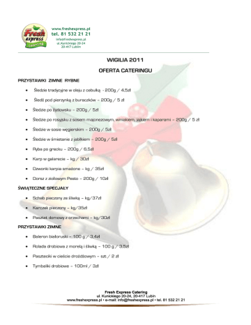 WIGILIA 2011 OFERTA CATERINGU PRZYSTAWKI ZIMNE RYBNE Śledzie tradycyjne w oleju z cebulką - 200g / 4,5zł Śledź pod pierzynką z buraczków – 200g / 5 zł Śledzie po żydowsku – 200g / 5zł Śledzie po rosyjsku z sosem majonezowym, winiakiem, jajkiem i kaparami – 200g / 5 zł Śledzie w sosie węgierskim – 200g / 5zł Śledzie w śmietanie z jabłkiem – 200g / 5zł Ryba po grecku – 200g / 6,5zł Karp w galarecie – kg / 30zł Dzwonki karpia smażone – kg / 35zł Dorsz z ziołowym Pesto – 200g / 10zł ŚWIĄTECZNE SPECJAŁY Schab pieczony ze śliwką – kg/37zł Karczek pieczony – kg/35zł Pasztet domowy z orzechami – kg/30zł PRZYSTAWKI ZIMNE Baleron białoruski – 100 g / 3,4zł Rolada drobiowa z morelą i śliwką – 100 g / 3,5zł Paszteciki w cieście drożdżowym – szt / 2 zł Tymbaliki drobiowe – 100ml / 3zł SAŁATKI Sałatka jarzynowa – kg / 18 zł Sałatka śledziowa z ziemniakami i ogórkiem kiszonym – kg/ 22 zł Sałatka z tuńczykiem – kg/22 zł Carpaccio z buraczków – kg/10 zł INNE POTRAWY ŚWIĄTECZNE Pierogi z kapustą i grzybami – kg / 14 zł Uszka – kg / 25zł Krokiety z kapustą i grzybami – szt. / 3 zł Wigilijna kapusta z grochem i grzybami – kg /16 zł Bigos staropolski z grzybami – 18 zł Kutia – kg / 20 zł CIASTA Szarlotka z żurawiną – kg / 20zł Sernik czekoladowy z bakaliami - kg / 22 zł Makowiec - kg / 20zł NAPOJE Kompot z suszu – l / 10zł ZUPY Barszcz czerwony czysty –250ml / 3zł Barszcz z grzybami – 250ml / 4zł Grzybowa z ziołami i makaronem – 250ml / 4zł Zamówienia prosimy składać do 19.12.2011 r. Termin i sposób odbioru zamówienia do uzgodnienia. Istnieje możliwość przygotowania gotowych dań na półmiskach jednorazowych wraz z przybraniem. Realizujemy także zamówienia specjalne. ZAPRASZAMY