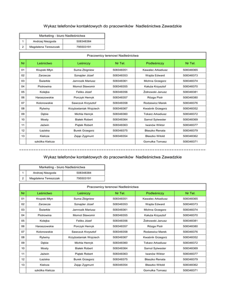 Wykaz telefonów kontaktowych do pracowników Nadleśnictwa Zawadzkie Marketing - biuro Nadleśnictwa 1 Andrzej Niezgoda 508348384 2 Magdalena Tereszczak 795503191 Pracownicy terenowi Nadleśnictwa Nr Leśnictwo Leśniczy Nr Tel. Podleśniczy Nr Tel. 01 Krupski Młyn Suma Zbigniew 508348351 Kawalec Arkadiusz 508348365 02 Zarzecze Sznajder Józef 508348353 Wajda Edward 508348373 03 Świerkle Jamrozik Mariusz 508348361 Michna Grzegorz 508348374 04 Piotrowina Momot Sławomir 508348355 Kałuża Krzysztof 508348370 05 Kolejka Feliks Józef 508348356 Żołnowski Janusz 508348381 06 Haraszowskie Porczyk Henryk 508348357 Rózga Piotr 508348380 07 Kolonowskie Sawczuk Krzysztof 508348358 Rodzewicz Marek 508348376 08 Rytwiny Krzyżostaniak Wojciech 508348367 Kwaśnik Grzegorz 508348352 09 Dębie Michla Henryk 508348360 Tokarz Arkadiusz 508348372 10 Mosty Białek Robert 508348364 Samol Sylwester 508348369 11 Jaźwin Piątek Robert 508348363 Iwanów Wiktor 508348377 12 Łaziska Burek Grzegorz 508348375 Błaszko Renata 508348379 13 Kielcza Zając Zygmunt 508348354 Błaszko Witold 508348362 Gomułka Tomasz 508348371 szkólka Kielcza Wykaz telefonów kontaktowych do pracowników Nadleśnictwa Zawadzkie Marketing - biuro Nadleśnictwa 1 Andrzej Niezgoda 508348384 2 Magdalena Tereszczak 795503191 Pracownicy terenowi Nadleśnictwa Nr Leśnictwo Leśniczy Nr Tel. Podleśniczy Nr Tel. 01 Krupski Młyn Suma Zbigniew 508348351 Kawalec Arkadiusz 508348365 02 Zarzecze Sznajder Józef 508348353 Wajda Edward 508348373 03 Świerkle Jamrozik Mariusz 508348361 Michna Grzegorz 508348374 04 Piotrowina Momot Sławomir 508348355 Kałuża Krzysztof 508348370 05 Kolejka Feliks Józef 508348356 Żołnowski Janusz 508348381 06 Haraszowskie Porczyk Henryk 508348357 Rózga Piotr 508348380 07 Kolonowskie Sawczuk Krzysztof 508348358 Rodzewicz Marek 508348376 08 Rytwiny Krzyżostaniak Wojciech 508348367 Kwaśnik Grzegorz 508348352 09 Dębie Michla Henryk 508348360 Tokarz Arkadiusz 508348372 10 Mosty Białek Robert 508348364 Samol Sylwester 508348369 11 Jaźwin Piątek Robert 508348363 Iwanów Wiktor 508348377 12 Łaziska Burek Grzegorz 508348375 Błaszko Renata 508348379 Kielcza Zając Zygmunt 508348354 Błaszko Witold 508348362 Gomułka Tomasz 508348371 13 szkólka Kielcza