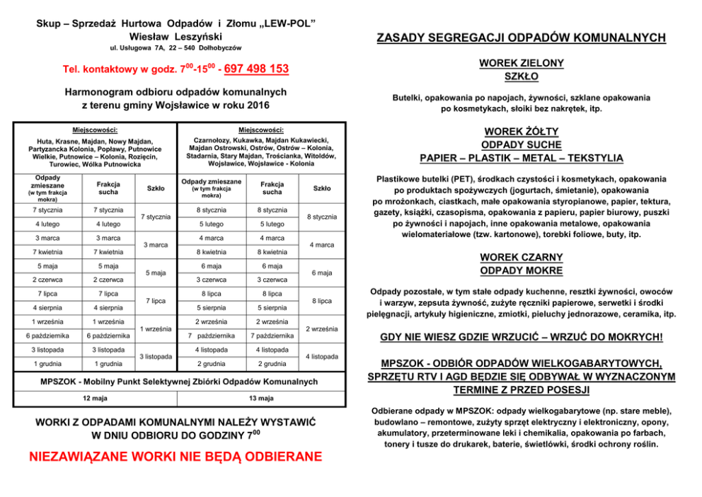 Skup – Sprzedaż Hurtowa Odpadów i Złomu „LEW-POL” Wiesław Leszyński ul. Usługowa 7A, 22 – 540 Dołhobyczów WOREK ZIELONY SZKŁO Tel. kontaktowy w godz. 700-1500 - 697 498 153 Harmonogram odbioru odpadów komunalnych z terenu gminy Wojsławice w roku 2016 Butelki, opakowania po napojach, żywności, szklane opakowania po kosmetykach, słoiki bez nakrętek, itp. Miejscowości: Miejscowości: Huta, Krasne, Majdan, Nowy Majdan, Partyzancka Kolonia, Popławy, Putnowice Wielkie, Putnowice – Kolonia, Rozięcin, Turowiec, Wólka Putnowicka Czarnołozy, Kukawka, Majdan Kukawiecki, Majdan Ostrowski, Ostrów, Ostrów – Kolonia, Stadarnia, Stary Majdan, Trościanka, Witoldów, Wojsławice, Wojsławice - Kolonia Odpady zmieszane (w tym frakcja mokra) 7 stycznia Frakcja sucha Szkło 7 stycznia Odpady zmieszane (w tym frakcja mokra) Frakcja sucha 8 stycznia 8 stycznia 5 lutego 5 lutego 4 marca 4 marca 7 stycznia 4 lutego 4 lutego 3 marca 3 marca 7 kwietnia 8 kwietnia 8 kwietnia 5 maja 5 maja 6 maja 6 maja 2 czerwca 2 czerwca 3 czerwca 3 czerwca 7 lipca 7 lipca 8 lipca 8 lipca 5 maja 6 maja 7 lipca 4 sierpnia 1 września 1 września 6 października 6 października 3 listopada 3 listopada 1 grudnia 1 grudnia 1 września 8 lipca 5 sierpnia 5 sierpnia 2 września 2 września 7 października 7 października 4 listopada 4 listopada 2 grudnia 2 grudnia 3 listopada 2 września 4 listopada MPSZOK - Mobilny Punkt Selektywnej Zbiórki Odpadów Komunalnych 12 maja WOREK ŻÓŁTY ODPADY SUCHE PAPIER – PLASTIK – METAL – TEKSTYLIA Plastikowe butelki (PET), środkach czystości i kosmetykach, opakowania po produktach spożywczych (jogurtach, śmietanie), opakowania po mrożonkach, ciastkach, małe opakowania styropianowe, papier, tektura, gazety, książki, czasopisma, opakowania z papieru, papier biurowy, puszki po żywności i napojach, inne opakowania metalowe, opakowania wielomateriałowe (tzw. kartonowe), torebki foliowe, buty, itp. 4 marca 7 kwietnia 4 sierpnia Szkło 8 stycznia 3 marca ZASADY SEGREGACJI ODPADÓW KOMUNALNYCH WOREK CZARNY ODPADY MOKRE Odpady pozostałe, w tym stałe odpady kuchenne, resztki żywności, owoców i warzyw, zepsuta żywność, zużyte ręczniki papierowe, serwetki i środki pielęgnacji, artykuły higieniczne, zmiotki, pieluchy jednorazowe, ceramika, itp. GDY NIE WIESZ GDZIE WRZUCIĆ – WRZUĆ DO MOKRYCH! MPSZOK - ODBIÓR ODPADÓW WIELKOGABARYTOWYCH, SPRZĘTU RTV I AGD BĘDZIE SIĘ ODBYWAŁ W WYZNACZONYM TERMINE Z PRZED POSESJI 13 maja WORKI Z ODPADAMI KOMUNALNYMI NALEŻY WYSTAWIĆ W DNIU ODBIORU DO GODZINY 700 NIEZAWIĄZANE WORKI NIE BĘDĄ ODBIERANE Odbierane odpady w MPSZOK: odpady wielkogabarytowe (np. stare meble), budowlano – remontowe, zużyty sprzęt elektryczny i elektroniczny, opony, akumulatory, przeterminowane leki i chemikalia, opakowania po farbach, tonery i tusze do drukarek, baterie, świetlówki, środki ochrony roślin.