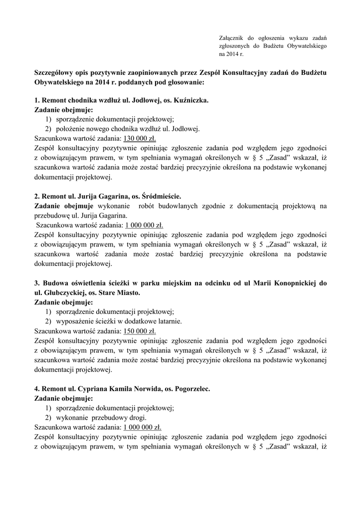 Załącznik do ogłoszenia wykazu zadań zgłoszonych do Budżetu Obywatelskiego na 2014 r. Szczegółowy opis pozytywnie zaopiniowanych przez Zespół Konsultacyjny zadań do Budżetu Obywatelskiego na 2014 r. poddanych pod głosowanie: 1. Remont chodnika wzdłuż ul. Jodłowej, os. Kuźniczka. Zadanie obejmuje: 1) sporządzenie dokumentacji projektowej; 2) położenie nowego chodnika wzdłuż ul. Jodłowej. Szacunkowa wartość zadania: 130 000 zł. Zespół konsultacyjny pozytywnie opiniując zgłoszenie zadania pod względem jego zgodności z obowiązującym prawem, w tym spełniania wymagań określonych w § 5 „Zasad” wskazał, iż szacunkowa wartość zadania może zostać bardziej precyzyjnie określona na podstawie wykonanej dokumentacji projektowej. 2. Remont ul. Jurija Gagarina, os. Śródmieście. Zadanie obejmuje wykonanie robót budowlanych zgodnie z dokumentacją projektową na przebudowę ul. Jurija Gagarina. Szacunkowa wartość zadania: 1 000 000 zł. Zespół konsultacyjny pozytywnie opiniując zgłoszenie zadania pod względem jego zgodności z obowiązującym prawem, w tym spełniania wymagań określonych w § 5 „Zasad” wskazał, iż szacunkowa wartość zadania może zostać bardziej precyzyjnie określona na podstawie dokumentacji projektowej. 3. Budowa oświetlenia ścieżki w parku miejskim na odcinku od ul Marii Konopnickiej do ul. Głubczyckiej, os. Stare Miasto. Zadanie obejmuje: 1) sporządzenie dokumentacji projektowej; 2) wyposażenie ścieżki w dodatkowe latarnie. Szacunkowa wartość zadania: 150 000 zł. Zespół konsultacyjny pozytywnie opiniując zgłoszenie zadania pod względem jego zgodności z obowiązującym prawem, w tym spełniania wymagań określonych w § 5 „Zasad” wskazał, iż szacunkowa wartość zadania może zostać bardziej precyzyjnie określona na podstawie wykonanej dokumentacji projektowej. 4. Remont ul. Cypriana Kamila Norwida, os. Pogorzelec. Zadanie obejmuje: 1) sporządzenie dokumentacji projektowej; 2) wykonanie przebudowy drogi. Szacunkowa wartość zadania: 1 000 000 zł. Zespół konsultacyjny pozytywnie opiniując zgłoszenie zadania pod względem jego zgodności z obowiązującym prawem, w tym spełniania wymagań określonych w § 5 „Zasad” wskazał, iż szacunkowa wartość zadania może zostać bardziej precyzyjnie określona na podstawie wykonanej dokumentacji projektowej. 5. Monitoring na os. Zachód. Zadanie obejmuje: 1) sporządzenie dokumentacji projektowej; 2) rozbudowę istniejącego systemu monitoringu miejskiego, umieszczenie kamer na nieruchomościach stanowiących własność gminy: ul. Piastowska 30 (system monitoringu ma obejmować swoim zasięgiem skrzyżowanie ul. Piastowskiej i Bolesława Chrobrego oraz drzwi wejściowe do Publicznej Szkoły Podstawowej nr 12) i ul. Archimedesa 25. Szacunkowa wartość zadania: 400 000 zł. Zespół konsultacyjny pozytywnie opiniując zgłoszenie zadania pod względem jego zgodności z obowiązującym prawem, w tym spełniania wymagań określonych w § 5 „Zasad” wskazał, iż szacunkowa wartość zadania może zostać bardziej precyzyjnie określona na podstawie wykonanej dokumentacji projektowej. 6. Wyposażenie ulicy Piastowskiej w donice z drzewami, os. Stare Miasto. Zadanie obejmuje ustawienie w obrębie ciągów pieszych (chodników) zlokalizowanych wzdłuż ulicy Piastowskiej kamiennych donic z dekoracyjnymi drzewkami jednego gatunku w regularnych odstępach. Szacunkowa wartość zadania: 100 000 zł. 7. Rekonstrukcja fontanny w centralnej części Placu Rady Europy, os. Stare Miasto. Zadanie obejmuje: 1) wykonanie dokumentacji projektowej; 2) zlokalizowanie w centralnej części Placu Rady Europy w Kędzierzynie-Koźlu obiektu małej architektury – wodotrysku wraz z figurkami bawiących się dzieci, nawiązującego do istniejącej w tym miejscu fontanny, istniejącej przed II Wojną Światową. Szacunkowa wartość zadania: 1 000 000 zł. Zespół konsultacyjny pozytywnie opiniując zgłoszenie zadania pod względem jego zgodności z obowiązującym prawem, w tym spełniania wymagań określonych w § 5 „Zasad” wskazał, iż szacunkowa wartość zadania może zostać bardziej precyzyjnie określona na podstawie wykonanej dokumentacji projektowej. 8. Renowacja skweru zielonego zlokalizowanego u zbiegu ulicy Portowej i Karola Szymanowskiego w os. Kłodnica. Zadanie obejmuje: 1) sporządzenie dokumentacji projektowej; 2) odnowienie zdegradowanego terenu zieleni użytkowej poprzez wytyczenie nowych i zrekonstruowanie istniejących alejek spacerowych, umieszczenie obiektów małej architektury (oświetlenie, miejsca siedzące, kosze na śmieci, toaleta dla zwierząt), nasadzenie i uzupełnienie zieleni ozdobnej (w tym klomby) oraz zainstalowanie monitoringu. Szacunkowa wartość zadania: 500 000 zł. Zespół konsultacyjny pozytywnie opiniując zgłoszenie zadania pod względem jego zgodności z obowiązującym prawem, w tym spełniania wymagań określonych w § 5 „Zasad” wskazał, iż szacunkowa wartość zadania może zostać bardziej precyzyjnie określona na podstawie wykonanej dokumentacji projektowej. 9. Remont zewnętrzny i terenu Publicznego Przedszkola nr 11, os. Pogorzelec. Zadanie obejmuje: 1) sporządzenie dokumentacji projektowej; 2) wykonanie termomodernizacji budynku; 3) zagospodarowanie ogrodu i remont ogrodzenia. Szacunkowa wartość zadania: 1 000 000 zł. Zespół konsultacyjny pozytywnie opiniując zgłoszenie zadania pod względem jego zgodności z obowiązującym prawem, w tym spełniania wymagań określonych w § 5 „Zasad” wskazał, iż szacunkowa wartość zadania może zostać bardziej precyzyjnie określona na podstawie wykonanej dokumentacji projektowej. 10. Modernizacja amfiteatru znajdującego się na terenie parku miejskiego na os. Stare Miasto (planty nad Odrą). Zadanie obejmuje: 1) sporządzenie dokumentacji projektowej; 2) odbudowę muszli koncertowej wraz z zapleczem technicznym umożliwiającym 
