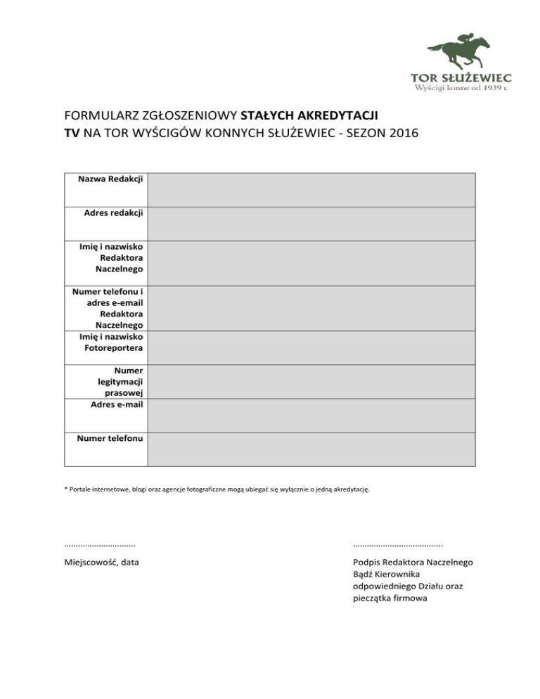 FORMULARZ ZGŁOSZENIOWY STAŁYCH AKREDYTACJI TV NA TOR WYŚCIGÓW KONNYCH SŁUŻEWIEC - SEZON 2016 Nazwa Redakcji Adres redakcji Imię i nazwisko Redaktora Naczelnego Numer telefonu i adres e-email Redaktora Naczelnego Imię i nazwisko Fotoreportera Numer legitymacji prasowej Adres e-mail Numer telefonu * Portale internetowe, blogi oraz agencje fotograficzne mogą ubiegać się wyłącznie o jedną akredytację. …………………………. ………………………………... Miejscowość, data Podpis Redaktora Naczelnego Bądź Kierownika odpowiedniego Działu oraz pieczątka firmowa