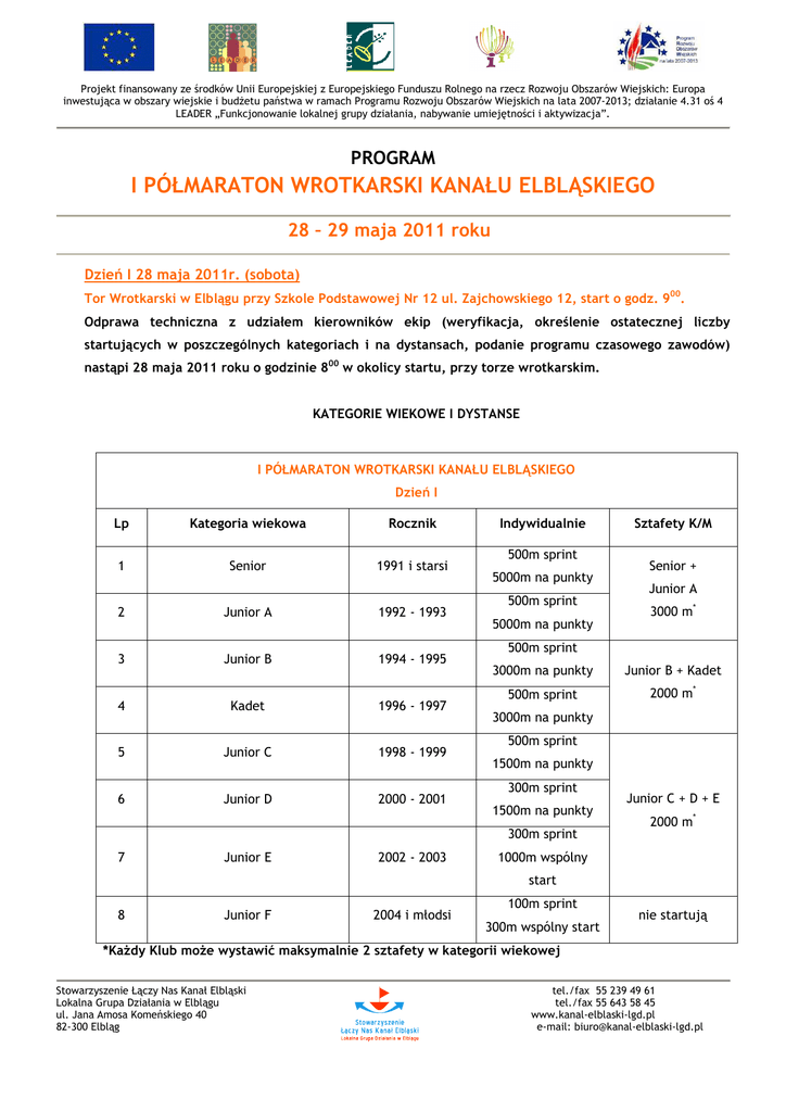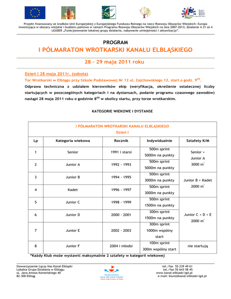 Projekt finansowany ze środków Unii Europejskiej z Europejskiego Funduszu Rolnego na rzecz Rozwoju Obszarów Wiejskich: Europa inwestująca w obszary wiejskie i budżetu państwa w ramach Programu Rozwoju Obszarów Wiejskich na lata 2007-2013; działanie 4.31 oś 4 LEADER „Funkcjonowanie lokalnej grupy działania, nabywanie umiejętności i aktywizacja”. PROGRAM I PÓŁMARATON WROTKARSKI KANAŁU ELBLĄSKIEGO 28 – 29 maja 2011 roku Dzień I 28 maja 2011r. (sobota) Tor Wrotkarski w Elblągu przy Szkole Podstawowej Nr 12 ul. Zajchowskiego 12, start o godz. 900. Odprawa techniczna z udziałem kierowników ekip (weryfikacja, określenie ostatecznej liczby startujących w poszczególnych kategoriach i na dystansach, podanie programu czasowego zawodów) nastąpi 28 maja 2011 roku o godzinie 800 w okolicy startu, przy torze wrotkarskim. KATEGORIE WIEKOWE I DYSTANSE I PÓŁMARATON WROTKARSKI KANAŁU ELBLĄSKIEGO Dzień I Lp Kategoria wiekowa Rocznik 1 Senior 1991 i starsi 2 Junior A 1992 - 1993 3 Junior B 1994 - 1995 4 Kadet 1996 - 1997 5 Junior C 1998 - 1999 6 Junior D 2000 - 2001 Indywidualnie 500m sprint 5000m na punkty 500m sprint 5000m na punkty Sztafety K/M Senior + Junior A 3000 m* 500m sprint 3000m na punkty Junior B + Kadet 500m sprint 2000 m* 3000m na punkty 500m sprint 1500m na punkty 300m sprint 1500m na punkty Junior C + D + E 2000 m* 300m sprint 7 Junior E 2002 - 2003 1000m wspólny start 8 Junior F 2004 i młodsi 100m sprint 300m wspólny start nie startują *Każdy Klub może wystawić maksymalnie 2 sztafety w kategorii wiekowej Stowarzyszenie Łączy Nas Kanał Elbląski Lokalna Grupa Działania w Elblągu ul. Jana Amosa Komeńskiego 40 82-300 Elbląg tel./fax 55 239 49 61 tel./fax 55 643 58 45 www.kanal-elblaski-lgd.pl e-mail: [email protected] Projekt finansowany ze środków Unii Europejskiej z Europejskiego Funduszu Rolnego na rzecz Rozwoju Obszarów Wiejskich: Europa inwestująca w obszary wiejskie i budżetu państwa w ramach Programu Rozwoju Obszarów Wiejskich na lata 2007-2013; działanie 4.31 oś 4 LEADER „Funkcjonowanie lokalnej grupy działania – aktywizacja i nabywanie umiejętności”. Instytucją Zarządzającą jest Ministerstwo Rolnictwa i Rozwoju Wsi. Dzień II 29 maja 2011r. (niedziela) Baza Rekreacyjno – Biwakowa przy dolnym stanowisku pochylni Buczyniec, start o godz. 1000. Odprawa techniczna z udziałem kierowników ekip (weryfikacja, określenie ostatecznej liczby startujących w poszczególnych kategoriach i na dystansach, podanie programu czasowego zawodów) nastąpi 29 maja 2011 roku o godzinie 900 w okolicy startu, w Bazie Rekreacyjno-Biwakowej przy pochylni Buczyniec. KATEGORIE WIEKOWE I DYSTANSE I PÓŁMARATON WROTKARSKI KANAŁU ELBLĄSKIEGO Dzień II Lp Kategoria wiekowa Rocznik Dystans 1 Senior 1991 i starsi 2 Junior A 1992 - 1993 3 Junior B 1994 - 1995 4 Kadet 1996 - 1997 5 Junior C 1998 - 1999 6000 m 6 Junior D 2000 - 2001 3000 m 7 Junior E 2002 - 2003 1500 m 8 Junior F 2004 i młodsi 1000 m 21000 m Stowarzyszenie Łączy Nas Kanał Elbląski Lokalna Grupa Działania w Elblągu ul. Jana Amosa Komeńskiego 40 82-300 Elbląg tel./fax 55 239 49 61 tel./fax 55 643 58 45 www.kanal-elblaski-lgd.pl e-mail: [email protected]