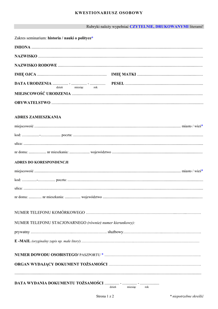 KWESTIONARI USZ OSOBOWY Rubryki należy wypełniać CZYTELNIE, DRUKOWANYMI literami! Zakres seminarium: historia / nauki o polityce* IMIONA ........................................................................................................................................................................................... NAZWISKO .................................................................................................................................................................................... NAZWISKO RODOWE .............................................................................................................................................................. IMIĘ OJCA ............................................................................ IMIĘ MATKI ........................................................................ DATA URODZENIA ................. - ................. - ................. PESEL ..................................................................................... dzień miesiąc rok MIEJSCOWOŚĆ URODZENIA ............................................................................................................................................... OBYWATELSTWO ...................................................................................................................................................................... ADRES ZAMIESZKANIA miejscowość ................................................................................................................................................................ miasto / wieś* kod: ...................-...................... poczta: .............................................................................................................................................. ulica: .................................................................................................................................................................................................... nr domu: ................... nr mieszkania: ...................... województwo ................................................................................................... ADRES DO KORESPONDENCJI miejscowość ................................................................................................................................................................ miasto / wieś* kod: ................-................... poczta: .................................................................................................................................................... ulica: .................................................................................................................................................................................................... nr domu: .............. nr mieszkania: ................. województwo ............................................................................................................. NUMER TELEFONU KOMÓRKOWEGO ………………………………………………………………...……...………… NUMER TELEFONU STACJONARNEGO (również numer kierunkowy): prywatny ……………………………..………………………. służbowy……………………….…..………….………………. E -MAIL (oryginalny zapis np. małe litery) …………………………………….……………………………………………… NUMER DOWODU OSOBISTEGO/ PASZPORTU * ……………………………………………………………………. ORGAN WYDAJĄCY DOKUMENT TOŻSAMOŚCI …………………………………………………………………. ............................................................................................................................................................................................................ DATA WYDANIA DOKUMENTU TOŻSAMOŚCI ................ - ................ - ..................... dzień Strona 1 z 2 miesiąc rok * niepotrzebne skreślić STOPIEŃ ZNAJOMOŚCI JĘZYKÓW OBCYCH: język angielski: - podstawowy - zaawansowany* język niemiecki: - podstawowy - zaawansowany* język francuski: - podstawowy - zaawansowany* język rosyjski: - podstawowy - zaawansowany* inny: ……………….……… - podstawowy - zaawansowany* OŚWIADCZENIE Oświadczam, że zostałem/zostałam poinformowany/poinformowana o przetwarzaniu moich danych osobowych przez Akademię Humanistyczną im. Aleksandra Gieysztora, o prawie wglądu do moich danych oraz ich poprawiania. Wyrażam zgodę na wykorzystywanie i przetwarzanie moich danych osobowych zgodnie z Ustawą o ochronie danych osobowych z dn. 29.08.1997 r. (Dz.U. nr 133 poz. 833, z późn. zm.) dla potrzeb niezbędnych do przeprowadzenia rekrutacji, realizacji procesu dydaktycznego, na umieszczanie niezbędnych danych na tablicach informacyjnych i stronach internetowych Akademii. Prawidłowość danych zawartych w kwestionariuszu potwierdzam własnoręcznym podpisem. Oświadczam, że zapoznałem/zapoznałam się z Regulaminem przyjęć na seminaria doktorskie oraz Zasadami organizacji seminariów doktorskich obowiązującymi w Akademii, które znajdują się na stronie www.ah.edu.pl, w dziekanatach oraz w Biurze Rektora. Pułtusk, dnia.............................................. podpis kandydata........................................................................................ Akademia Humanistyczna im. Aleksandra Gieysztora zabezpiecza dane osobowe przed ich udostępnieniem osobom nieupoważnionym zgodnie z Ustawą z dnia 29.08.1997 r. o ochronie danych osobowych (Dz.U. Nr 133, poz. 883). Strona 2 z 2 * niepotrzebne skreślić