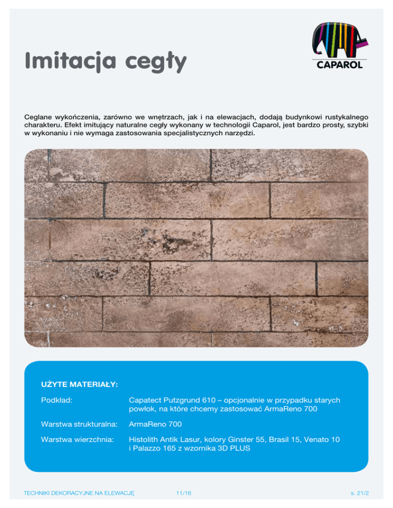 Imitacja cegły Ceglane wykończenia, zarówno we wnętrzach, jak i na elewacjach, dodają budynkowi rustykalnego charakteru. Efekt imitujący naturalne cegły wykonany w technologii Caparol, jest bardzo prosty, szybki w wykonaniu i nie wymaga zastosowania specjalistycznych narzędzi. UŻYTE MATERIAŁY: Podkład: Capatect Putzgrund 610 – opcjonalnie w przypadku starych powłok, na które chcemy zastosować ArmaReno 700 Warstwa strukturalna: ArmaReno 700 Warstwa wierzchnia: Histolith Antik Lasur, kolory Ginster 55, Brasil 15, Venato 10 i Palazzo 165 z wzornika 3D PLUS TECHNIKI DEKORACYJNE NA ELEWACJĘ 11/16 s. 21/2 Imitacja cegły krok po kroku KROK 1 Na przygotowaną wcześniej warstwę zbrojącą ocieplenia elewacji, za pomocą pacy z grzebieniem o wysokości 6 mm, nanieść ArmaReno 700 na grubość 3 mm. Następnie wygładzić szeroką pacą w trakcie utwardzania (opis przygotowania materiału karta techniczna nr 700). KROK 2 W zależności od warunków pogodowych (po około 30 minutach od nałożenia w temperaturze 20°C ), za pomocą pacy trawiastej nakłuwać nieregularnie powierzchnię wcześniej nałożonej masy ArmaReno 700. KROK 3 Od razu po tej czynności, jeszcze raz szeroką pacą wygładzić całą powierzchnię do uzyskania oczekiwanego efektu – nie eliminować wszystkich nakłuwanych otworów. Zostawić do wyschnięcia (wysychanie 1 mm na dobę). KROK 4 Po 12 godzinach od nałożenia możemy dokonać tzw. podziału na poszczególne elementy, imitujące cegłę, kamień itp. Posługując się poziomicą i nożykiem naciąć ArmaReno 700, a następnie krawędzią ostrego narzędzia np. kielni, poszerzać nacięcia. KROK 5 Po wyschnięciu powierzchni strukturalnej ArmaReno 700, za pomocą pędzli nałożyć lazurę Histolith Antik Lasur, kolory Ginster 55, Brasil 15, Venato 10 i Palazzo 165 (wzornik 3D PLUS). Lazura powinna być rozcieńczona 5%-15% środkiem Sylitol Konzentrat 111. W przypadku dużych powierzchni zaleca się wykonywać prace w kilka osób, stosując metodę „mokre w mokre”. Natychmiast po nałożeniu lazury, wilgotnymi gąbkami rozetrzeć i wymodelować kolorystycznie powierzchnię. Poznaj pozostałe techniki dekoracji elewacji na www.caparol.pl TECHNIKI DEKORACYJNE NA ELEWACJĘ 11/16 s. 22/2