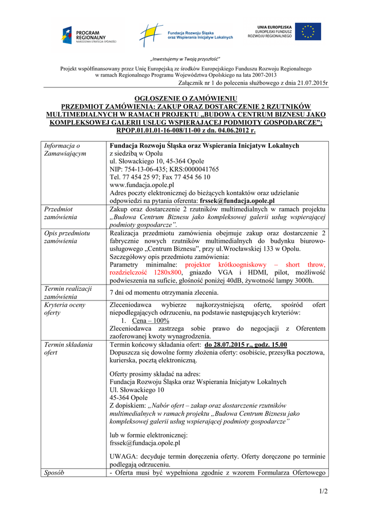 „Inwestujemy w Twoją przyszłość” Projekt współfinansowany przez Unię Europejską ze środków Europejskiego Funduszu Rozwoju Regionalnego w ramach Regionalnego Programu Województwa Opolskiego na lata 2007-2013 Załącznik nr 1 do polecenia służbowego z dnia 21.07.2015r OGŁOSZENIE O ZAMÓWIENIU PRZEDMIOT ZAMÓWIENIA: ZAKUP ORAZ DOSTARCZENIE 2 RZUTNIKÓW MULTIMEDIALNYCH W RAMACH PROJEKTU „BUDOWA CENTRUM BIZNESU JAKO KOMPLEKSOWEJ GALERII USŁUG WSPIERAJĄCEJ PODMIOTY GOSPODARCZE”; RPOP.01.01.01-16-008/11-00 z dn. 04.06.2012 r. Informacja o Zamawiającym Przedmiot zamówienia Opis przedmiotu zamówienia Termin realizacji zamówienia Kryteria oceny oferty Termin składania ofert Fundacja Rozwoju Śląska oraz Wspierania Inicjatyw Lokalnych z siedzibą w Opolu ul. Słowackiego 10, 45-364 Opole NIP: 754-13-06-435; KRS:0000041765 Tel. 77 454 25 97; Fax 77 454 56 10 www.fundacja.opole.pl Adres poczty elektronicznej do bieżących kontaktów oraz udzielanie odpowiedzi na pytania oferenta: [email protected] Zakup oraz dostarczenie 2 rzutników multimedialnych w ramach projektu „Budowa Centrum Biznesu jako kompleksowej galerii usług wspierającej podmioty gospodarcze”. Realizacja przedmiotu zamówienia obejmuje zakup oraz dostarczenie 2 fabrycznie nowych rzutników multimedialnych do budynku biurowousługowego „Centrum Biznesu”, przy ul.Wrocławskiej 133 w Opolu. Szczegółowy opis przedmiotu zamówienia: Parametry minimalne: projektor krótkoogniskowy – short throw, rozdzielczość 1280x800, gniazdo VGA i HDMI, pilot, możliwość podwieszenia na suficie, głośność poniżej 40dB, żywotność lampy 3000h. 7 dni od momentu otrzymania zlecenia. Zleceniodawca wybierze najkorzystniejszą ofertę, spośród ofert niepodlegających odrzuceniu, na podstawie następujących kryteriów: 1. Cena – 100% Zleceniodawca zastrzega sobie prawo do negocjacji z Oferentem zaoferowanej kwoty wynagrodzenia. Termin końcowy składania ofert: do 28.07.2015 r., godz. 15.00 Dopuszcza się dowolne formy złożenia oferty: osobiście, przesyłka pocztowa, kurierska, pocztą elektroniczną. Oferty prosimy składać na adres: Fundacja Rozwoju Śląska oraz Wspierania Inicjatyw Lokalnych Ul. Słowackiego 10 45-364 Opole Z dopiskiem: „Nabór ofert – zakup oraz dostarczenie rzutników multimedialnych w ramach projektu „Budowa Centrum Biznesu jako kompleksowej galerii usług wspierającej podmioty gospodarcze” lub w formie elektronicznej: [email protected] Sposób UWAGA: decyduje termin doręczenia oferty. Oferty doręczone po terminie podlegają odrzuceniu. - Oferta musi być wypełniona zgodnie z wzorem Formularza Ofertowego 1/2 „Inwestujemy w Twoją przyszłość” Projekt współfinansowany przez Unię Europejską ze środków Europejskiego Funduszu Rozwoju Regionalnego w ramach Regionalnego Programu Województwa Opolskiego na lata 2007-2013 Załącznik nr 1 do polecenia służbowego z dnia 21.07.2015r przygotowania oferty stanowiącego Załącznik nr 2 do niniejszego ogłoszenia o zamówieniu. - Każdy Oferent może złożyć jedną ofertę, sporządzoną w sposób czytelny w języku polskim; Uwaga: Zamawiający zastrzega, iż w toku sprawdzania dokumentów, w przypadkach tego wymagających będzie miał prawo żądać od Oferentów wyjaśnień/uzupełnień dotyczących złożonych dokumentów i treści oferty. Forma płatności Przelew na podstawie Faktury VAT. Termin oraz szczegóły zamówienia określać będą odrębne ustalenia po wyborze Oferenta. Między Zamawiającym a Wykonawcą zawarte zostanie Zlecenie określające szczegóły realizacji zamówienia. Informacje Negocjacje z Oferentami: dodatkowe - Zamawiający zastrzega sobie prawo do negocjacji z Oferentem, którego oferta zostanie wybrana oraz prawo do odstąpienia od zlecenia zamówienia, w przypadku nieuzyskania porozumienia w toku prowadzonych negocjacji; - Zamawiający jest uprawniony do wyboru kolejnej oferty w przypadku, gdy Oferent, którego oferta została wybrana, odmówi wykonania zlecenia; - Zamawiający zastrzega sobie prawo do odwołania zaproszenia i/lub odstąpienia od ewentualnych negocjacji bez podania przyczyny. Z tego tytułu Oferentowi nie przysługują żadne roszczenia wobec Zamawiającego. Odrzucenie Oferty: Zamawiający odrzuci ofertę, jeżeli: - treść oferty nie będzie zgodna z treścią niniejszego Ogłoszenia o zamówieniu; - jeżeli zostanie złożona przez Oferenta, który nie spełnia warunków udziału w postępowaniu; - została złożona po terminie ustalonym w niniejszym Ogłoszeniu, jako termin końcowy składania Ofert. - Zamawiający może odrzucić oferty zawierające rażąco wysokie oraz rażąco niskie ceny. Pozostałe: - Zamawiający zastrzega sobie prawo do modyfikacji Ogłoszenia przed terminem składania ofert oraz unieważnienia postępowania na każdym etapie postępowania bez podania przyczyny; - Zamawiający poinformuje Oferenta, którego oferta wybrana zostanie jako najkorzystniejsza, o fakcie wyboru Oferty. Opole, 21.07.2015 r. 2/2