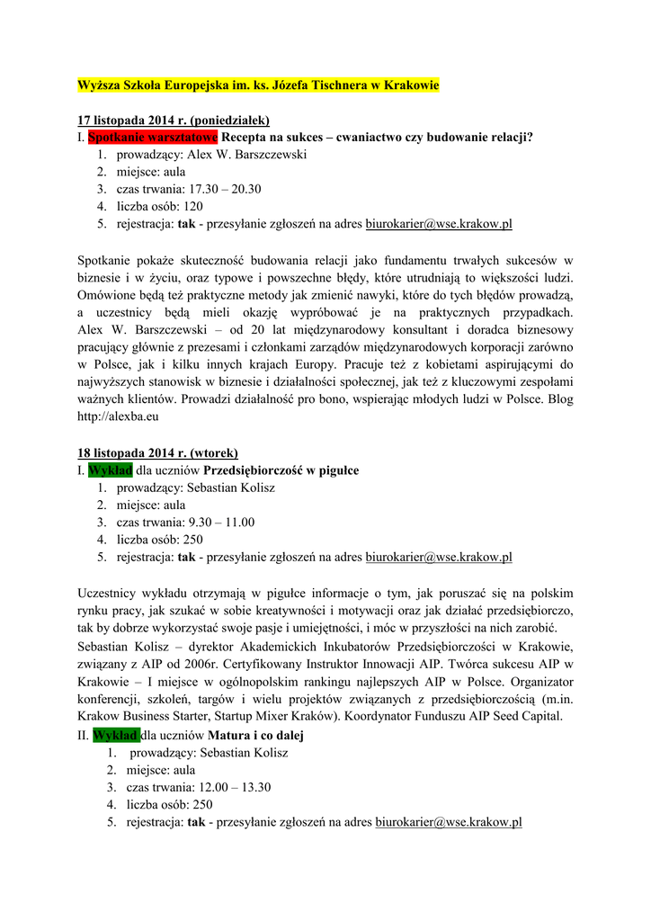 WyŜsza Szkoła Europejska im. ks. Józefa Tischnera w Krakowie 17 listopada 2014 r. (poniedziałek) I. Spotkanie warsztatowe Recepta na sukces – cwaniactwo czy budowanie relacji? 1. prowadzący: Alex W. Barszczewski 2. miejsce: aula 3. czas trwania: 17.30 – 20.30 4. liczba osób: 120 5. rejestracja: tak - przesyłanie zgłoszeń na adres [email protected] Spotkanie pokaŜe skuteczność budowania relacji jako fundamentu trwałych sukcesów w biznesie i w Ŝyciu, oraz typowe i powszechne błędy, które utrudniają to większości ludzi. Omówione będą teŜ praktyczne metody jak zmienić nawyki, które do tych błędów prowadzą, a uczestnicy będą mieli okazję wypróbować je na praktycznych przypadkach. Alex W. Barszczewski – od 20 lat międzynarodowy konsultant i doradca biznesowy pracujący głównie z prezesami i członkami zarządów międzynarodowych korporacji zarówno w Polsce, jak i kilku innych krajach Europy. Pracuje teŜ z kobietami aspirującymi do najwyŜszych stanowisk w biznesie i działalności społecznej, jak teŜ z kluczowymi zespołami waŜnych klientów. Prowadzi działalność pro bono, wspierając młodych ludzi w Polsce. Blog http://alexba.eu 18 listopada 2014 r. (wtorek) I. Wykład dla uczniów Przedsiębiorczość w pigułce 1. prowadzący: Sebastian Kolisz 2. miejsce: aula 3. czas trwania: 9.30 – 11.00 4. liczba osób: 250 5. rejestracja: tak - przesyłanie zgłoszeń na adres [email protected] Uczestnicy wykładu otrzymają w pigułce informacje o tym, jak poruszać się na polskim rynku pracy, jak szukać w sobie kreatywności i motywacji oraz jak działać przedsiębiorczo, tak by dobrze wykorzystać swoje pasje i umiejętności, i móc w przyszłości na nich zarobić. Sebastian Kolisz – dyrektor Akademickich Inkubatorów Przedsiębiorczości w Krakowie, związany z AIP od 2006r. Certyfikowany Instruktor Innowacji AIP. Twórca sukcesu AIP w Krakowie – I miejsce w ogólnopolskim rankingu najlepszych AIP w Polsce. Organizator konferencji, szkoleń, targów i wielu projektów związanych z przedsiębiorczością (m.in. Krakow Business Starter, Startup Mixer Kraków). Koordynator Funduszu AIP Seed Capital. II. Wykład dla uczniów Matura i co dalej 1. prowadzący: Sebastian Kolisz 2. miejsce: aula 3. czas trwania: 12.00 – 13.30 4. liczba osób: 250 5. rejestracja: tak - przesyłanie zgłoszeń na adres [email protected] Wykład przedstawia moŜliwości, jakie daje dziś młodym ludziom rynek pracy. Gdzie i co warto studiować oraz jak nie zmarnować najwaŜniejszego po maturze wieku na rozwój osobisty, czyli 18 – 24 lata. Co warto robić oprócz studiów, aby nie znaleźć się w grupie młodych bezrobotnych, a w przyszłości mieć szanse na większe zarobki. Sebastian Kolisz – dyrektor Akademickich Inkubatorów Przedsiębiorczości w Krakowie, związany z AIP od 2006 r. Certyfikowany Instruktor Innowacji AIP. Twórca sukcesu AIP w Krakowie – I miejsce w ogólnopolskim rankingu najlepszych AIP w Polsce. Organizator konferencji, szkoleń, targów i wielu projektów związanych z przedsiębiorczością (m.in. Krakow Business Starter, Startup Mixer Kraków). Koordynator Funduszu AIP Seed Capital. III. Warsztat coachingowy Jak zakochać się w pieniądzach i sprawić, by zakochały się w Tobie 1. prowadzący: Celestyna Osiak 2. miejsce: Celestyna Osiak 3. czas trwania: 17.30 – 20.30 4. liczba osób: 40 5. rejestracja: tak - przesyłanie zgłoszeń na adres [email protected] Czy masz tyle pieniędzy, ile potrzebujesz na swoje potrzeby i marzenia? Czy są źródłem frustracji, czy źródłem zadowolenia? Jeśli chcesz dowiedzieć się, jak nawiązać głęboką, ciepłą i Ŝyczliwą relację z pieniędzmi, by mieć ich stale pod dostatkiem zapraszamy na warsztat, prowadzony metodą Money Breakthrough Method, która pomaga w uzdrowieniu relacji z pieniędzmi, by w końcu zakończyć „dramat finansowy” i doświadczać radości z zarabiania, oszczędzania, inwestowani i wydawania pieniędzy! Celestyna Dominika Osiak -Business Coach dla kobiet przedsiębiorczych, certyfikowany Coach Erickson College. Soul Coach certyfikowany przez Denise Linn. Pierwszy Lider International Coach Federation w Krakowie, coach z ponad 1200 godzinami pracy coachingu z klientem i z ponad 20-letnim doświadczeniem w rozwoju osobistym. Jej motto Ŝyciowe brzmi: „JuŜ teraz kochaj siebie i prosperuj!”. Blog http://celestyna.pl 20 listopada 2014 r.(czwartek) I. Warsztat coachingowy Money Coaching - talenty za talenty 1. prowadzący: Celestyna Osiak 2. miejsce: aula 3. czas trwania: 17.30 – 20.30 4. liczba osób: 40 5. rejestracja: tak - przesyłanie zgłoszeń na adres [email protected] Poznaj swój typ finansowy i uwolnij się od wewnętrznych blokujących schematów finansowych. Znajomość Twojego typu finansowego pozwoli Ci odkryć Twoje mocne strony związane z zarządzaniem finansami, dzięki temu zaczniesz szybciej i łatwiej zarabiać, jednocześnie wykorzystując swoje najmocniejsze zasoby. Celestyna Dominika Osiak - Business Coach dla kobiet przedsiębiorczych, certyfikowany Coach Erickson College. Soul Coach certyfikowany przez Denise Linn. Pierwszy Lider International Coach Federation w Krakowie, coach z ponad 1200 godzinami pracy coachingu z klientem i z ponad 20-letnim doświadczeniem w rozwoju osobistym. Jej motto Ŝyciowe brzmi: „JuŜ teraz kochaj siebie i prosperuj!”. Blog http://celestyna.pl 22 listopada 2014 r.(sobota) I. Warsztat coachingowy Start Zmiana! 1. prowadzący: Aleksandra Sztąberska 2. miejsce: aula 3. czas trwania: 9.30 – 17.30 4. liczba osób: 20 5. rejestracja: tak - przesyłanie zgłoszeń na adres [email protected] Podczas zajęć nauczysz się, jak prawdziwie i dogłębnie wyznaczać swoje cele i ustalać priorytety. Podzielisz duŜe cele na mniejsze etapy. UłoŜysz realne, ale ciekawe plany działań, ustalisz pierwsze kroki. Aleksandra Sztąberska - specjalizuje się w szkoleniach i warsztatach z zakresu coac