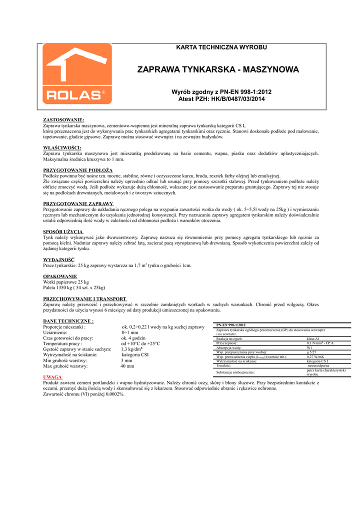 KARTA TECHNICZNA WYROBU ZAPRAWA TYNKARSKA - MASZYNOWA Wyrób zgodny z PN-EN 998-1:2012 Atest PZH: HK/B/0487/03/2014 ZASTOSOWANIE: Zaprawa tynkarska maszynowa, cementowo-wapienna jest mineralną zaprawa tynkarską kategorii CS I, która przeznaczona jest do wykonywania prac tynkarskich agregatami tynkarskimi oraz ręcznie. Stanowi doskonałe podłoże pod malowanie, tapetowanie, gładzie gipsowe. Zaprawę można stosować wewnątrz i na zewnątrz budynków. WŁAŚCIWOŚCI: Zaprawa tynkarska maszynowa jest mieszanką produkowaną na bazie cementu, wapna, piasku oraz dodatków uplastyczniających. Maksymalna średnica kruszywa to 1 mm. PRZYGOTOWANIE PODŁOŻA Podłoże powinno być nośne tzn. mocne, stabilne, równe i oczyszczone kurzu, brudu, resztek farby olejnej lub emulsyjnej. Źle związane części powierzchni należy uprzednio odkuć lub usunąć przy pomocy szczotki stalowej. Przed tynkowaniem podłoże należy obficie zmoczyć wodą. Jeśli podłoże wykazuje dużą chłonność, wskazane jest zastosowanie preparatu gruntującego. Zaprawy tej nie stosuje się na podłożach drewnianych, metalowych i z tworzyw sztucznych. PRZYGOTOWANIE ZAPRAWY Przygotowanie zaprawy do nakładania ręcznego polega na wsypaniu zawartości worka do wody ( ok. 5÷5,5l wody na 25kg ) i wymieszaniu ręcznym lub mechanicznym do uzyskania jednorodnej konsystencji. Przy narzucaniu zaprawy agregatem tynkarskim należy doświadczalnie ustalić odpowiednią ilość wody w zależności od chłonności podłoża i warunków otoczenia. SPOSÓB UŻYCIA Tynk należy wykonywać jako dwuwarstwowy. Zaprawę narzuca się równomiernie przy pomocy agregatu tynkarskiego lub ręcznie za pomocą kielni. Nadmiar zaprawy należy zebrać łatą, zacierać pacą styropianową lub drewnianą. Sposób wykończenia powierzchni zależy od żądanej kategorii tynku. WYDAJNOŚĆ Prace tynkarskie: 25 kg zaprawy wystarcza na 1,7 m2 tynku o grubości 1cm. OPAKOWANIE Worki papierowe 25 kg Paleta 1350 kg ( 54 szt. x 25kg) PRZECHOWYWANIE I TRANSPORT Zaprawę należy przewozić i przechowywać w szczelnie zamkniętych workach w suchych warunkach. Chronić przed wilgocią. Okres przydatności do użycia wynosi 6 miesięcy od daty produkcji umieszczonej na opakowaniu. DANE TECHNICZNE : Proporcje mieszanki : Uziarnienie: Czas gotowości do pracy: Temperatura pracy : Gęstość zaprawy w stanie suchym: Wytrzymałość na ściskanie: Min grubość warstwy: Max grubość warstwy: ok. 0,2÷0,22 l wody na kg suchej zaprawy 0÷1 mm ok. 4 godzin od +10°C do +25°C 1,3 kg/dm³ kategoria CSI 3 mm 40 mm PN-EN 998-1:2012 Zaprawa tynkarska ogólnego przeznaczenia (GP) do stosowania wewnątrz i na zewnatrz. Reakcja na ogień: klasa A1 Przyczepność: 0,1 N/mm² - FP:A Absorpcja wody: W1 Wsp. przepuszczania pary wodnej: μ 5/27 Wsp. przewodzenia ciepła (λ10,dry) (wartość tab.) 0,27 W/mK Wytrzymałość na ściskanie: kategoria CS I Trwałość: mrozoodporna patrz karta charakterystyki Substancje niebezpieczne: wyrobu UWAGA Produkt zawiera cement portlandzki i wapno hydratyzowane. Należy chronić oczy, skórę i błony śluzowe. Przy bezpośrednim kontakcie z oczami, przemyć dużą ilością wody i skonsultować się z lekarzem. Stosować odpowiednie ubranie i rękawice ochronne. Zawartość chromu (VI) poniżej 0,0002%.