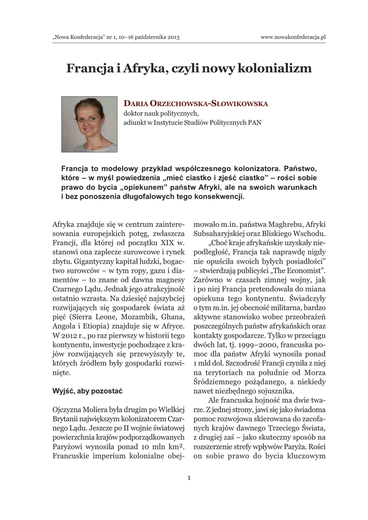 „Nowa Konfederacja” nr 1, 10–16 października 2013 www.nowakonfederacja.pl Francja i Afryka, czyli nowy kolonializm DAriA OrzechOwskA-słOwikOwskA doktor nauk politycznych, adiunkt w Instytucie Studiów Politycznych PAN Francja to modelowy przykład współczesnego kolonizatora. Państwo, które – w myśl powiedzenia „mieć ciastko i zjeść ciastko” – rości sobie prawo do bycia „opiekunem” państw Afryki, ale na swoich warunkach i bez ponoszenia długofalowych tego konsekwencji. Afryka znajduje się w centrum zainteresowania europejskich potęg, zwłaszcza Francji, dla której od początku XIX w. stanowi ona zaplecze surowcowe i rynek zbytu. Gigantyczny kapitał ludzki, bogactwo surowców – w tym ropy, gazu i diamentów – to znane od dawna magnesy Czarnego Lądu. Jednak jego atrakcyjność ostatnio wzrasta. Na dziesięć najszybciej rozwijających się gospodarek świata aż pięć (Sierra Leone, Mozambik, Ghana, Angola i Etiopia) znajduje się w Afryce. W 2012 r., po raz pierwszy w historii tego kontynentu, inwestycje pochodzące z krajów rozwijających się przewyższyły te, których źródłem były gospodarki rozwinięte. mowało m.in. państwa Maghrebu, Afryki Subsaharyjskiej oraz Bliskiego Wschodu. „Choć kraje afrykańskie uzyskały niepodległość, Francja tak naprawdę nigdy nie opuściła swoich byłych posiadłości” – stwierdzają publicyści „The Economist”. Zarówno w czasach zimnej wojny, jak i po niej Francja pretendowała do miana opiekuna tego kontynentu. Świadczyły o tym m.in. jej obecność militarna, bardzo aktywne stanowisko wobec przeobrażeń poszczególnych państw afrykańskich oraz kontakty gospodarcze. Tylko w przeciągu dwóch lat, tj. 1999–2000, francuska pomoc dla państw Afryki wynosiła ponad 1 mld dol. Szczodrość Francji czyniła z niej na terytoriach na południe od Morza Śródziemnego pożądanego, a niekiedy nawet niezbędnego sojusznika. Ale francuska hojność ma dwie twarze. Z jednej strony, jawi się jako świadoma pomoc rozwojowa skierowana do zacofanych krajów dawnego Trzeciego Świata, z drugiej zaś – jako skuteczny sposób na rozszerzenie strefy wpływów Paryża. Rości on sobie prawo do bycia kluczowym Wyjść, aby pozostać Ojczyzna Moliera była drugim po Wielkiej Brytanii największym kolonizatorem Czarnego Lądu. Jeszcze po II wojnie światowej powierzchnia krajów podporządkowanych Paryżowi wynosiła ponad 10 mln km². Francuskie imperium kolonialne obej1 „Nowa Konfederacja” nr 1, 10–16 października 2013 www.nowakonfederacja.pl aktorem na scenie afrykańskiej. W myśl powiedzenia „wyjść, aby pozostać”, Francja z kolonizatora stała się neokolonizatorem. Co to oznacza? Współczesną formę kolonializmu, polegającą na wyzysku gospodarczym i uzależnieniu politycznym będących jego przedmiotem krajów. A także politykę prowadzoną przez byłe metropolie, które starają się utrzymać decydującą pozycję w dawnych koloniach przez pozostawienie części własnej kadry urzędniczej, wojskowej, popieranie uległych polityków, a przede wszystkim przez podporządkowanie rozwoju lokalnej gospodarki swoim interesom. eksport (10 mln euro, będące 0.002 proc. całego importu) i zaledwie na 165., jeśli chodzi o import (280 mln i 0,065 proc. udziału). Jednym z negatywnych skutków neokolonializmu będzie wzrost działalności islamskich fundamen- talistów w europie jako wyraz sprzeciwu wobec imperialnej zachłanności Obrona pokoju czy interesów? zachodu Zaangażowanie Paryża w wydarzenia arabskiej wiosny, czyli interwencja zbrojna w Mali, jest tego przykładem. „Francja wraca do Mali, czyli neokolonializm 2.0”, „Mali – neokolonią Francji” „Francja – współczesny kolonizator państw afrykańskich” – to tylko niektóre tytuły z pierwszych stron europejskich dzienników oceniających zaangażowanie Paryża w arabską wiosnę. Od stycznia do marca 2013 r. wojska francuskie prowadziły interwencję zbrojną w Mali przeciwko islamistom. Jeszcze dziesięć lat temu lewica znad Sekwany i z reszty Europy byłaby taką interwencją oburzona. Tymczasem ostatniej kampanii patronował prezydent socjalista, nie napotykając oporu w swoim obozie politycznym. „Francja nie broni niczyich interesów gospodarczych w Mali, Francja broni pokoju” – odpierał zarzuty prezydent François Hollande. Rzeczywiście, Mali jest dla Paryża mało interesujące pod względem gospodarczym. Według danych francuskiego MSZ kraj ten znajduje się dopiero na 87. pozycji, jeśli chodzi o francuski Jednak już kraje sąsiadujące z Mali mają znaczenie strategiczne. Mowa tu o bogatej w złoża ropy i gazu Algierii oraz o Nigrze, z jego zasobami uranu eksploatowanymi przez Grupę Areva, francuski koncern z branży energetyki jądrowej. Stabilizacja w Mali pozwoliłaby ograniczyć niepokoje w całym regionie. Poprzez interwencję militarną Hollande miał nadzieję na utrzymanie historycznej strefy wpływów i mocarstwowej pozycji Francji w Afryce, której zagrażają obecnie rosnące apetyty Chin i Stanów Zjednoczonych. Zakłócenie porządku świata Czarny Ląd to gra o wielką stawkę. Nieposkromiony apetyt na lepsze jutro rosnącej w siłę tamtejszej klasy średniej, bezdyskusyjny potencjał wzrostu gospodarczego i przede wszystkim rynki zbytu i surowce naturalne – określają znaczenie tej gry, w której Francja chce zgarnąć jak najwięcej. 2 „Nowa Konfederacja” nr 1, 10–16 października 2013 www.nowakonfederacja.pl Dawny kolonializm polegał przede wszystkim na opanowaniu przez imperialne mocarstwa krajów słabo rozwiniętych, którego efektem były uzależnienie i wyzysk (monokulturowa gospodarka, nędza i zacofanie ludności tubylczej, nienaturalne granice krajów dzielące grupy etniczne, wstrzymane procesy narodowe, państwowotwórcze i społeczne). Współczesny neokolonializm działa inaczej: metodą wielopłaszczyznowych zależności, zwaną też metodą pene