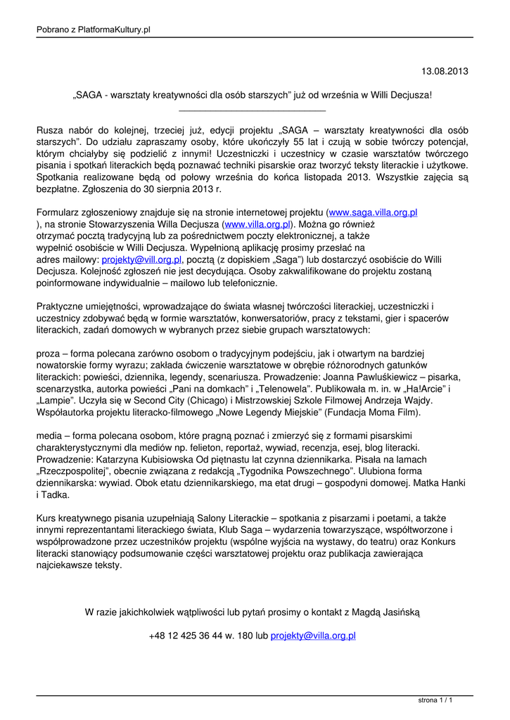 Pobrano z PlatformaKultury.pl 13.08.2013 „SAGA - warsztaty kreatywności dla osób starszych” już od września w Willi Decjusza! ____________________________ Rusza nabór do kolejnej, trzeciej już, edycji projektu „SAGA – warsztaty kreatywności dla osób starszych”. Do udziału zapraszamy osoby, które ukończyły 55 lat i czują w sobie twórczy potencjał, którym chciałyby się podzielić z innymi! Uczestniczki i uczestnicy w czasie warsztatów twórczego pisania i spotkań literackich będą poznawać techniki pisarskie oraz tworzyć teksty literackie i użytkowe. Spotkania realizowane będą od połowy września do końca listopada 2013. Wszystkie zajęcia są bezpłatne. Zgłoszenia do 30 sierpnia 2013 r. Formularz zgłoszeniowy znajduje się na stronie internetowej projektu (www.saga.villa.org.pl ), na stronie Stowarzyszenia Willa Decjusza (www.villa.org.pl). Można go również otrzymać pocztą tradycyjną lub za pośrednictwem poczty elektronicznej, a także wypełnić osobiście w Willi Decjusza. Wypełnioną aplikację prosimy przesłać na adres mailowy: [email protected], pocztą (z dopiskiem „Saga”) lub dostarczyć osobiście do Willi Decjusza. Kolejność zgłoszeń nie jest decydująca. Osoby zakwalifikowane do projektu zostaną poinformowane indywidualnie – mailowo lub telefonicznie. Praktyczne umiejętności, wprowadzające do świata własnej twórczości literackiej, uczestniczki i uczestnicy zdobywać będą w formie warsztatów, konwersatoriów, pracy z tekstami, gier i spacerów literackich, zadań domowych w wybranych przez siebie grupach warsztatowych: proza – forma polecana zarówno osobom o tradycyjnym podejściu, jak i otwartym na bardziej nowatorskie formy wyrazu; zakłada ćwiczenie warsztatowe w obrębie różnorodnych gatunków literackich: powieści, dziennika, legendy, scenariusza. Prowadzenie: Joanna Pawluśkiewicz – pisarka, scenarzystka, autorka powieści „Pani na domkach” i „Telenowela”. Publikowała m. in. w „Ha!Arcie” i „Lampie”. Uczyła się w Second City (Chicago) i Mistrzowskiej Szkole Filmowej Andrzeja Wajdy. Współautorka projektu literacko-filmowego „Nowe Legendy Miejskie” (Fundacja Moma Film). media – forma polecana osobom, które pragną poznać i zmierzyć się z formami pisarskimi charakterystycznymi dla mediów np. felieton, reportaż, wywiad, recenzja, esej, blog literacki. Prowadzenie: Katarzyna Kubisiowska Od piętnastu lat czynna dziennikarka. Pisała na lamach „Rzeczpospolitej”, obecnie związana z redakcją „Tygodnika Powszechnego”. Ulubiona forma dziennikarska: wywiad. Obok etatu dziennikarskiego, ma etat drugi – gospodyni domowej. Matka Hanki i Tadka. Kurs kreatywnego pisania uzupełniają Salony Literackie – spotkania z pisarzami i poetami, a także innymi reprezentantami literackiego świata, Klub Saga – wydarzenia towarzyszące, współtworzone i współprowadzone przez uczestników projektu (wspólne wyjścia na wystawy, do teatru) oraz Konkurs literacki stanowiący podsumowanie części warsztatowej projektu oraz publikacja zawierająca najciekawsze teksty. W razie jakichkolwiek wątpliwości lub pytań prosimy o kontakt z Magdą Jasińską +48 12 425 36 44 w. 180 lub [email protected] strona 1 / 1