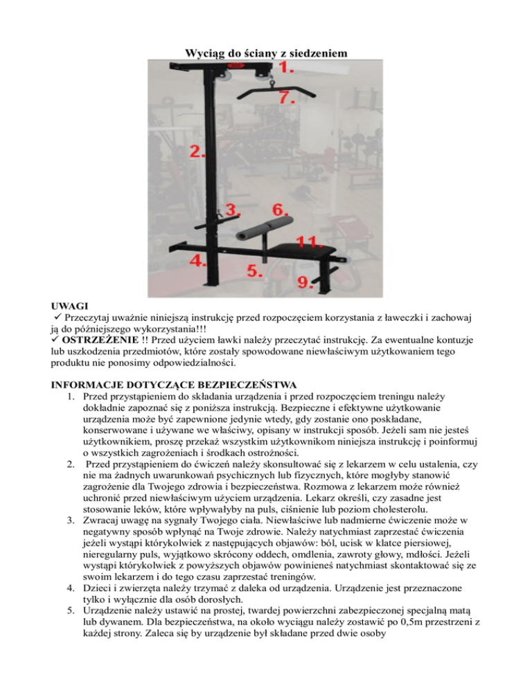 Wyciąg do ściany z siedzeniem UWAGI Przeczytaj uważnie niniejszą instrukcję przed rozpoczęciem korzystania z ławeczki i zachowaj ją do późniejszego wykorzystania!!! OSTRZEŻENIE !! Przed użyciem ławki należy przeczytać instrukcję. Za ewentualne kontuzje lub uszkodzenia przedmiotów, które zostały spowodowane niewłaściwym użytkowaniem tego produktu nie ponosimy odpowiedzialności. INFORMACJE DOTYCZĄCE BEZPIECZEŃSTWA 1. Przed przystąpieniem do składania urządzenia i przed rozpoczęciem treningu należy dokładnie zapoznać się z poniższa instrukcją. Bezpieczne i efektywne użytkowanie urządzenia może być zapewnione jedynie wtedy, gdy zostanie ono poskładane, konserwowane i używane we właściwy, opisany w instrukcji sposób. Jeżeli sam nie jesteś użytkownikiem, proszę przekaż wszystkim użytkownikom niniejsza instrukcję i poinformuj o wszystkich zagrożeniach i środkach ostrożności. 2. Przed przystąpieniem do ćwiczeń należy skonsultować się z lekarzem w celu ustalenia, czy nie ma żadnych uwarunkowań psychicznych lub fizycznych, które mogłyby stanowić zagrożenie dla Twojego zdrowia i bezpieczeństwa. Rozmowa z lekarzem może również uchronić przed niewłaściwym użyciem urządzenia. Lekarz określi, czy zasadne jest stosowanie leków, które wpływałyby na puls, ciśnienie lub poziom cholesterolu. 3. Zwracaj uwagę na sygnały Twojego ciała. Niewłaściwe lub nadmierne ćwiczenie może w negatywny sposób wpłynąć na Twoje zdrowie. Należy natychmiast zaprzestać ćwiczenia jeżeli wystąpi którykolwiek z następujących objawów: ból, ucisk w klatce piersiowej, nieregularny puls, wyjątkowo skrócony oddech, omdlenia, zawroty głowy, mdłości. Jeżeli wystąpi którykolwiek z powyższych objawów powinieneś natychmiast skontaktować się ze swoim lekarzem i do tego czasu zaprzestać treningów. 4. Dzieci i zwierzęta należy trzymać z daleka od urządzenia. Urządzenie jest przeznaczone tylko i wyłącznie dla osób dorosłych. 5. Urządzenie należy ustawić na prostej, twardej powierzchni zabezpieczonej specjalną matą lub dywanem. Dla bezpieczeństwa, na około wyciągu należy zostawić po 0,5m przestrzeni z każdej strony. Zaleca się by urządzenie był składane przed dwie osoby 6. Nie dokręcaj śrub jeżeli urządzenie nie jest w pełni złożone 7. Przed przystąpieniem do ćwiczenia należy upewnić się, że wszystkie śruby i zakrętki są dokładnie dokręcone. 8. Zwracaj uwagę by podczas ćwiczeń nikt nie stał za blisko wyciągu. 9. Bezpieczeństwo sprzętu może być zagwarantowane tylko wtedy, jeżeli będzie on poddawany regularnym przeglądom i kontrolom. 10. Należy zawsze używać sprzętu zgodnie z jego przeznaczeniem. Jeżeli podczas montażu lub użytkowania któraś część okaże się wadliwa, lub wydaje niepokojące dźwięki, należy zaprzestać używania i oddać urządzenie do serwisu. Nie wolno używać uszkodzonego urządzenia. 11. Podczas treningu należy zakładać odpowiedni strój. Należy unikać luźnych strojów, które mogłyby zaczepiać się o urządzenie lub takich które mogłyby ograniczać lub uniemożliwiać ruchy. 12. Wyciąg przeznaczony jest do użytku domowego. Maksymalna dopuszczalna waga użytkownika wynosi 150 kg. 13. Urządzenie nie nadaje się do celów rehabilitacyjnych. 14. Należy zachować szczególną ostrożność podczas podnoszenia i przenoszenia urządzenia. Przenosić urządzenie powinny zawsze dwie osoby. 15. Podczas podnoszenia lub przenoszenia sprzętu należy zachować właściwą postawę, aby nie uszkodzić kręgosłupa. 16. Montując urządzenie należy ściśle stosować się do załączonej instrukcji i używać tylko części dołączonych do zestawu. Przed rozpoczęciem montażu, należy sprawdzić czy wszystkie części, które zawiera dołączona lista, znajdują się w zestawie. OSTRZEŻENIE: PRZED UŻYCIEM WYCIĄGU NALEŻY PRZECZYTAĆ INSTRUKCJĘ. ZA EWENTUALNE KONTUZJE LUB USZKODZENIA PRZEDMIOTÓW, KTÓRE ZOSTAŁY SPOWODOWANE NIEWŁAŚCIWYM UŻYTKOWANIEM TEGO PRODUKTU NIE PONOSIMY ODPOWIEDZIALNOŚCI. 17. Klasa użytkowania sprzętu H - użytkowanie w domach prywatnych. INSTRUKCJA MONTAŻU W zestawie : 1. bloczek górny wyciągu 2. słupek nośny 3. suwadło na ciężary 4. konstrukcja dolna 5. konstrukcja siedziska z bloczkiem dolnym 6. nadkloannik z gąbkami 7. uchwyt szeroki 100cm 8. uchwyt lekko wygięty 40cm 9. rurka/podpórka pod stopy 10. zestaw śrub i akcesoriów: 2 x linka, 3x kółko, 3x śruba M10x40 + nakrętki, 3x śruba M10x50 + nakrętki, 11x kołek montażowy 12x60mm, 11x wkręt M8x60mm, łańcuch, 2x haczyk, karabińczyk, 4x wkręt czarny 11. siedzisko tapicerowane Montaż 1. Przykręć słupek nośny do bloczka górnego śrubą M10x50mm 2. wsuń suwadło na ciężary haczykiem w stronę bloczka górnego 3. przykręć do słupka nośnego konstrukcję dolną śrubą M10x50mm 4. przykręć do konstrukcji dolnej konstrukcję siedziska 5. przykręć wkrętarką lub śrubokrętem siedzisko tapicerowane do konstrukcji siedziska czarnymi wkrętami 6. załóż linki i jednocześnie przykręcaj kółka do bloczka górnego śrubami M10x40mm 7. dokręć wszystkie śruby łączce kluczem fi17mm 8. przyłóż wyciąg do ściany ustawiając go za pomocą poziomicy idealnie w pionie 9. zaznacz otwory na ścianie i podłodze 10. w zaznaczonych miejscach wywierć otwory wiertłem fi12mm 11. w nawiercone otwory w ścianie i podłodze wbij kołki montażowe 12x60mm 12. przykręć wyciąg do ściany i podłogi wkrętami M8x60mm Instrukcja konserwacji i użytkowania Uwagi w czasie użytkowania W celu płynniejszego ruchu suwadła przesmaruj słupek nośny towotem lub smarem lub teflonem. Chcąc ćwiczyć na wyciągu dolnym w miejsce uchwytu na bloczku górnym załóż druga linkę i przepleć ją przez bloczek dolnym. !!! Kontroluj stan linki i wymień ją gdy widać jej lekki zużycie/ przetarcie. Maksymalny ciężar nakładany na suwadło w