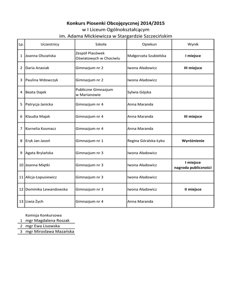 Konkurs Piosenki Obcojęzycznej 2014/2015 w I Liceum Ogólnokształcącym im. Adama Mickiewicza w Stargardzie Szczecińskim Lp. Uczestnicy Szkoła Opiekun Wynik 1 Joanna Olszańska Zespół Placówek Oświatowych w Chociwlu Małgorzata Szubielska I miejsce 2 Daria Anasiak Gimnazjum nr 2 Iwona Aładowicz III miejsce 3 Paulina Wdowczyk Gimnazjum nr 2 Iwona Aładowicz 4 Beata Dajek Publiczne Gimnazjum w Marianowie Sylwia Gójska 5 Patrycja Janicka Gimnazjum nr 4 Anna Maranda 6 Klaudia Majak Gimnazjum nr 4 Anna Maranda 7 Kornelia Kosmacz Gimnazjum nr 4 Anna Maranda 8 Eryk Jan Jasoń Gimnazjum nr 1 Regina Góralska-Łyko 9 Agata Brylańska Gimnazjum nr 3 Iwona Aładowicz 10 Joanna Miętki Gimnazjum nr 3 Iwona Aładowicz 11 Alicja Łopusiewicz Gimnazjum nr 3 Iwona Aładowicz 12 Dominika Lewandowska Gimnazjum nr 3 Iwona Aładowicz 13 Liwia Żych Gimnazjum nr 4 Anna Maranda Komisja Konkursowa 1 mgr Magdalena Roszak 2 mgr Ewa Lisowska 3 mgr Mirosława Mazańska III miejsce Wyróżnienie I miejsce nagroda publiczności II miejsce