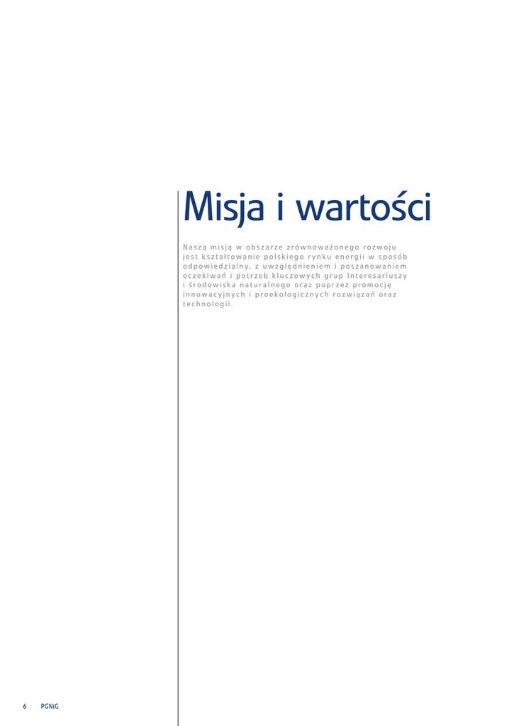Misja i wartości Naszą misją w obszarze zrównoważonego rozwoju jest kształtowanie polskiego rynku energii w sposób o d p o w i e d z i a l n y, z u w z g l ę d n i e n i e m i p o s z a n o w a n i e m oczekiwań i potrzeb kluczowych grup Interesariuszy i środowiska naturalnego oraz poprzez promocję innowacyjnych i proekologicznych rozwiązań oraz technologii. 6 PGNiG Wiarygodność to długotrwałe i konsekwentne budowanie wysokiej kultury komunikacji, opartej o zasady dialogu, stymulującej atmosferę zaufania wśród wszystkich n a s z y c h i n t e r e s a r i u s z y. Odpowiedzialność Jakość to podstawa codziennego działania wszystkich pracowników PGNiG, niezależnie od zajmowanego stanowiska, a jednocześnie wyzwanie, które mobilizuje nas do dbania o wspólne dobro. Partnerstwo to stałe doskonalenie naszych produktów i poziomu świadczonych usług poprzez wdrażanie nowoczesnych technologii, usprawnianie systemów zarządzania i kształtowanie etycznego środowiska w PGNiG SA, w zgodzie z aspiracjami naszych k l i e n t ó w, p r a c o w n i k ó w i w s z y s t k i c h p a r t n e r ó w. to budowanie trwałych, opartych na wzajemnym zaufaniu i obopólnie korzystnych relacji, w ramach PGNiG – z pracownikami i organizacjami związkowymi oraz na zewnątrz – z klientami, społecznościami lokalnymi i innymi uczestnikami rynku. Odpowiedzialna energia 7