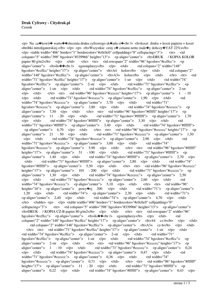 Druk Cyfrowy - Citydruk.pl Cennik <p> Na ca�kowit� warto��zlecenia druku cyfrowego sk�ada si�<br /> <b>koszt druku + koszt papieru + koszt obróbki introligatorskiej.</b> </p> <p> <b>Wszystkie ceny s� cenami netto (nale�y doliczy�VAT 22%)</b> </p> <table width="406" border="1" bordercolor="#c0c0c0" cellpadding="0" cellspacing="3"> <tr> <td colspan="5" width="398" bgcolor="#339966" height="13"> <p align="center"> <b>DRUK / KOPIA KOLOR papier 80 g/m2</b> </p> </td> </tr> <tr> <td rowspan="2" width="96" bgcolor="#ccffcc"> <p align="center"> <b>ilo��<br /> egzemplarzy</b> </p> </td> <td colspan="2" width="148" bgcolor="#ccffcc" height="17"> <p align="center"> <b>A4 kolor</b> </p> </td> <td colspan="2" width="148" bgcolor="#ccffcc"> <p align="center"> <b>A3+ kolor</b> </p> </td> </tr> <tr> <td width="71" bgcolor="#ccffcc" height="17"> <p align="center"> 1-str </p> </td> <td width="74" bgcolor="#ccffcc"> <p align="center"> 2-str </p> </td> <td width="71" bgcolor="#ccffcc"> <p align="center"> 1-str </p> </td> <td width="74" bgcolor="#ccffcc"> <p align="center"> 2-str </p> </td> </tr> <tr> <td width="96" bgcolor="#cccccc" height="17"> <p align="center"> 1 - 10 </p> </td> <td width="71" bgcolor="#cccccc"> <p align="center"> 1,90 </p> </td> <td width="74" bgcolor="#cccccc"> <p align="center"> 3,70 </p> </td> <td width="71" bgcolor="#cccccc"> <p align="center"> 3,80 </p> </td> <td width="74" bgcolor="#cccccc"> <p align="center"> 7,50 </p> </td> </tr> <tr> <td width="96" bgcolor="#ffffff" height="17"> <p align="center"> 11 - 20 </p> </td> <td width="71" bgcolor="#ffffff"> <p align="center"> 1,70 </p> </td> <td width="74" bgcolor="#ffffff"> <p align="center"> 3,30 </p> </td> <td width="71" bgcolor="#ffffff"> <p align="center"> 3,40 </p> </td> <td width="74" bgcolor="#ffffff"> <p align="center"> 6,70 </p> </td> </tr> <tr> <td width="96" bgcolor="#cccccc" height="17"> <p align="center"> 21 - 50 </p> </td> <td width="71" bgcolor="#cccccc"> <p align="center"> 1,50 </p> </td> <td width="74" bgcolor="#cccccc"> <p align="center"> 2,90 </p> </td> <td width="71" bgcolor="#cccccc"> <p align="center"> 3,00 </p> </td> <td width="74" bgcolor="#cccccc"> <p align="center"> 5,90 </p> </td> </tr> <tr> <td width="96" bgcolor="#ffffff" height="17"> <p align="center"> 51 - 100 </p> </td> <td width="71" bgcolor="#ffffff"> <p align="center"> 1,40 </p> </td> <td width="74" bgcolor="#ffffff"> <p align="center"> 2,70 </p> </td> <td width="71" bgcolor="#ffffff"> <p align="center"> 2,80 </p> </td> <td width="74" bgcolor="#ffffff"> <p align="center"> 5,50 </p> </td> </tr> <tr> <td width="96" bgcolor="#cccccc" height="17"> <p align="center"> 101 - 200 </p> </td> <td width="71" bgcolor="#cccccc"> <p align="center"> 1,30 </p> </td> <td width="74" bgcolor="#cccccc"> <p align="center"> 2,50 </p> </td> <td width="71" bgcolor="#cccccc"> <p align="center"> 2,60 </p> </td> <td width="74" bgcolor="#cccccc"> <p align="center"> 5,10 </p> </td> </tr> <tr> <td width="96" height="16"> <p align="center"> powy�ej 200 </p> </td> <td width="71"> <p align="center"> 1,20 </p> </td> <td width="74"> <p align="center"> 2,30 </p> </td> <td width="71"> <p align="center"> 2,40 </p> </td> <td width="74"> <p align="center"> 4,70 </p> </td> </tr> </table> <p> </p> <table width="406" border="1" bordercolor="#c0c0c0" cellpadding="0" cellspacing="3"> <tr> <td colspan="5" width="398" bgcolor="#339966" height="13"> <p align="center"> <b>DRUK / KOPIA CZ-B papier 80 g/m2</b> </p> </td> </tr> <tr> <td rowspan="2" width="96" bgcolor="#ccffcc"> <p align="center"> <b>ilo��<br /> egzemplarzy</b> </p> </td> <td colspan="2" width="148" bgcolor="#ccffcc" height="17"> <p align="center"> <b>A4 cz-b</b> </p> </td> <td colspan="2" width="148" bgcolor="#ccffcc"> <p align="center"> <b>A3+ cz-b</b> </p> </td> </tr> <tr> <td width="71" bgcolor="#ccffcc" height="17"> <p align="center"> 1-str </p> </td> <td width="74" bgcolor="#ccffcc"> <p align="center"> 2-str </p> </td> <td width="71" bgcolor="#ccffcc"> <p align="center"> 1-str </p> </td> <td width="74" bgcolor="#ccffcc"> <p align="center"> 2-str </p> </td> </tr> <tr> <td width="96" bgcolor="#cccccc" height="17"> <p align="center"> 1 - 10 </p> </td> <td width="71" bgcolor="#cccccc"> <p align="center"> 0,24 </p> </td> <td width="74" bgcolor="#cccccc"> <p align="center"> 0,47 </p> </td> <td width="71" bgcolor="#cccccc"> <p align="center"> 0,36 </p> </td> <td width="74" bgcolor="#cccccc"> <p align="center"> 0,71 </p> </td> </tr> <tr> <td width="96" bgcolor="#ffffff" height="17"> <p align="center"> 11 - 20 </p> </td> <td width="71" bgcolor="#ffffff"> <p align="center"> 0,22 </p> </td> <td width="74" bgcolor="#ffffff"> <p align="center"> 0,43 </p> strona 1 / 3 Druk Cyfrowy - Citydruk.pl Cennik </td> <td width="71" bgcolor="#ffffff"> <p align="center"> 0,33 </p> </td> <td width="74" bgcolor="#ffffff"> <p align="center"> 0,65 </p> </td> </tr> <tr> <td width="96" bgcolor="#cccccc" height="17"> <p align="center"> 21 - 50 </p> </td> <td width="71" bgcolor="#cccccc"> <p align="center"> 0,20 </p> </td> <td width="74" bgcolor="#cccccc"> <p align="center"> 0,39 </p> </td> <td width="71" bgcolor="#cccccc"> <p align="center"> 0,30 </p> </td> <td width="74" bgcolor="#cccccc"> <p align="center"> 0,59 </p> </td> </tr> <tr> <td width="96" bgcolor="#ffffff" height="17"> <p align="center"> 51 - 100 </p> </td> <td width="71" bgcolor="#ffffff"> <p align="center"> 0,18 </p> </td> <td width="74" bgcolor="#ffffff"> <p align="center"> 0,37 </p> </td> <td width="71" bgcolor="#ffffff"> <p align="center"> 0,27 </p> </td> <td width="74" bgcolor="#ffffff"> <p align="center"> 0,53 </p> </td> </tr> <tr> <td width="96" bgcolor="#cccccc" height="16"> <p align="center"> Powy�ej 101 </p> </td> <td width="71" bgcolor="#cccccc"> <p align="center"> 0,16 </p> </td> <td width="74" bgcolor="#cccccc"> <p align="center"> 0,35 </p> </td> <td width="71" bgcolor="#cccccc"> <p align="center"> 0,24 </p> </td> <td width="74" bgcolor="#cccccc"> <p align