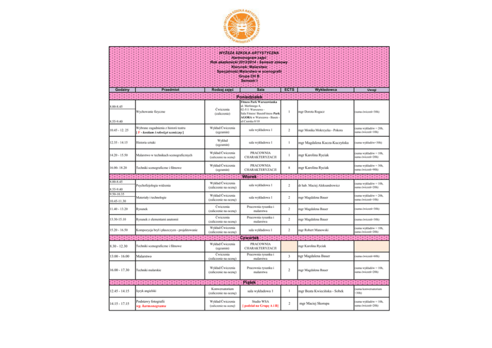WYŻSZA SZKOŁA ARTYSTYCZNA Harmonogram zajęć Rok akademicki 2013/2014 - Semestr zimowy Kierunek: Malarstwo Specjalność:Malarstwo w scenografii Grupa CH B Semestr I Godziny Przedmiot Rodzaj zajęć Sala ECTS Wykładowca Uwagi Poniedziałek 8.00-8.45 Wychowanie fizyczne Ćwiczenia (zaliczenie) Fitness Park Warszawianka ul. Merliniego 4, 02-511 Warszawa Sala Fitness/ BasenFitness Park AGORA w Warszawa - Basen ul.Czerska 8/10 1 mgr Dorota Rogacz (suma ćwiczeń=30h) Wykład/Ćwiczenia (egzamin) sala wykładowa 1 2 mgr Monika Mokrzycka - Pokora (suma wykładów = 20h, suma ćwiczeń=10h) Wykład (egzamin) sala wykładowa 1 1 mgr Magdalena Kucza-Kuczyńska (suma wykładów=30h) 8.55-9.40 10.45 - 12. 25 Wybrane zagadnienia z historii teatru [ F - kostium i rekwizyt sceniczny ] 12.35 - 14.15 Historia sztuki 14.20 - 15.50 Malarstwo w technikach scenograficznych Wykład/Ćwiczenia (zaliczenie na ocenę) PRACOWNIA CHARAKTERYZACJI 1 mgr Karolina Ryciak (suma wykładów = 10h, suma ćwiczeń=20h) 16.00- 18.20 Techniki scenograficzne i filmowe Wykład/Ćwiczenia (egzamin) PRACOWNIA CHARAKTERYZACJI 8 mgr Karolina Ryciak (suma wykładów = 30h, suma ćwiczeń=90h) Wtorek 8.00-8.45 Psychofizjologia widzenia Wykład/Ćwiczenia (zaliczenie na ocenę) sala wykładowa 1 2 dr hab. Maciej Aleksandrowicz (suma wykładów = 10h, suma ćwiczeń=20h) Materiały i technologie Wykład/Ćwiczenia (zaliczenie na ocenę) sala wykładowa 1 2 mgr Magdalena Bauer (suma wykładów = 20h, suma ćwiczeń=10h) 11.40 - 13.20 Rysunek Ćwiczenia (zaliczenie na ocenę) Pracownia rysunku i malarstwa 2 mgr Magdalena Bauer (suma ćwiczeń=30h) 13.30-15.10 Rysunek z elementami anatomii Ćwiczenia (zaliczenie na ocenę) Pracownia rysunku i malarstwa 2 mgr Magdalena Bauer (suma ćwiczeń=30h) 15.20 - 16.50 Kompozycja brył i płaszczyzn - projektowanie Wykład/Ćwiczenia (zaliczenie na ocenę) sala wykładowa 1 2 mgr Robert Manowski (suma wykładów = 10h, suma ćwiczeń=20h) 8.30 - 12.30 Techniki scenograficzne i filmowe 13.00 - 16.00 16.00 - 17.30 8.55-9.40 9.50-10.35 10.45-11.30 Czwartek Wykład/Ćwiczenia (egzamin) PRACOWNIA CHARAKTERYZACJI Malarstwo Ćwiczenia (zaliczenie na ocenę) Pracownia rysunku i malarstwa 3 mgr Magdalena Bauer (suma ćwiczeń=60h) Techniki malarskie Wykład/Ćwiczenia (zaliczenie na ocenę) Pracownia rysunku i malarstwa 2 mgr Magdalena Bauer (suma wykładów = 10h, suma ćwiczeń=20h) 12.45 - 14.15 Język angielski Konwersatorium (zaliczenie na ocenę) sala wykładowa 1 1 mgr Beata Kwiecińska - Sobek (suma konwersatorium =30h) 14.15 - 17.15 Podstawy fotografii wg. harmonogramu Wykład/Ćwiczenia (zaliczenie na ocenę) Studio WSA [ podział na Grupę A i B] 2 mgr Karolina Ryciak Piątek mgr Maciej Skorupa (suma wykładów = 10h, suma ćwiczeń=20h)