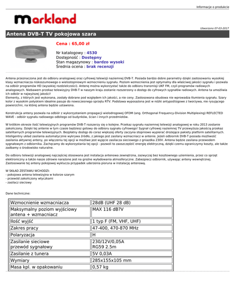 Informacje o produkcie Utworzono 07-03-2017 Antena DVB-T TV pokojowa szara Cena : 65,00 zł Nr katalogowy : 4530 Dostępność : Dostępny Stan magazynowy : bardzo wysoki Średnia ocena : brak recenzji Antena przeznaczona jest do odbioru analogowej oraz cyfrowej telewizji naziemnej DVB-T. Posiada bardzo dobre parametry dzięki zastosowaniu wysokiej klasy wzmacniacza niskoszumowego o wielostopniowym wzmocnieniu sygnału. Poziom wzmocnienia jest optymalny dla właściwej jakości sygnału i pozwala na odbiór programów HD (wysokiej rozdzielczości). Antenę można wykorzystać także do odbioru transmisji UKF FM, czyli programów radiowych analogowych. Niebawem przekaz telewizyjny DVB-T w naszym kraju zostanie rozszerzony o dostęp do cyfrowych sygnałów radiowych. Antena ta umożliwia ich odbiór w najwyższej jakości! Elementy, z których jest wykonana, zostały dobrane pod względem ich jakości, a nie ceny. Zastosowana obudowa nie wprowadza tłumienia sygnału. Szary kolor z wysokim połyskiem idealnie pasuje do nowoczesnego sprzętu RTV. Podstawa wyposażona jest w nóżki antypoślizgowe z tworzywa, nie rysującego powierzchni, na której antena będzie ustawiona. Konstrukcja anteny pozwala na odbiór z wykorzystaniem propagacji wielodrogowej OFDM (ang. Orthogonal Frequency-Division Multiplexing) REFLECTED WAVE - odbiór sygnału radiowego odbitego od budynków, ścian i innych przedmiotów. W krótkim okresie ilość telewizyjnych programów DVB-T rozszerzy się o kolejne. Przekaz sygnału naziemnej telewizji analogowej w roku 2013 zostanie zakończony. Dzięki tej antenie w tym czasie będziesz gotowy do odbioru sygnału cyfrowego! Sygnał cyfrowej naziemnej TV przewyższa jakością przekaz satelitarnych programów telewizyjnych. Bezpłatny dostęp do coraz większej oferty zaczyna stopniowo wypierać drożejące pakiety platform satelitarnych. Inteligentny układ zasilania automatycznie wykrywa źródło, z jakiego jest zasilany wzmacniacz w antenie. Jeżeli odbiornik DVB-T posiada możliwość zasilania aktywnej anteny, po włączeniu tej opcji w możliwe jest wyjęcie zasilacza sieciowego z gniazdka 230V. Antena będzie zasilana przewodem sygnałowym z odbiornika. Zachęcamy do wykorzystania tej opcji - pozwoli to zaoszczędzić energię elektryczną, dzięki czemu ograniczymy koszty, ale także zadbamy o środowisko naturalne. Do odbioru telewizji analogowej najczęściej stosowana jest instalacja antenowa zewnętrzna, zazwyczaj bez kosztownego uziemienia, przez co sprzęt elektroniczny a także nasze zdrowie narażone jest na groźne wyładowania atmosferyczne. Zabezpiecz odbiornik, używając anteny wewnętrznej. Zastosowanie tej anteny pokojowej wyklucza przypadek uderzenia pioruna w instalację antenową. W SKŁAD ZESTAWU WCHODZI: - pokojowa antena telewizyjna w kolorze szarym - przewód zakończony wtyczkami - zasilacz sieciowy Dane techniczne: Wzmocnienie wzmacniacza 28dB (UHF 28 dB) Maksymalny poziom wyjściowy antena + wzmacniacz MAX 116 dB?V Ilość wyjść 1 typ F (FM, VHF, UHF) Zakres pracy 47-400, 470-870 MHz Polaryzacja H Zasilanie sieciowe przewód sygnałowy 230/12V/0,05A RG59 2.5m Zasilanie z tunera 5V 0,03A Wymiary 285x155x105 mm Masa kpl. w opakowaniu 0,57 kg