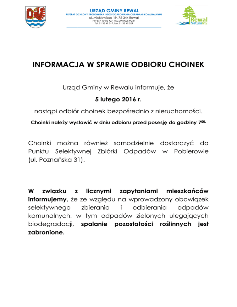 URZĄD GMINY REWAL REFERAT OCHRONY ŚRODOWISKA I GOSPODAROWANIA ODPADAMI KOMUNALNYMI ul. Mickiewicza 19, 72-344 Rewal NIP 857-10-02-427, REGON 000544237 Tel. 91 38 49 017, fax. 91 38 49 029 ____________________________________________________________________ INFORMACJA W SPRAWIE ODBIORU CHOINEK Urząd Gminy w Rewalu informuje, że 5 lutego 2016 r. nastąpi odbiór choinek bezpośrednio z nieruchomości. Choinki należy wystawić w dniu odbioru przed posesję do godziny 700. Choinki można również samodzielnie dostarczyć do Punktu Selektywnej Zbiórki Odpadów w Pobierowie (ul. Poznańska 31). W związku z licznymi zapytaniami mieszkańców informujemy, że ze względu na wprowadzony obowiązek selektywnego zbierania i odbierania odpadów komunalnych, w tym odpadów zielonych ulegających biodegradacji, spalanie pozostałości roślinnych jest zabronione.