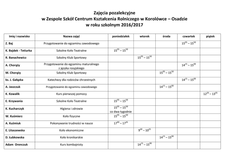 Zajęcia pozalekcyjne w Zespole Szkół Centrum Kształcenia Rolniczego w Korolówce – Osadzie w roku szkolnym 2016/2017 Imię i nazwisko Z. Baj Nazwa zajęć Szkolne Koło Teatralne R. Banachewicz Szkolny Klub Sportowy M. Chorąży ks. J. Gałązka wtorek środa 1505 – 1550 1415 – 1500 1505 – 1550 1415 – 1500 Katechezy dla rodziców chrzestnych 1415 – 1500 A. Jaszczuk Przygotowanie do egzaminu zawodowego K. Kowalik Kurs pierwszej pomocy E. Krzywania Szkolne Koło Teatralne K. Kucharczyk Higiena i zdrowie W. Kuśmierz Koło fizyczne 1505 – 1550 co dwa tygodnie 1505 – 1550 A. Kuźmiuk Pokonywanie trudności w nauce 1700 – 1745 Koło ekonomiczne D. Łubkowska Koło kronikarskie Adam Orenczuk Kurs kombajnisty piątek 1505 – 1550 Przygotowanie do egzaminu maturalnego z języka rosyjskiego Szkolny Klub Sportowy E. Litaszewska czwartek 1505 – 1550 Przygotowanie do egzaminu zawodowego K. Bajdek - Tetiurka A. Chorąży poniedziałek 1220 – 1305 1505 – 1550 940 – 1025 1415 – 1500 1415 – 1500 Imię i nazwisko Aneta Orenczuk M. Pajączkowski J. Pogonowska M. Poźniak D. Redde – Sawczuk K. Rejman E. Szkodzińska E. Torbicz A. Wodnicka J. Wołos K. Zasadzka K. Zdolski Nazwa zajęć Kształtowanie umiejętności radzenia sobie w trudnych sytuacjach Koło majsterkowicza poniedziałek wtorek 1505 – 1550 1730 – 1815 Kurs samoobrony Piłka halowa Koło historyczne 1505 – 1550 1505 – 1550 1430 – 1515 Przygotowanie do egzaminu maturalnego z języka angielskiego 1505 – 1550 Koło przyrodnicze 1310 - 1355 co 2 tygodnie Przygotowanie do egzaminu maturalnego z matematyki Koło polonistyczne 1415 – 1500 Zajęcia wyrównujące z matematyki 1415 – 1500 Zajęcia wyrównawcze oraz przygotowanie do OWIUR czwartek 1505 – 1550 Kulturalna sztuka odmawiania Przygotowanie do egzaminu na prawo jazdy kat. B i T środa 1415 – 1500 co 2 tygodnie 1415 – 1500 1505– 1550 piątek