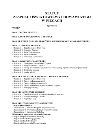 STATUT ZESPOŁU OŚWIATOWO-WYCHOWAWCZEGO W PIECACH Spis treści: WSTĘP Dział I. NAZWA ZESPOŁU Dział II. INNE INFORMACJE O ZESPOLE Dział III. CELE I ZADANIA PLACÓWEK WCHODZĄCYCH W SKŁAD ZESPOŁU Dział IV. ORGANY ZESPOŁU - Rozdział 1. Zagadnienia podstawowe - Rozdział 2. Dyrektor Zespołu - Rozdział 3. Rada Pedagogiczna - Rozdział 4. Rada Rodziców - Rozdział 5. Samorząd Uczniowski Dział V. ORGANIZACJA ZESPOŁU - Rozdział 1. Planowanie działalności Zespołu - Rozdział 2. Bezpieczeństwo i opieka - Rozdział 3. Formy prowadzenia działalności edukacyjnej, wychowawczej i opiekuńczej - Rozdział 4. Biblioteka szkolna - Rozdział 5. Nauka religii Dział VI. NAUCZYCIELE I INNI PRACOWNICY ZESPOŁU - Rozdział 1. Zagadnienia podstawowe - Rozdział 2. Zakres zadań nauczycieli - Rozdział 3. Zakres zadań wychowawcy - Rozdział 4. Zakres zadań innych pracowników Zespołu - Rozdział 5. Pedagog szkolny Dział VII. UCZNIOWIE ZESPOŁU - Rozdział 1. Zasady rekrutacji uczniów i obowiązek szkolny - Rozdział 2. Prawa i obowiązki ucznia - Rozdział 3. Nagrody i kary Dział VIII. POSTANOWIENIA KOŃCOWE Załączniki do Statutu: - Załącznik nr 1: Szkolny Program Wychowawczy - Załącznik nr 2: Wewnątrzszkolny System Oceniania - Załącznik nr 3: Ceremoniał Szkolny Regulaminy wydane na podstawie Statutu: - Regulamin pracy biblioteki szkolnej - Regulamin Rady Pedagogicznej - Regulamin Rady Rodziców - Regulamin Samorządu Uczniowskiego 1 WSTĘP §1 1. Ilekroć w dalszej treści Statutu jest mowa bez bliższego określenia o: 1) Zespole - należy przez to rozumieć Zespół Oświatowo-Wychowawczy w Piecach, 2) Przedszkolu - należy przez to rozumieć Samorządowe Przedszkole Publiczne w Zespole Oświatowo-Wychowawczym w Piecach, 3) Szkole Podstawowej - należy przez to rozumieć Publiczną Szkołę Podstawową w Zespole Oświatowo-Wychowawczym w Piecach, 4) Ustawie - należy przez to rozumieć ustawę z dnia 7 września 1991 r. o systemie oświaty (Dz. U. z 1996 r., Nr 67 , poz. 329 z późniejszymi zmianami), 5) Statucie - należy przez to rozumieć Statut Zespołu Oświatowo-Wychowawczego w Piecach, 6) Dyrektorze, Radzie Pedagogicznej, organach Samorządu Uczniowskiego i Radzie Rodziców - należy przez to rozumieć organy działające w Zespole, 7) uczniach i rodzicach - należy przez to rozumieć uczniów Zespołu oraz ich rodziców lub prawnych opiekunów, 8) wychowawcy - należy przez to rozumieć nauczyciela, którego szczególnej opiece wychowawczej powierzono jeden z oddziałów w Zespole, 9) organie prowadzącym Zespół - należy przez to rozumieć Gminę Kaliska, 10) organie sprawującym nadzór pedagogiczny nad Zespołem - należy przez to rozumieć Pomorskiego Kuratora Oświaty. 2. (uchylony) Dział I. NAZWA ZESPOŁU §2 1. W skład Zespołu w Piecach wchodzą: 1) Samorządowe Przedszkole Publiczne 2) Publiczna Szkoła Podstawowa im. Jana Pawła II. 2 2. Siedzibą Zespołu jest miejscowość Piece. Adres Zespołu : 83-261 Piece, ul. Kościelna 3. 3. Nazwa szkoły wchodzącej w skład Zespołu składa się z nazwy zespołu i nazwy tej szkoły. 4. Placówki wchodzące w skład Zespołu noszą nazwy : a) Zespół Oświatowo-Wychowawczy Samorządowe Przedszkole Publiczne b) Zespół Oświatowo-Wychowawczy Publiczna Szkoła Podstawowa im. Jana Pawła II 4a.Zespół używa pieczęci: a) wspólnej w sprawach dotyczących całej placówki, o treści: Zespół Oświatowo – Wychowawczy w Piecach 83-261 Piece ul. Kościelna 3, tel. 058 587 18 03 NIP 592-20-11-196, Reg. 220280118 b) odrębnej dla Szkoły Podstawowej w sprawach jej dotyczących, o treści: Publiczna Szkoła Podstawowa im. Jana Pawła II w Piecach 83-261 Piece ul. Kościelna 3 NIP 592-20-11-196, Reg. 19057639 c) odrębnej dla Samorządowego Przedszkola Samorządowego, o treści: Samorządowe Przedszkole Publiczne w Piecach 83-261 Piece ul. Kościelna 3, tel. 058 587 18 03 NIP 592-20-11-196, Reg. 220280271 5. Placówki wchodzące w skład Zespołu mogą posiadać oddzielne imiona. Imię nadaje organ prowadzący na wniosek Rady Pedagogicznej, Rady Rodziców i Samorządu Uczniowskiego. 6. (uchylony) 7. Do Zespołu uczęszczają dzieci i uczniowie zamieszkali na terenie sołectwa Piece. 8. Cykl kształcenia w szkole trwa 6 lat. 9. Przedszkole stwarza możliwość realizacji rocznego obowiązkowego przygotowania przedszkolnego dla dzieci 6-letnich w oddziale przedszkolnym oraz prowadzi działania opiekuńczo -wychowawczo-dydaktyczne dla dzieci w wieku od 3 do 5 lat. 3 Dział II. INNE INFORMACJE O ZESPOLE §3 1. Organem prowadzącym Zespół jest Gmina Kaliska, a organem sprawującym nadzór pedagogiczny – Pomorski Kurator Oświaty. §4 1. Do obwodu szkolnego Publicznej Szkoły Podstawowej w Piecach należą uczniowie zamieszkali na terenie sołectwa Piece. 2. Do Samorządowego Przedszkola Publicznego w Piecach przyjmowane są w pierwszej kolejności dzieci z terenu sołectwa Piece. 3. Czas trwania cyklu kształcenia w Zespole wynosi: 1) szkoła podstawowa - sześć lat; 2) przedszkole – obowiązkowo 6-latki, roczne przygotowanie przedszkolne. Dział III. CELE I ZADANIA PLACÓWEK WCHODZĄCYCH W SKŁAD ZESPOŁU §5 1. Przedszkole i Szkoła Podstawowa realizują cele i zadania określone w Ustawie oraz w przepisach wykonawczych wydanych na jej podstawie, koncentrując się na sprawowaniu funkcji wychowawczych, edukacyjnych i opiekuńczych. 2. Zespół stwarza warunki do wszechstronnego rozwoju dzieci, uwzględniając ich indywidualne zainteresowania i potrzeby, a także ich możliwości psychofizyczne. 3. Placówki wchodzące w skład Zespołu realizują swoje cele i zadania poprzez: prowadzenie obowiązkowych zajęć edukacyjnych w przedszkolu i w szkole, prowadzenie zajęć pozalekcyjnych ukierunkowanych zarówno na rozwój zainteresowań, jak też pomoc pedagogiczną, organizację nauczania integracyjnego lub indywidualnego stosownie do orzeczenia wydanego przez poradnię psychologiczno-pedagogiczną, umożliw