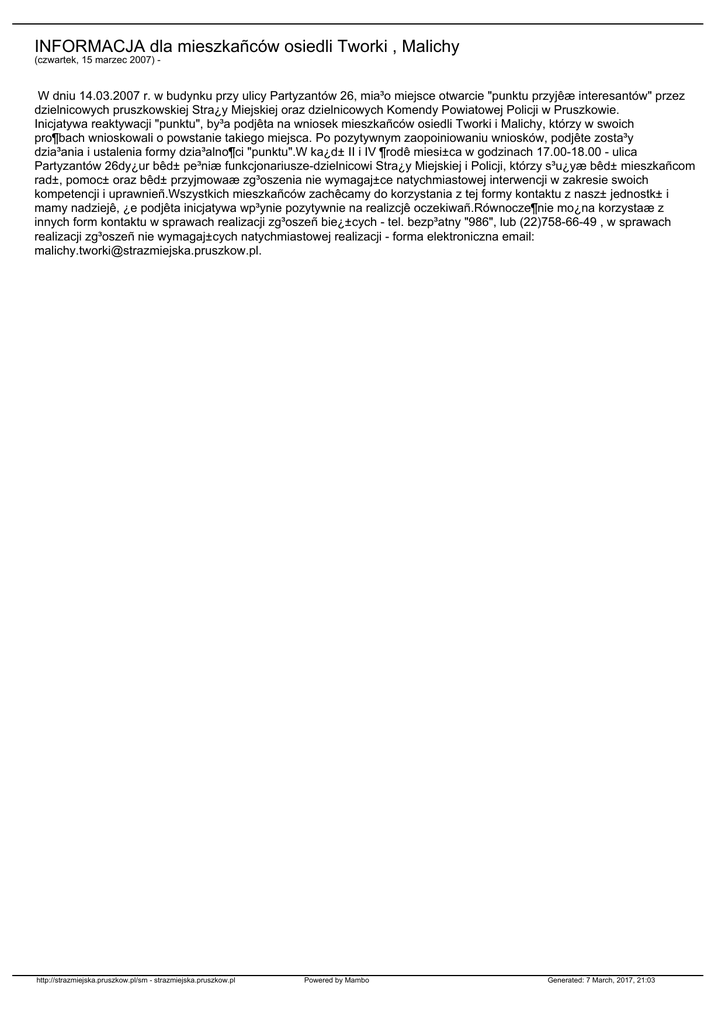 INFORMACJA dla mieszkañców osiedli Tworki , Malichy (czwartek, 15 marzec 2007) - W dniu 14.03.2007 r. w budynku przy ulicy Partyzantów 26, mia³o miejsce otwarcie "punktu przyjêæ interesantów" przez dzielnicowych pruszkowskiej Stra¿y Miejskiej oraz dzielnicowych Komendy Powiatowej Policji w Pruszkowie. Inicjatywa reaktywacji "punktu", by³a podjêta na wniosek mieszkañców osiedli Tworki i Malichy, którzy w swoich pro¶bach wnioskowali o powstanie takiego miejsca. Po pozytywnym zaopoiniowaniu wniosków, podjête zosta³y dzia³ania i ustalenia formy dzia³alno¶ci "punktu".W ka¿d± II i IV ¶rodê miesi±ca w godzinach 17.00-18.00 - ulica Partyzantów 26dy¿ur bêd± pe³niæ funkcjonariusze-dzielnicowi Stra¿y Miejskiej i Policji, którzy s³u¿yæ bêd± mieszkañcom rad±, pomoc± oraz bêd± przyjmowaæ zg³oszenia nie wymagaj±ce natychmiastowej interwencji w zakresie swoich kompetencji i uprawnieñ.Wszystkich mieszkañców zachêcamy do korzystania z tej formy kontaktu z nasz± jednostk± i mamy nadziejê, ¿e podjêta inicjatywa wp³ynie pozytywnie na realizcjê oczekiwañ.Równocze¶nie mo¿na korzystaæ z innych form kontaktu w sprawach realizacji zg³oszeñ bie¿±cych - tel. bezp³atny "986", lub (22)758-66-49 , w sprawach realizacji zg³oszeñ nie wymagaj±cych natychmiastowej realizacji - forma elektroniczna email: [email protected]. http://strazmiejska.pruszkow.pl/sm - strazmiejska.pruszkow.pl Powered by Mambo Generated: 7 March, 2017, 21:03