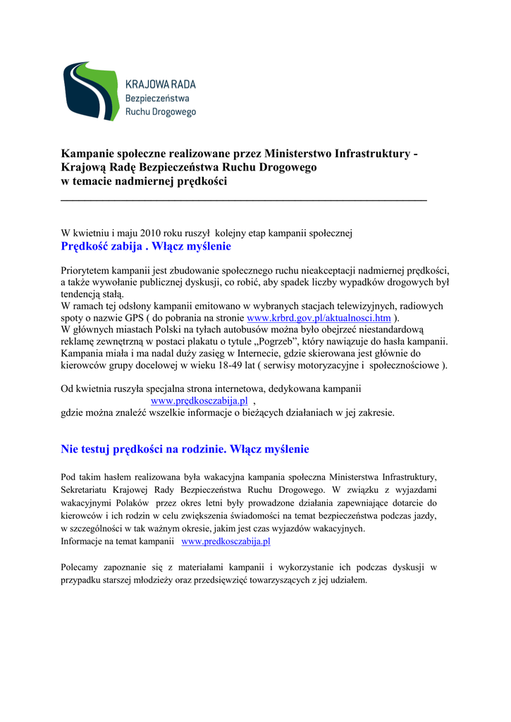 Kampanie społeczne realizowane przez Ministerstwo Infrastruktury Krajową Radę Bezpieczeństwa Ruchu Drogowego w temacie nadmiernej prędkości _____________________________________________________________ W kwietniu i maju 2010 roku ruszył kolejny etap kampanii społecznej Prędkość zabija . Włącz myślenie Priorytetem kampanii jest zbudowanie społecznego ruchu nieakceptacji nadmiernej prędkości, a także wywołanie publicznej dyskusji, co robić, aby spadek liczby wypadków drogowych był tendencją stałą. W ramach tej odsłony kampanii emitowano w wybranych stacjach telewizyjnych, radiowych spoty o nazwie GPS ( do pobrania na stronie www.krbrd.gov.pl/aktualnosci.htm ). W głównych miastach Polski na tyłach autobusów można było obejrzeć niestandardową reklamę zewnętrzną w postaci plakatu o tytule „Pogrzeb”, który nawiązuje do hasła kampanii. Kampania miała i ma nadal duży zasięg w Internecie, gdzie skierowana jest głównie do kierowców grupy docelowej w wieku 18-49 lat ( serwisy motoryzacyjne i społecznościowe ). Od kwietnia ruszyła specjalna strona internetowa, dedykowana kampanii www.prędkosczabija.pl , gdzie można znaleźć wszelkie informacje o bieżących działaniach w jej zakresie. Nie testuj prędkości na rodzinie. Włącz myślenie Pod takim hasłem realizowana była wakacyjna kampania społeczna Ministerstwa Infrastruktury, Sekretariatu Krajowej Rady Bezpieczeństwa Ruchu Drogowego. W związku z wyjazdami wakacyjnymi Polaków przez okres letni były prowadzone działania zapewniające dotarcie do kierowców i ich rodzin w celu zwiększenia świadomości na temat bezpieczeństwa podczas jazdy, w szczególności w tak ważnym okresie, jakim jest czas wyjazdów wakacyjnych. Informacje na temat kampanii www.predkosczabija.pl Polecamy zapoznanie się z materiałami kampanii i wykorzystanie ich podczas dyskusji w przypadku starszej młodzieży oraz przedsięwzięć towarzyszących z jej udziałem.