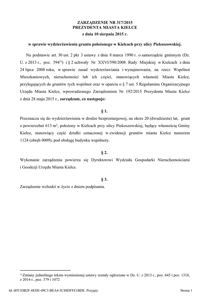 ZARZĄDZENIE NR 317/2015 PREZYDENTA MIASTA KIELCE z dnia 10 sierpnia 2015 r. w sprawie wydzierżawienia gruntu położonego w Kielcach przy ulicy Piekoszowskiej. Na podstawie art. 30 ust. 2 pkt 3 ustawy z dnia 8 marca 1990 r. o samorządzie gminnym (Dz. U. z 2013 r., poz. 5941)) i § 2 uchwały Nr XXVI/590/2008 Rady Miejskiej w Kielcach z dnia 24 lipca 2008 roku, w sprawie zasad wydzierżawiania i wynajmowania, na rzecz Wspólnot Mieszkaniowych, nieruchomości lub ich części, stanowiących własność Miasta Kielce, przylegających do gruntów tych wspólnot oraz w oparciu o § 7 ust. 5 Regulaminu Organizacyjnego Urzędu Miasta Kielce, wprowadzonego Zarządzeniem Nr 192/2015 Prezydenta Miasta Kielce z dnia 28 maja 2015 r., zarządzam, co następuje: § 1. Przeznacza się do wydzierżawienia w drodze bezprzetargowej, na okres 20 (dwudziestu) lat, grunt o powierzchni 613 m2, położony w Kielcach przy ulicy Piekoszowskiej, będący własnością Gminy Kielce, stanowiący część działki oznaczonej w ewidencji gruntów miasta Kielce numerem 1124 (obręb 0009), pod obsługę budynku wspólnoty. § 2. Wykonanie zarządzenia powierza się Dyrektorowi Wydziału Gospodarki Nieruchomościami i Geodezji Urzędu Miasta Kielce. § 3. Zarządzenie wchodzi w życie z dniem podpisania. Zmiany jednolitego tekstu wymienionej ustawy zostały ogłoszone w Dz. U. z 2013 r., poz. 645 i poz. 1318, z 2014 r., poz. 379 i 1072 1) Id: 6FE1DB2F-8EDE-49C3-BEA4-5C88DFFE1BDE. Przyjęty Strona 1 Uzasadnienie Grunt położony w Kielcach przy ulicy Piekoszowskiej, oznaczony w ewidencji gruntów m. Kielce numerem działki 1124 ( obręb 0009 ), stanowi własność Gminy Kielce. Do Prezydenta Miasta Kielce wpłynął wniosek Wspólnoty Mieszkaniowej Nieruchomości Piekoszowska 52A, w sprawie wydzierżawienia część w/w działki, zlokalizowanej wokół jej budynku, zgodnie z wolą wyrażoną w formie uchwały, na okres 20 lat. W myśl § 2 uchwały Nr XXVI/590/2008 Rady Miejskiej w Kielcach z dnia 24 lipca 2008 roku, w sprawie zasad wydzierżawiania i wynajmowania, na rzecz Wspólnot Mieszkaniowych, nieruchomości lub ich części, stanowiących własność Gminy Kielce, przylegających do gruntów tych wspólnot, Prezydent Miasta Kielce może wydzierżawić lub wynająć, na rzecz wspólnot mieszkaniowych, na czas oznaczony dłuższy niż 3 lata lub na czas nieoznaczony, nieruchomości stanowiące własność Gminy Kielce, przyległe do gruntów wspólnot, jeżeli przy wyodrębnieniu własności lokali w budynkach tych wspólnot, wydzielono dla nich działki nie spełniające wymogów działki budowlanej. Wydzierżawienie lub wynajęcie nieruchomości na rzecz wspólnot następuje w drodze bezprzetargowej. Zgodnie z art. 4 ustawy z dnia 21 sierpnia 1997 roku o gospodarce nieruchomościami, pod pojęciem działki budowlanej należy rozumieć zabudowaną działkę, której wielkość, cechy geometryczne, dostęp do drogi publicznej oraz urządzeń infrastruktury technicznej umożliwiają prawidłowe i racjonalne korzystanie z budynków i urządzeń położonych na tej działce. Z uwagi na to, że działka oznaczona w ewidencji gruntów m. Kielce numerem 1128 ( obręb 0009 ), na której stoi budynek Wspólnoty Mieszkaniowej Nieruchomości Piekoszowska 52A, nie spełnia, w rozumieniu w/w przepisu, wymogów działki budowlanej, można w oparciu o uchwałę Nr XXVI/590/2008 Rady Miejskiej w Kielcach z dnia 24 lipca 2008 roku, wydzierżawić wspólnocie dodatkowy teren do obsługi jej budynku. Spełnione są wymogi określone w art. 30 ust. 2 pkt 3 ustawy z dnia 8 marca 1990 r. o samorządzie gminnym oraz w § 2 uchwały Nr XXVI/590/2008 Rady Miejskiej w Kielcach z dnia 24 lipca 2008 roku, w sprawie zasad wydzierżawiania i wynajmowania, na rzecz Wspólnot Mieszkaniowych, nieruchomości lub ich części, stanowiących własność Miasta Kielce, przylegających do gruntów tych wspólnot, a zatem zasadne jest podjęcie niniejszego zarządzenia. Id: 6FE1DB2F-8EDE-49C3-BEA4-5C88DFFE1BDE. Przyjęty Strona 2 ZAŁĄCZNIK DO ZARZĄDZENIA NR 317 / 2015 PREZYDENTA MIASTA KIELCE Z DNIA 10 SIERPNIA 2015 ROKU W SPRAWIE WYDZIERŻAWIENIA GRUNTU POŁOŻONEGO W KIELCACH PRZY ULICY PIEKOSZOWSKIEJ Id: 6FE1DB2F-8EDE-49C3-BEA4-5C88DFFE1BDE. Przyjęty Strona 3