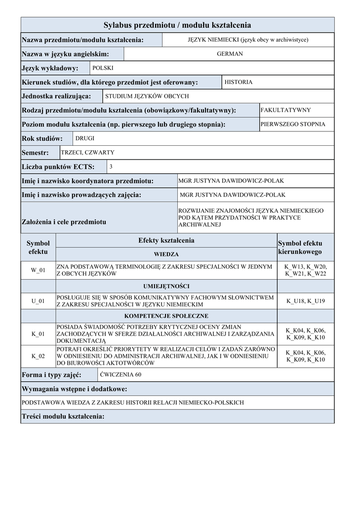 Sylabus przedmiotu / modułu kształcenia Nazwa przedmiotu/modułu kształcenia: JĘZYK NIEMIECKI (język obcy w archiwistyce) Nazwa w języku angielskim: Język wykładowy: GERMAN POLSKI Kierunek studiów, dla którego przedmiot jest oferowany: Jednostka realizująca: HISTORIA STUDIUM JĘZYKÓW OBCYCH Rodzaj przedmiotu/modułu kształcenia (obowiązkowy/fakultatywny): FAKULTATYWNY Poziom modułu kształcenia (np. pierwszego lub drugiego stopnia): PIERWSZEGO STOPNIA Rok studiów: Semestr: DRUGI TRZECI, CZWARTY Liczba punktów ECTS: 3 Imię i nazwisko koordynatora przedmiotu: MGR JUSTYNA DAWIDOWICZ-POLAK Imię i nazwisko prowadzących zajęcia: MGR JUSTYNA DAWIDOWICZ-POLAK Założenia i cele przedmiotu ROZWIJANIE ZNAJOMOŚCI JĘZYKA NIEMIECKIEGO POD KĄTEM PRZYDATNOŚCI W PRAKTYCE ARCHIWALNEJ Efekty kształcenia Symbol efektu W_01 WIEDZA ZNA PODSTAWOWĄ TERMINOLOGIĘ Z ZAKRESU SPECJALNOŚCI W JEDNYM Z OBCYCH JĘZYKÓW Symbol efektu kierunkowego K_W13, K_W20, K_W21, K_W22 UMIEJĘTNOŚCI U_01 POSŁUGUJE SIĘ W SPOSÓB KOMUNIKATYWNY FACHOWYM SŁOWNICTWEM Z ZAKRESU SPECJALNOŚCI W JĘZYKU NIEMIECKIM K_U18, K_U19 KOMPETENCJE SPOŁECZNE K_01 K_02 POSIADA ŚWIADOMOŚĆ POTRZEBY KRYTYCZNEJ OCENY ZMIAN ZACHODZĄCYCH W SFERZE DZIAŁALNOŚCI ARCHIWALNEJ I ZARZĄDZANIA DOKUMENTACJĄ POTRAFI OKREŚLIĆ PRIORYTETY W REALIZACJI CELÓW I ZADAŃ ZARÓWNO W ODNIESIENIU DO ADMINISTRACJI ARCHIWALNEJ, JAK I W ODNIESIENIU DO BIUROWOŚCI AKTOTWÓRCÓW Forma i typy zajęć: ĆWICZENIA 60 Wymagania wstępne i dodatkowe: PODSTAWOWA WIEDZA Z ZAKRESU HISTORII RELACJI NIEMIECKO-POLSKICH Treści modułu kształcenia: K_K04, K_K06, K_K09, K_K10 K_K04, K_K06, K_K09, K_K10 JĘZYK NIEMIECKI JAKO PRZEDMIOT AKADEMICKI NA KIERUNKU HISTORIA Z UWZGLĘDNIENIEM SPECJALISTYCZNEGO SŁOWNICTWA Z ZAKRESU WYBRANEJ SPECJALNOŚCI PODSTAWY TRANSLATORYKI TEKSTY ŹRÓDŁOWE (ZABÓR PRUSKI I AUSTRIACKI) TEKSTY ŹRÓDŁOWE (I WOJNA ŚWIATOWA) TEKSTY ŹRÓDŁOWE (II WOJNA ŚWIATOWA) KSIĄŻKA PISANA GOTYKIEM TEKSTY NAUKOWE W JĘZYKU NIEMIECKIM TEKSTY POPULARNONAUKOWE W JĘZYKU NIEMIECKIM TEKSTY PRASOWE W JĘZYKU NIEMIECKIM TEKSTY NA STRONACH INTERNETOWYCH NIEMIECKICH INSTYTUCJI KULTURY TEKSTY W JĘZYKU NIEMIECKIM NA STRONACH POLSKICH INSTYTUCJI KULTURY Literatura podstawowa: BĘZA S., NOWE REPETYTORIUM Z GRAMATYKI JĘZYKA NIEMIECKIEGO, WARSZAWA (WYDANIA NAJNOWSZE). MATERIAŁY DOSTARCZONE PRZEZ PROWADZĄCEGO ZAJĘCIA. SŁOWNIKI ZAWIERAJĄCE MINIMUM 60 TYSIĘCY SŁÓW. STRONY INTERNETOWE WYBRANYCH NIEMIECKICH INSTYTUCJI KULTURY ORAZ WYBRANE NIEMIECKOJĘZYCZNE WERSJE STRON INTERNETOWYCH POLSKICH INSTYTUCJI KULTURY Literatura dodatkowa: BURDA U., DICKEL A., OLPIŃSKA-SZKIEŁKO M., EUROPÄISCHE UNION. BURDA U., DICKEL A., OLPIŃSKA-SZKIEŁKO M., STAATSORDNUNG UND POLITISCHES SYSTEM SPRACHARBEITSBUCH. KAFKA W., MAJKIEWICZ A., ZIEMSKA J., ZUBIK K., AKTUELLES ZUR WIRTSCHAFT UND POLITIK POLENS. KOŁSUT S., POLITIK UND RECHT AUF DEUTSCH. NIEMIECKOJĘZYCZNA WERSJA TŁUMACZENIA KONSTYTUCJI RP Z 1997 R. ZAMIESZCZONA NA STRONIE INTERNETOWEJ SEJMU RP. PRASA NIEMIECKOJĘZYCZNA, NP. DIE ZEIT, DIE WELT, SÜDDEUTSCHE ZEITUNG. WAJDA D., WILAMOWSKA M., DEUTSCH LERNEN MIT ORIGINALTEXTEN. WSKAZANE PRZEZ PROWADZĄCEGO SŁOWNIKI SPECJALISTYCZNE I TEMATYCZNE. Planowane formy/działania/metody dydaktyczne: ANALIZA RÓŻNORODNYCH TEKSTÓW ŹRÓDŁOWYCH, NAUKOWYCH I POPULARNONAUKOWYCH, ZE SZCZEGÓLNYM UWZGLĘDNIENIEM MATERIAŁÓW DOTYCZĄCYCH HISTORII POLSKI I POLAKÓW ORAZ RELACJI POLSKO-NIEMIECKICH NA PRZESTRZENI DZIEJÓW. PRACA ZE SŁOWNIKAMI NIEMIECKO-POLSKIMI. ZASTOSOWANIE TECHNIKI KOMPUTEROWEJ NA ZAJĘCIACH DOTYCZĄCYCH STRON INTERNETOWYCH WYBRANYCH NIEMIECKICH INSTYTUCJI KULTURY ORAZ WYBRANYCH NIEMIECKOJĘZYCZNYCH WERSJI STRON INTERNETOWYCH POLSKICH INSTYTUCJI KULTURY Sposoby weryfikacji efektów kształcenia osiąganych przez studenta: WERYFIKACJA EFEKTÓW NA PODSTAWIE: ODPOWIEDZI, AKTYWNOŚĆ, KOLOKWIA I PRACE DOMOWE Forma i sposób zaliczenia (wraz z kryteriami oceniania) OCENA PRZEDMIOTU STANOWI ŚREDNIĄ ARYTMETYCZNĄ OCEN CZĄSTKOWYCH. KAŻDY STUDENT MUSI PRZETŁUMACZYĆ SAMODZIELNIE FRAGMENTY TEKSTÓW W JĘZYKU NIEMIECKIM LUB/I PRZYGOTOWAĆ KRÓTKĄ WYPOWIEDŹ W JĘZYKU FACHOWYM – FRAGMENTY TEKSTU JAK I TEMAT WYPOWIEDZI PO UZGODNIENIU Z PROWADZĄCYM ZAJĘCIA. KAŻDY STUDENT ZOBOWIĄZANY JEST DO PRZYNOSZENIA NA ZAJĘCIA PODRĘCZNEGO SŁOWNIKA NIEMIECKO-POLSKIEGO. Bilans punktów ECTS: Forma aktywności studenta Średnia liczba godzin Udział w ćwiczeniach 60 Samodzielna praca studenta 15 Sumaryczne obciążenie studenta 75 3 Punkty ECTS za przedmiot