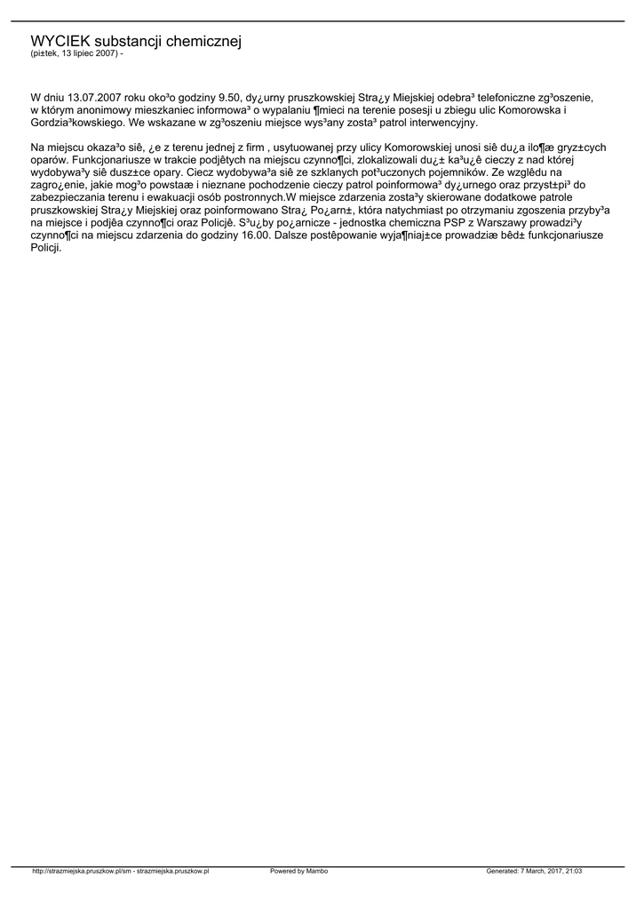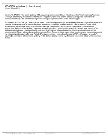 WYCIEK substancji chemicznej (pi±tek, 13 lipiec 2007) - W dniu 13.07.2007 roku oko³o godziny 9.50, dy¿urny pruszkowskiej Stra¿y Miejskiej odebra³ telefoniczne zg³oszenie, w którym anonimowy mieszkaniec informowa³ o wypalaniu ¶mieci na terenie posesji u zbiegu ulic Komorowska i Gordzia³kowskiego. We wskazane w zg³oszeniu miejsce wys³any zosta³ patrol interwencyjny. Na miejscu okaza³o siê, ¿e z terenu jednej z firm , usytuowanej przy ulicy Komorowskiej unosi siê du¿a ilo¶æ gryz±cych oparów. Funkcjonariusze w trakcie podjêtych na miejscu czynno¶ci, zlokalizowali du¿± ka³u¿ê cieczy z nad której wydobywa³y siê dusz±ce opary. Ciecz wydobywa³a siê ze szklanych pot³uczonych pojemników. Ze wzglêdu na zagro¿enie, jakie mog³o powstaæ i nieznane pochodzenie cieczy patrol poinformowa³ dy¿urnego oraz przyst±pi³ do zabezpieczania terenu i ewakuacji osób postronnych.W miejsce zdarzenia zosta³y skierowane dodatkowe patrole pruszkowskiej Stra¿y Miejskiej oraz poinformowano Stra¿ Po¿arn±, która natychmiast po otrzymaniu zgoszenia przyby³a na miejsce i podjêa czynno¶ci oraz Policjê. S³u¿by po¿arnicze - jednostka chemiczna PSP z Warszawy prowadzi³y czynno¶ci na miejscu zdarzenia do godziny 16.00. Dalsze postêpowanie wyja¶niaj±ce prowadziæ bêd± funkcjonariusze Policji. http://strazmiejska.pruszkow.pl/sm - strazmiejska.pruszkow.pl Powered by Mambo Generated: 7 March, 2017, 21:03