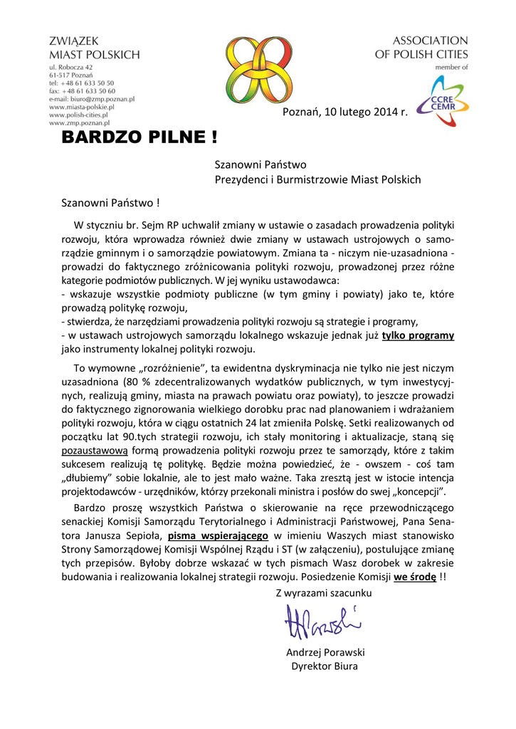 Poznań, 10 lutego 2014 r. BARDZO PILNE ! Szanowni Państwo Prezydenci i Burmistrzowie Miast Polskich Szanowni Państwo ! W styczniu br. Sejm RP uchwalił zmiany w ustawie o zasadach prowadzenia polityki rozwoju, która wprowadza również dwie zmiany w ustawach ustrojowych o samorządzie gminnym i o samorządzie powiatowym. Zmiana ta - niczym nie-uzasadniona prowadzi do faktycznego zróżnicowania polityki rozwoju, prowadzonej przez różne kategorie podmiotów publicznych. W jej wyniku ustawodawca: - wskazuje wszystkie podmioty publiczne (w tym gminy i powiaty) jako te, które prowadzą politykę rozwoju, - stwierdza, że narzędziami prowadzenia polityki rozwoju są strategie i programy, - w ustawach ustrojowych samorządu lokalnego wskazuje jednak już tylko programy jako instrumenty lokalnej polityki rozwoju. To wymowne „rozróżnienie”, ta ewidentna dyskryminacja nie tylko nie jest niczym uzasadniona (80 % zdecentralizowanych wydatków publicznych, w tym inwestycyjnych, realizują gminy, miasta na prawach powiatu oraz powiaty), to jeszcze prowadzi do faktycznego zignorowania wielkiego dorobku prac nad planowaniem i wdrażaniem polityki rozwoju, która w ciągu ostatnich 24 lat zmieniła Polskę. Setki realizowanych od początku lat 90.tych strategii rozwoju, ich stały monitoring i aktualizacje, staną się pozaustawową formą prowadzenia polityki rozwoju przez te samorządy, które z takim sukcesem realizują tę politykę. Będzie można powiedzieć, że - owszem - coś tam „dłubiemy” sobie lokalnie, ale to jest mało ważne. Taka zresztą jest w istocie intencja projektodawców - urzędników, którzy przekonali ministra i posłów do swej „koncepcji”. Bardzo proszę wszystkich Państwa o skierowanie na ręce przewodniczącego senackiej Komisji Samorządu Terytorialnego i Administracji Państwowej, Pana Senatora Janusza Sepioła, pisma wspierającego w imieniu Waszych miast stanowisko Strony Samorządowej Komisji Wspólnej Rządu i ST (w załączeniu), postulujące zmianę tych przepisów. Byłoby dobrze wskazać w tych pismach Wasz dorobek w zakresie budowania i realizowania lokalnej strategii rozwoju. Posiedzenie Komisji we środę !! Z wyrazami szacunku Andrzej Porawski Dyrektor Biura