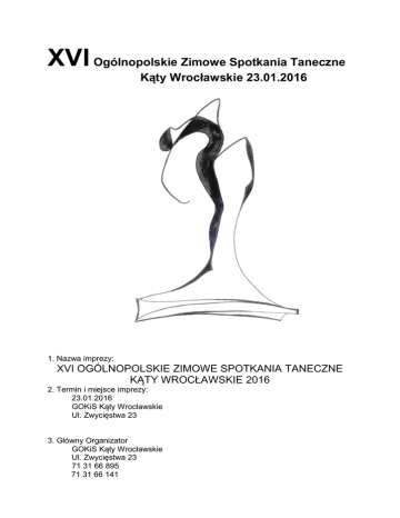 XVI Ogólnopolskie Zimowe Spotkania Taneczne Kąty Wrocławskie 23.01.2016 1. Nazwa imprezy: XVI OGÓLNOPOLSKIE ZIMOWE SPOTKANIA TANECZNE KĄTY WROCŁAWSKIE 2016 2. Termin i miejsce imprezy: 23.01.2016 GOKiS Kąty Wrocławskie Ul. Zwycięstwa 23 3. Główny Organizator GOKiS Kąty Wrocławskie Ul. Zwycięstwa 23 71 31 66 895 71 31 66 141 4. Cele imprezy - inspirowanie, rozwijanie i popieranie zainteresowań tanecznych wśród dzieci i młodzieży - doskonalenie umiejętności tanecznych uczestników - integracja międzynarodowego i ogólnopolskiego środowiska tanecznego - rozwój kultury tanecznej wśród dzieci, młodzieży i dorosłych - popularyzacja tańca jako forma aktywnego spędzania wolnego czasu - rozwijanie wrażliwości estetycznej dzieci i młodzieży - konfrontacja dorobku artystycznego zespołów i tancerzy - konfrontacja i poznanie różnych form tańca - promocja Miasta i Gminy Kąty Wrocławskie 5. Zasady uczestnictwa W turnieju mogą brać udział dzieci i młodzież należące do zespołów działających przy ośrodkach kultury, szkołach, przedszkolach, stowarzyszeniach, fundacjach. Ze względu na ograniczoną liczbę miejsc organizator zastrzega sobie prawo do odrzucenia zgłoszenia przesłanego po terminie, a w przypadku dużej liczby zgłoszeń decyduje kolejność nadsyłania zgłoszeń. Zgłoszenia należy przesłać na adres [email protected] Kategorie taneczne: Solo Show Duet Show Formacje Show Układ z Choreografem - w układzie, w ciekawy sposób bierze udział choreograf, najważniejszy jest pomysł solo - Me against the music - muzyka organizatora (różnorodna typu: rock and rol, techno, klasyczna, elektroniczna, pop, disco polo...) - zasady oceny - jak tancerz zmierzy się z nietypowa muzyką (kreatywność) - tylko 30 osób NOWA KATEGORIA!!!! Family Dance - to jest kategoria, gdzie przynajmniej jeden rodzic ze swoim dzieckiem tańczy do dowolnej muzyki, oczywiście może być dwóch rodziców i więcej dzieci :) Kategorie wiekowe: do 11 lat 12-15 lat 15 - 30 lat NOWA KATEGORIA wiekowa!!!! powyżej 30 lat w kategorii Układ z Choreografem nie obowiązują kategorie wiekowe O przynależności do danej kategorii wiekowej decyduje rok urodzenia najstarszego uczestnika. Jeden uczestnik może brać udział w kilku kategoriach tanecznych ale tylko jeden raz w danej kategorii. Duety mogą być mieszane lub tej samej płci. Formacja to min. 3 osoby. Dozwolone są rekwizyty, jednak uczestnik ma obowiązek zabrania ich ze sceny po ukończeniu własnej prezentacji. Rekwizyty nie powinny zaśmiecać sceny, a także zagrażać życiu lub zdrowiu oraz spełniać zasady określone przepisami BHP. Czas prezentacji: Solo: eliminacje 1:00 min; finał od 1:00 - 3:00 min Duety: od 1:30 - 4:00 min Formacje: od 2:00 – 5:00 min Family Dance - od 1:00 - 3:00 min Układ z choreografem: od 2:00 – 5:00 min Me against the music - eliminacje 1 min. 1 utwór (losowo), finał 1,5 min. 2 utwory (losowo) Zgłoszenia będą przyjmowane za pomocą formularza zgłoszenia. Formularz zostanie wysłany jako załącznik w wiadomości e-mail oraz będzie można pobrać go na stronie www.gokis.katywroclawskie.com. Bez formularza lub nie kompletnie wypełnionego prezentacje nie będą przyjmowane na przegląd. Każdy uczestnik ma obowiązek posiadania aktualnej legitymacji szkolnej lub innego dowodu tożsamości, potwierdzającego datę urodzenia uczestnika. Koszty dojazdu, ubezpieczenia i noclegów pokrywają uczestnicy (uczestnicy powinni być ubezpieczeni przez swoich opiekunów na czas trwania festiwalu). Organizator nie ponosi odpowiedzialności za urazy, kontuzje i zdarzenia losowe podczas Festiwalu. Organizator nie odpowiada za rzeczy pozostawione w szatni. Uczestnicy powinni mieć odpowiednią liczbę opiekunów (zgodnie z przepisami MEN). Dokładny czasowy program festiwalu zostanie ogłoszony po zamknięciu listy startowej. Muzykę trzeba dostarczyć drogą mailową (format mp3 - nazwa pliku to nazwisko solisty, nazwiska duetu lub nazwa zespołu z kategorią wiekową – np. k nowak do 11 lub maska po 15 ) do 05.01.2016 r. na adres [email protected] . Na turniej proszę zabrać dodatkową kopię muzyki na pendrive (plik mp3) lub na nośniku zew. typu mp3 lub iPod. Muzykę trzeba sprawdzić przed turniejem u akustyka. Nie dostarczenie muzyki drogą mailową dyskwalifikuje prezentację z przeglądu. Warunki techniczne: scena o wymiarach 12 m. szerokość i 8 metrów głębokość, kulisy boczne i tylne Do wykorzystania oświetlenie sceniczne: - 16 punktów świetlnych – kolory – biały, czerwony, niebieski, zielony - stroboskop 6. Opłata startowa Opłata startowa wynosi 20 zł od każdego uczestnika bez względu w ilu kategoriach bierze udział. Opłatę należy przelać najpóźniej do 11.01.2016 na konto. Kto spóźni się z wpłatą nie otrzyma pamiątkowej koszulki. N I E M O Ż N A Z A P Ł A C I Ć N A M I E J S C U ,tylko przelewem !!!!! 26 9574 0005 2001 0000 0680 0001 Gminny Ośrodek Kultury i Sportu w Kątach Wrocławskich ul. Zwycięstwa 23 55-080 Kąty Wrocławskie NIP 896-12-03-814 W dniu imprezy należy przedstawić dowód wpłaty opłaty startowej. 7. Kryteria oceny JURY oceniać będzie : - wartość techniczną układu (dobór i trudności elementów oraz ich oryginalność, wykonanie) - wartość artystyczną układu ( dobór i spójność muzyki z choreografią , kostiumy itd) - maksymalne wykorzystanie środków technicznych i artystycznych do stworzenia kompozycji scenicznej, - ogólne wrażenie artystyczne. 8. Nagrody Każdy uczestnik i zespół dostanie dyplom uczestnictwa oraz pamiątkową koszulkę(proszę podać ilość i rozmiar koszulek – junior M,L,XL, senior S, M, L, XL, XXL – bez podania rozmiaru koszulka będzie w rozmiarze M) W każdej kategorii Jury może przyznać nagrodę główną oraz wyróżnienia. Ramowy program spotkań 7:00 – 9:45 – próby parkietu 10:00 – I Blok Taneczny solo do 11 lat - eliminacje duety do 11 lat formacje do