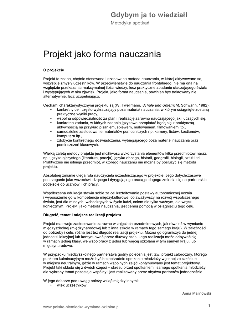 Gdybym ja to wiedział! Metodyka spotkań Projekt jako forma nauczania O projekcie Projekt to znana, chętnie stosowana i szanowana metoda nauczania, w której aktywowane są wszystkie zmysły uczestników. W przeciwieństwie do nauczania frontalnego, nie ma ona na względzie przekazania maksymalnej ilości wiedzy, lecz praktyczne zbadanie otaczającego świata i występujących w nim zjawisk. Projekt, jako forma nauczania, powinien być traktowany nie alternatywnie, lecz uzupełniająco. Cechami charakterystycznymi projektu są (W. Twellmann, Schule und Unterricht, Schwann, 1982): • konkretny cel, często wykraczający poza materiał nauczania, w którym osiągnięte zostaną praktyczne wyniki pracy, • wspólna odpowiedzialność za plan i realizację zarówno nauczającego jak i uczących się, • konkretne zadania, w których zadania językowe przeplatać będą się z praktyczną aktywnością na przykład pisaniem, śpiewem, malowaniem, filmowaniem itp., • samodzielne zastosowanie materiałów pomocniczych np. kamery, listów, kostiumów, komputera itp., • zdobycie konkretnego doświadczenia, wybiegającego poza materiał nauczania oraz pomieszczeń klasowych. Wielką zaletą metody projektu jest możliwość wykorzystania elementów kilku przedmiotów naraz, np.: języka ojczystego (literatura, poezja), języka obcego, historii, geografii, biologii, sztuki itd. Praktycznie nie istnieje przedmiot, w którego nauczaniu nie można by posłużyć się metodą projektu. Absolutnej zmianie ulega rola nauczyciela uczestniczącego w projekcie. Jego dotychczasowe postrzeganie jako wszechwiedzącego i dyrygującego pracą pedagoga zmienia się na partnerskie podejście do uczniów i ich pracy. Współczesna edukacja stawia sobie za cel kształtowanie postawy autonomicznej ucznia i wyposażenie go w kompetencje międzykulturowe, co zważywszy na rozwój współczesnego świata, jest dla młodych, wchodzących w życie ludzi, celem nie tylko ważnym, ale wręcz koniecznym. Projekt, jako metoda nauczania, jest cenną pomocą w osiągnięciu tego celu. Długość, temat i miejsce realizacji projektu Projekt ma swoje zastosowanie zarówno w zajęciach przedmiotowych, jak również w wymianie międzyszkolnej (międzynarodowej lub z inną szkołą w ramach tego samego kraju). W zależności od potrzeby i celu, różna jest też długość realizacji projektu. Można go ograniczyć do jednej jednostki lekcyjnej lub kontynuować przez dłuższy czas. Jego realizacja może odbywać się w ramach jednej klasy, we współpracy z jedną lub więcej szkołami w tym samym kraju, lub międzynarodowo. W przypadku międzyszkolnego partnerstwa godny polecenia jest tzw. projekt całoroczny, którego punktem kulminacyjnym może być bezpośrednie spotkanie młodzieży w jednej ze szkół lub w miejscu neutralnym, gdzie w ramach wspólnych zajęć kontynuowany jest temat projektowy. Projekt taki składa się z dwóch części – okresu przed spotkaniem i samego spotkania młodzieży, ale wybrany temat pozostaje wspólny i jest realizowany przez obydwu partnerów jednocześnie. W jego doborze pod uwagę należy wziąć między innymi: • wiek uczestników, Anna Malinowski www.polsko-niemiecka-wymiana-szkolna.pl 1 Gdybym ja to wiedział! Metodyka spotkań • • • • • profil szkoły, zainteresowania uczestników, propozycje wypływające od uczniów, możliwości organizacyjne i materialne szkoły, możliwość współpracy z nauczycielami innych przedmiotów. Wdzięcznym i często wybieranym do realizacji projektem, jest połączenie języka obcego, literatury i historii. Na płaszczyźnie polsko-niemieckiej istnieje wiele wspólnych aspektów, które zostały bogato opracowane i mogą posłużyć jako przedmiot i narzędzie pracy. Istnieje jednak jeszcze wiele dziedzin, które czekają na zgłębienie, na przykład w ramach projektu, który planujemy. Nasza wspólna praca stanie się bogatsza i ciekawsza, jeżeli sięgniemy po muzykę, teatr, pantomimę, film, czy malarstwo. Każda z wymienionych form niesie dodatkowe możliwości niewerbalnego porozumienia międzykulturowego, co nie jest bez znaczenia w komunikowaniu obcojęzycznym i przełamywaniu barier językowych. Oprócz tematu, bardzo ważne jest wspólne ustalenie programu projektu na cały rok. Pamiętajmy, że im większą damy uczniom możliwość aktywnego udziału w przygotowaniu projektu, tym lepsze osiągniemy wyniki w jego realizacji. Choć pierwsza część projektu całorocznego realizowana jest na odległość, to towarzyszy mu intensywna wymiana spostrzeżeń, wyników i dokumentacji - tak między uczniami, jak i opiekunami obydwu szkół. Na tym etapie uczniowie nie tylko pracują nad wspólnie wybranym tematem, lecz również poznają swoich partnerów poprzez listy, maile, filmy, zdjęcia, sprawozdania itp. Okres ten jest przygotowaniem do drugiego etapu projektu, czyli do bezpośredniego poznania się lub ponownego spotkania uczestników. Szkoły współpracujące ze sobą w ramach partnerstwa szkolnego, często praktykują spotkania młodzieży na zasadzie wizyt i rewizyt. Młodzież przyjmowana jest w takim przypadku przez swoich gospodarzy prywatnie w domu, czego wielką zaletą jest naturalny kontakt i intensywna wymiana międzykulturowa. Przed międzynarodowymi spotkaniami młodzieży stoją również otworem Międzynarodowe Domy Spotkań Młodzieży, na przykład w Krzyżowej, Mikuszewie, Weimarze czy Bad Marienberg. Nic jednak nie stoi na przeszkodzie, aby zorganizować wymianę w miejscu dowolnie wybranym, zapewniającym odpowiednie warunki spotkania. Etapy projektu Bez względu na długość trwania projektu, każdy z nich składa się z trzech podstawowych etapów: 1. przygotowania, 2. realizacji, 3. ewaluacji. Na etapie przygotowania ważne jest uwzględnienie wspomnianego już tematu, wspólne przygotowanie programu, dobór uczestników projektu, partnerów oraz potrzebnych warunków do przeprowadzenia przedsi