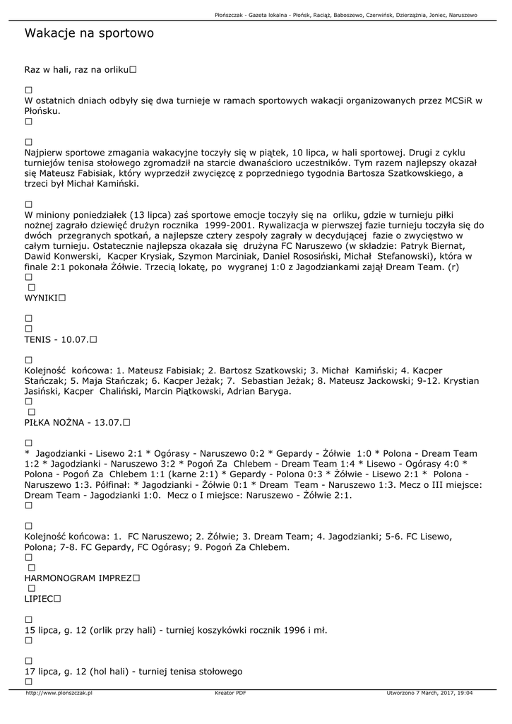 Płońszczak - Gazeta lokalna - Płońsk, Raciąż, Baboszewo, Czerwińsk, Dzierzążnia, Joniec, Naruszewo Wakacje na sportowo Raz w hali, raz na orliku W ostatnich dniach odbyły się dwa turnieje w ramach sportowych wakacji organizowanych przez MCSiR w Płońsku. Najpierw sportowe zmagania wakacyjne toczyły się w piątek, 10 lipca, w hali sportowej. Drugi z cyklu turniejów tenisa stołowego zgromadził na starcie dwanaścioro uczestników. Tym razem najlepszy okazał się Mateusz Fabisiak, który wyprzedził zwycięzcę z poprzedniego tygodnia Bartosza Szatkowskiego, a trzeci był Michał Kamiński. W miniony poniedziałek (13 lipca) zaś sportowe emocje toczyły się na orliku, gdzie w turnieju piłki nożnej zagrało dziewięć drużyn rocznika 1999-2001. Rywalizacja w pierwszej fazie turnieju toczyła się do dwóch przegranych spotkań, a najlepsze cztery zespoły zagrały w decydującej fazie o zwycięstwo w całym turnieju. Ostatecznie najlepsza okazała się drużyna FC Naruszewo (w składzie: Patryk Biernat, Dawid Konwerski, Kacper Krysiak, Szymon Marciniak, Daniel Rososiński, Michał Stefanowski), która w finale 2:1 pokonała Żółwie. Trzecią lokatę, po wygranej 1:0 z Jagodziankami zajął Dream Team. (r) WYNIKI TENIS - 10.07. Kolejność końcowa: 1. Mateusz Fabisiak; 2. Bartosz Szatkowski; 3. Michał Kamiński; 4. Kacper Stańczak; 5. Maja Stańczak; 6. Kacper Jeżak; 7. Sebastian Jeżak; 8. Mateusz Jackowski; 9-12. Krystian Jasiński, Kacper Chaliński, Marcin Piątkowski, Adrian Baryga. PIŁKA NOŻNA - 13.07. * Jagodzianki - Lisewo 2:1 * Ogórasy - Naruszewo 0:2 * Gepardy - Żółwie 1:0 * Polona - Dream Team 1:2 * Jagodzianki - Naruszewo 3:2 * Pogoń Za Chlebem - Dream Team 1:4 * Lisewo - Ogórasy 4:0 * Polona - Pogoń Za Chlebem 1:1 (karne 2:1) * Gepardy - Polona 0:3 * Żółwie - Lisewo 2:1 * Polona Naruszewo 1:3. Półfinał: * Jagodzianki - Żółwie 0:1 * Dream Team - Naruszewo 1:3. Mecz o III miejsce: Dream Team - Jagodzianki 1:0. Mecz o I miejsce: Naruszewo - Żółwie 2:1. Kolejność końcowa: 1. FC Naruszewo; 2. Żółwie; 3. Dream Team; 4. Jagodzianki; 5-6. FC Lisewo, Polona; 7-8. FC Gepardy, FC Ogórasy; 9. Pogoń Za Chlebem. HARMONOGRAM IMPREZ LIPIEC 15 lipca, g. 12 (orlik przy hali) - turniej koszykówki rocznik 1996 i mł. 17 lipca, g. 12 (hol hali) - turniej tenisa stołowego http://www.plonszczak.pl Kreator PDF Utworzono 7 March, 2017, 19:04 Płońszczak - Gazeta lokalna - Płońsk, Raciąż, Baboszewo, Czerwińsk, Dzierzążnia, Joniec, Naruszewo 20 lipca, g. 12 (orlik przy hali) - turniej piłki nożnej rocznik 1996-1998 22 lipca, g. 12 (orlik przy hali) - turniej siatkówki rocznik 2002-2004 24 lipca, g. 12 (hol hali) - turniej tenisa stołowego 27 lipca, g. 12 (orlik przy hali) - turniej piłki nożnej rocznik 2002-2003 29 lipca, g. 12 (orlik przy hali) - turniej koszykówki rocznik 1999-2001 31 lipca, g. 11 (pływalnia) - zawody pływackie r. 2002-2004 31 lipca, g. 12 (hol hali) - turniej tenisa stołowego SIERPIEŃ 3 sierpnia, g. 12 (orlik przy hali) - turniej piłki nożnej rocznik 2004 i mł. 5 sierpnia, g. 12 (orlik przy hali) - turniej siatkówki rocznik 2002 i mł. 7 sierpnia, g. 12 (hol hali) - turniej tenisa stołowego 10 sierpnia, g. 12 (orlik przy hali) - turniej piłki nożnej rocznik 1996-1998 12 sierpnia, g. 12 (orlik przy hali) - turniej tenisa ziemnego 14 sierpnia, g. 12 (hol hali) - turniej tenisa stołowego 17 sierpnia, g. 12 (orlik przy hali) - turniej piłki nożnej rocznik 1999-2001 19 sierpnia, g. 12 (orlik przy hali) - turniej koszykówki rocznik 1996-1998 http://www.plonszczak.pl Kreator PDF Utworzono 7 March, 2017, 19:04 Płońszczak - Gazeta lokalna - Płońsk, Raciąż, Baboszewo, Czerwińsk, Dzierzążnia, Joniec, Naruszewo 21 sierpnia, g. 12 (hol hali) - turniej tenisa stołowego 24 sierpnia, g. 12 (orlik przy hali) - turniej piłki nożnej rocznik 2002-2003 26 sierpnia, g. 12 (orlik przy hali) - turniej siatkówki rocznik 2001 i st. 28 sierpnia, g. 11 (pływalnia) - zawody pływackie rocznik 2001 i st. 28 sierpnia, g. 12 (hol hali) - finałowy turniej tenisa stołowego 31 sierpnia, g. 12 (orlik przy hali) - turniej piłki nożnej rocznik 1996-1998 foto: Łukasz Wielechowski Więcej zdjęć w Galerii http://www.plonszczak.pl Kreator PDF Utworzono 7 March, 2017, 19:04