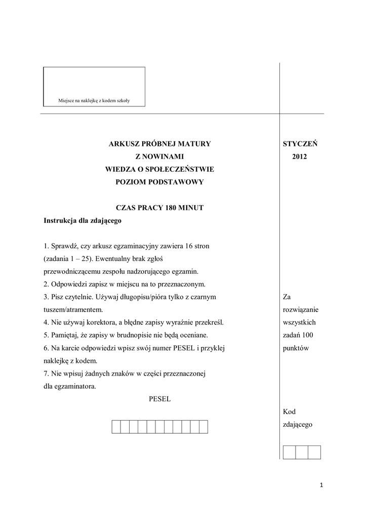 Miejsce na naklejkę z kodem szkoły ARKUSZ PRÓBNEJ MATURY STYCZEŃ Z NOWINAMI 2012 WIEDZA O SPOŁECZEŃSTWIE POZIOM PODSTAWOWY CZAS PRACY 180 MINUT Instrukcja dla zdającego 1. Sprawdź, czy arkusz egzaminacyjny zawiera 16 stron (zadania 1 – 25). Ewentualny brak zgłoś przewodniczącemu zespołu nadzorującego egzamin. 2. Odpowiedzi zapisz w miejscu na to przeznaczonym. 3. Pisz czytelnie. Używaj długopisu/pióra tylko z czarnym Za tuszem/atramentem. rozwiązanie 4. Nie używaj korektora, a błędne zapisy wyraźnie przekreśl. wszystkich 5. Pamiętaj, że zapisy w brudnopisie nie będą oceniane. zadań 100 6. Na karcie odpowiedzi wpisz swój numer PESEL i przyklej punktów naklejkę z kodem. 7. Nie wpisuj żadnych znaków w części przeznaczonej dla egzaminatora. PESEL Kod zdającego 1 W zadaniach 1 – 6 zaznacz prawidłowe odpowiedzi: Zadanie 1. 1 p. Przyjęcie do rodziny na mocy orzeczenia sądu osoby małoletniej to: a) kuratela b) adopcja c) powinowactwo Zadanie 2. 1 p. Ideologia segregacji rasowej to: a) szowinizm b) rasizm c) apartheid Zadanie 3. 1 p. Sejm uchwala ustawę większością: a) zwykłą b) kwalifikowaną c) bezwzględną Zadanie 4. 1 p. Jesień Ludów miała miejsce w roku: a) 1988 b) 1989 c) 1990 Zadanie 5. 1 p. Postępowanie sądowe w Polsce jest: a) jednoinstancyjne b) dwuinstancyjne c) trójinstancyjne Zadanie 6. 1 p. Hamas jest organizacją terrorystów: a) Lewackich b) Islamskich c) Etnicznych 2 W zadaniach 7 – 12 wpisz „P’ dla stwierdzeń prawdziwych i „F” dla stwierdzeń fałszywych. Zadanie 7. 3 p. Mniejszości narodowe i etniczne w RP W Polsce do mniejszości etnicznych zaliczamy Ślązaków. Najliczniejszą mniejszością narodową w Polsce współczesnej są Żydzi Akcja „Wisła” objęła Ukraińców i Łemków Zadanie 8. 3 p. Grupy społeczne Grupy trwałe funkcjonują w obrębie jednego pokolenia Nie każdy może być członkiem grupy ekskluzywnej Ze względu na typ więzi grupy dzielimy na formalne i nieformalne Zadanie 9. 3 p. Formy państw i modele ustrojowe: Związek państw, mających prawo do secesji to federacja. W modelu parlamentarno-gabinetowym większość władzy wykonawczej jest skupiona w ręku prezydenta. Model parlamentarno-komitetowy występuje w Szwajcarii. Zadanie 10. 3 p. Demokracja: Zasada, iż naród w państwie demokratycznym ma władzę najwyższą to zasada suwerenności narodu. Prawa mniejszości w demokracji nie muszą być szanowane. Twórcą koncepcji trójpodziału władz był Robert Owen. 3 Zadanie 11. 3 p. Prawa człowieka: Prawo do pracy jest prawem I generacji. Nikt nie może zostać pozbawiony swojej własności bez adekwatnego odszkodowania. Wielokrotnych morderców nie obowiązuje zasada humanitarnego prawa traktowania więźniów. Zadanie 12. 3 p. Instytucje Unii Europejskiej: Rada Europejska jest najwyższym organem UE. Funkcję rządu w UE pełni Trybunał Audytorów UE. Rzecznik Praw Obywatelskich UE to Ombudsman. Zadanie 13. 4 p. Do podanych przykładów instytucji społecznych dopisz ich typ. • bank ............................................... • sklep ............................................ • biblioteka • dom kultury ......................................... • partia polityczna ......................................... • związek zawodowy • stowarzyszenie Zadanie 14. 6 p. Uzupełnij tabelę dopisując do podanych województw siedziby wojewodów i wojewódzkich władz samorządowych: Tabela 1. Nazwa województwa Siedziba wojewody Siedziba wojewódzkich władz samorządowych Kujawsko – pomorskie Warmińsko – mazurskie 4 Lubuskie Podlaskie Pomorskie Świętokrzyskie Zadanie 15. 5 p. Na podstawie danych z poniższego wykresu odpowiedz na pytania: Wykres 1. Przestępstwa w wybranych województwach w 2003r. 113000 117000 120000 dolnośląskie 119000 mazowieckie wielkopolskie pomorskie /Rocznik Statystyczny, 2003/ a) Posegreguj województwa według liczby popełnionych przestępstw, zaczynając od największej liczby. ………………………………………………………………………………………… b) Wymień 2 czynniki powodujące znaczny odsetek przestępczości w Polsce. ………………………………………………………………………………………… c) Zaproponuj 2 środki zaradcze, które pozwoliłyby zmniejszyć wskaźniki przestępczości. ………………………………………………………………………………………… 5 Zadanie 16. 3 p. Spośród podanych nazwisk wypisz nazwiska Prezesów Rady Ministrów RP w latach 1989 – 2007. Kazimierz Marcinkiewicz, Aleksander Kwaśniewski, Tadeusz Mazowiecki, Jacek Kuroń, Bronisław Geremek, Lech Kaczyński, Jan Krzysztof Bielecki, Hanna Gronkiewicz- Waltz, Andrzej Lepper …………………………………………………………………………………………….. Zadanie 17. 6 p. Na podstawie tekstu i wiedzy pozaźródłowej odpowiedz na pytania: Tekst 1. „Prezydent Białorusi Aleksandr Łukaszenka często powtarza, że buduje „wielosektorową politykę zagraniczną”. Ale przyjaciół poza granicami białoruski przywódca ma tyle, co kot napłakał: przyjaźni się nie z tymi, z którymi chciałby się zaprzyjaźnić, tylko z tymi, którzy łaskawie chcą się przyjaźnić z nim. Wielowektorowa polityka w praktyce oznacza, że sojusznik Rosji i wschodni partner Unii Europejskiej gotów jest przyjaźnić się ze wszystkimi pod warunkiem, że istnieje choćby mała nadzieja na finansowe korzyści. Zachód nie akceptuje „ostatniego dyktatora Europy”. Konflikt z Polską na tle traktowania Związku Polaków na Białorusi rozkręca się coraz bardziej. Warszawa oskarża reżim Łukaszenki o represje. Wygląda na to, że Zachód mógłby przyjaźnić się z Łukaszenką jedynie w kontekście zaostrzających się stosunków z Rosją – na zasadzie „wróg mojego wroga jest moim przyjacielem.” Moskwa demonstruje, że choć jest gotowa prz