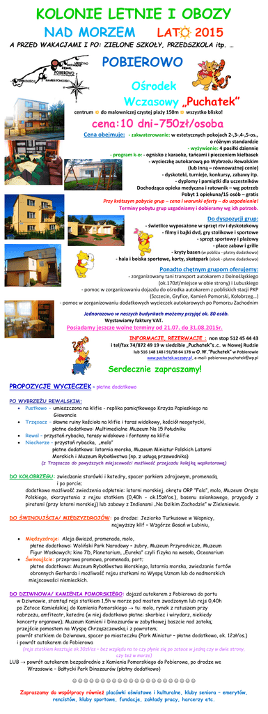 KOLONIE LETNIE I OBOZY NAD MORZEM LATO 2015 A PRZED WAKACJAMI I PO: ZIELONE SZKOŁY, PRZEDSZKOLA itp. … POBIEROWO Ośrodek Wczasowy „Puchatek” centrum < do malowniczej czystej plaży 150m wszystko blisko! cena:10 dni-750zł/osoba Cena obejmuje: - zakwaterowanie: w estetycznych pokojach 2-,3-,4-,5-os., o różnym standardzie - wyżywienie: 4 posiłki dziennie - program k-o: - ognisko z karaoke, tańcami i pieczeniem kiełbasek - wycieczkę autokarową po Wybrzeżu Rewalskim (lub inną – równoważnej cenie) - dyskoteki, turnieje, konkursy, zabawy itp. - dyplomy i pamiątki dla uczestników Dochodząca opieka medyczna i ratownik – wg potrzeb Pobyt 1 opiekuna/15 osób – gratis Przy krótszym pobycie grup – cena i warunki oferty – do uzgodnienia! Terminy pobytu grup uzgadniamy i dobieramy wg ich potrzeb. Do dyspozycji grup: - świetlice wyposażone w sprzęt rtv i dyskotekowy - filmy i bajki dvd, gry stolikowe i sportowe - sprzęt sportowy i plażowy - place zabaw i grille - kryty basen (w pobliżu - płatny dodatkowo) - hala i boiska sportowe, korty, skatepark (obok - płatne dodatkowo) Ponadto chętnym grupom oferujemy: - zorganizowany tani transport autokarem z Dolnośląskiego (ok.170zł/miejsce w obie strony) i Lubuskiego - pomoc w zorganizowaniu dojazdu do ośrodka autokarem z pobliskich stacji PKP (Szczecin, Gryfice, Kamień Pomorski, Kołobrzeg…) - pomoc w zorganizowaniu dodatkowych wycieczek autokarowych po Pomorzu Zachodnim Jednorazowo w naszych budynkach możemy przyjąć ok. 80 osób. Wystawiamy faktury VAT. Posiadamy jeszcze wolne terminy od 21.07. do 31.08.2015r. INFORMACJE, REZERWACJE : non stop 512 45 44 43 i tel/fax 74/872 49 19 w siedzibie „Puchatek”s.c. w Nowej Rudzie lub 516 148 148 i 91/38 64 178 w O.W.”Puchatek” w Pobierowie www.puchatek.wczasy.pl, e-mail: [email protected] Serdecznie zapraszamy! PROPOZYCJE WYCIECZEK – płatne dodatkowo PO WYBRZEŻU REWALSKIM: Pustkowo – umieszczona na klifie - replika pamiątkowego Krzyża Papieskiego na Giewoncie Trzęsacz – sławne ruiny kościoła na klifie i taras widokowy, kościół neogotycki, płatne dodatkowo: Multimedialne Muzeum Na 15 Południku Rewal – przystań rybacka, tarasy widokowe i fontanny na klifie Niechorze – przystań rybacka, „molo” płatne dodatkowo: latarnia morska, Muzeum Miniatur Polskich Latarni Morskich i Muzeum Rybołówstwa (np. z usługą przewodnika) (z Trzęsacza do powyższych miejscowości możliwość przejazdu kolejką wąskotorową) DO KOŁOBRZEGU: zwiedzanie starówki i katedry, spacer parkiem zdrojowym, promenadą i po porcie; dodatkowo możliwość zwiedzenia odpłatnie: latarni morskiej, okrętu ORP ”Fala”, molo, Muzeum Oręża Polskiego, skorzystania z rejsu statkiem (0,40h - ok.15zł/os.), basenu solankowego, przygody z piratami (przy latarni morskiej) lub zabawy z Indianami „Na Dzikim Zachodzie” w Zieleniewie. DO ŚWINOUJŚCIA/ MIĘDZYZDROJÓW: po drodze: Jeziorko Turkusowe w Wapnicy, najwyższy klif – Wzgórze Gosań w Lubiniu, Międzyzdroje: Aleja Gwiazd, promenada, molo, płatne dodatkowo: Woliński Park Narodowy – żubry, Muzeum Przyrodnicze, Muzeum Figur Woskowych; kino 7D, Planetarium, „Eureka” czyli fizyka na wesoło, Oceanarium Świnoujście: przeprawa promowa, promenada, port; płatne dodatkowo: Muzeum Rybołówstwa Morskiego, latarnia morska, zwiedzanie fortów obronnych Gerharda i możliwość rejsu statkami na Wyspę Uznam lub do nadmorskich miejscowości niemieckich. DO DZIWNOWA/ KAMIENIA POMORSKIEGO: dojazd autokarem z Pobierowa do portu w Dziwnowie, stamtąd rejs statkiem 1,5h w morze pod mostem zwodzonym lub rejs 0,40h po Zatoce Kamieńskiej do Kamienia Pomorskiego tu: molo, rynek z ratuszem przy nabrzeżu, amfiteatr, katedra (w niej dodatkowo płatne: skarbiec i wirydarz, niekiedy koncerty organowe); Muzeum Kamieni i Dinozaurów w zabytkowej baszcie nad zatoką; przejście pomostem na Wyspę Chrząszczewską i z powrotem; powrót statkiem do Dziwnowa, spacer po miasteczku (Park Miniatur – płatne dodatkowo, ok. 12zł/os.) i powrót autokarem do Pobierowa (rejs statkiem kosztuje ok.30zł/os – bez względu na to czy płynie się po zatoce w jedną czy w dwie strony, czy też w morze) LUB powrót autokarem bezpośrednio z Kamienia Pomorskiego do Pobierowa, po drodze we Wrzosowie – Bałtycki Park Dinozaurów (płatny dodatkowo) Zapraszamy do współpracy również placówki oświatowe i kulturalne, kluby seniora – emerytów, rencistów, kluby sportowe, fundacje, zakłady pracy, harcerzy etc.